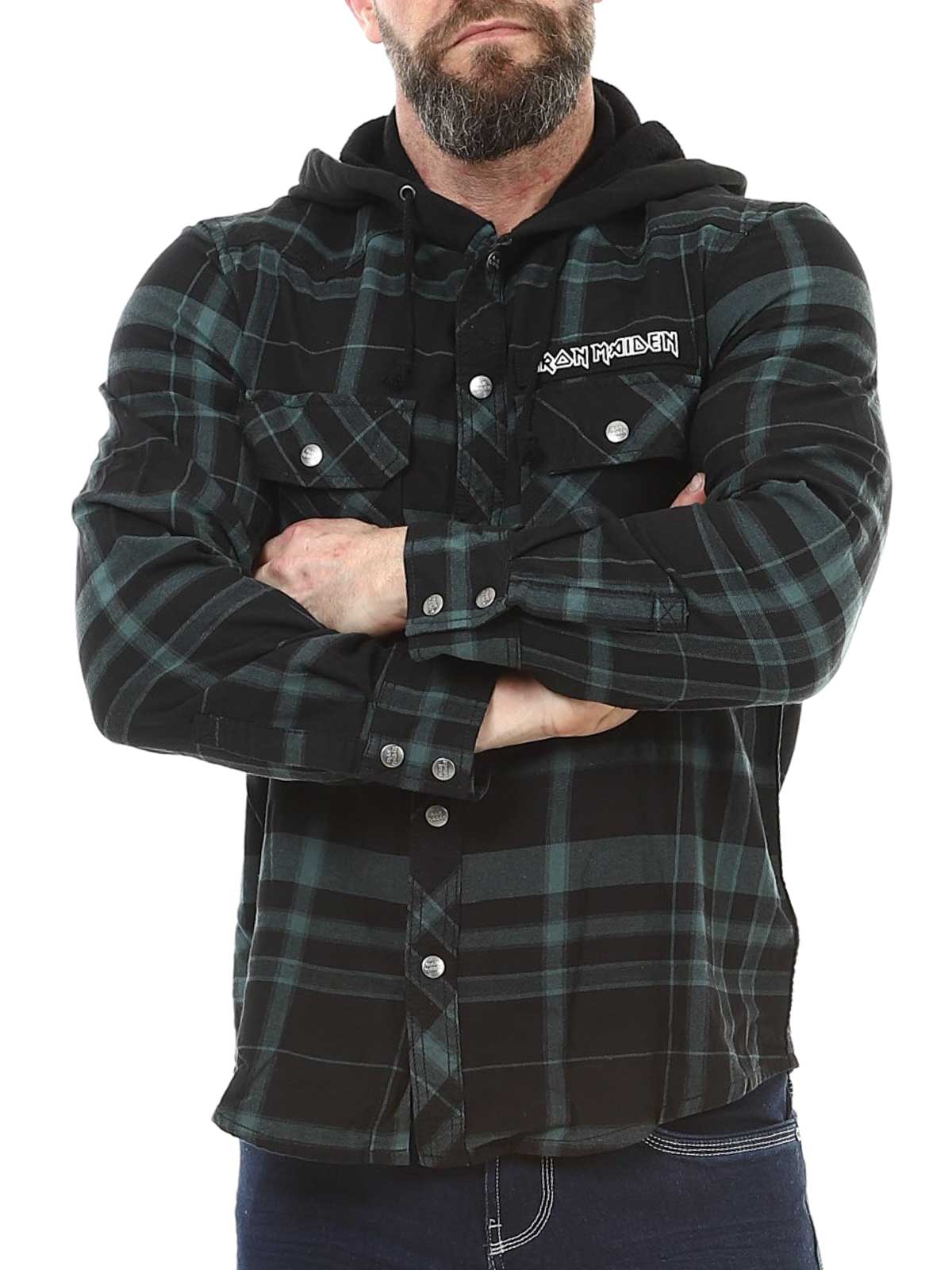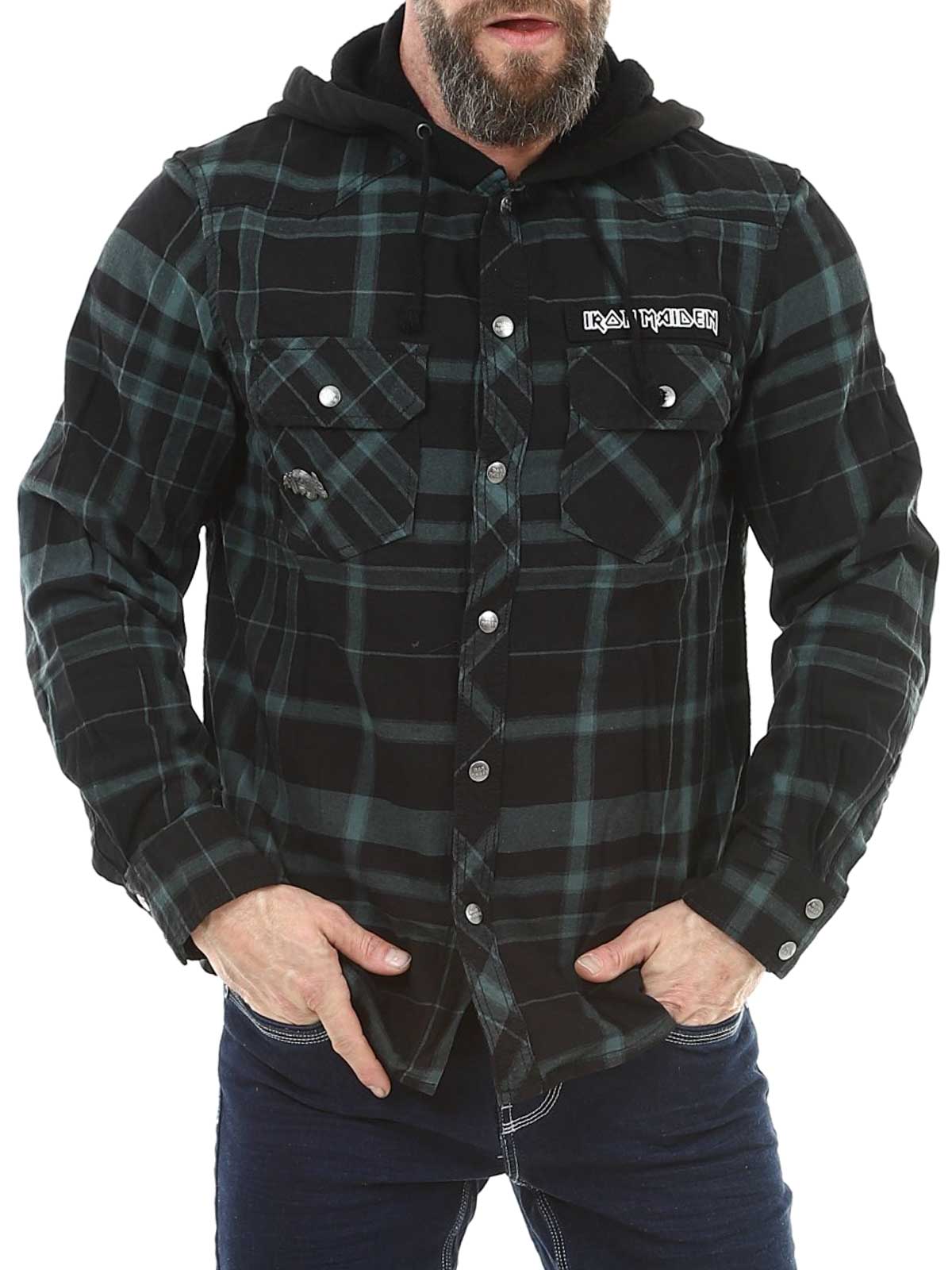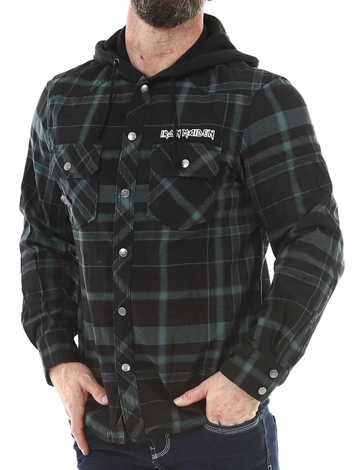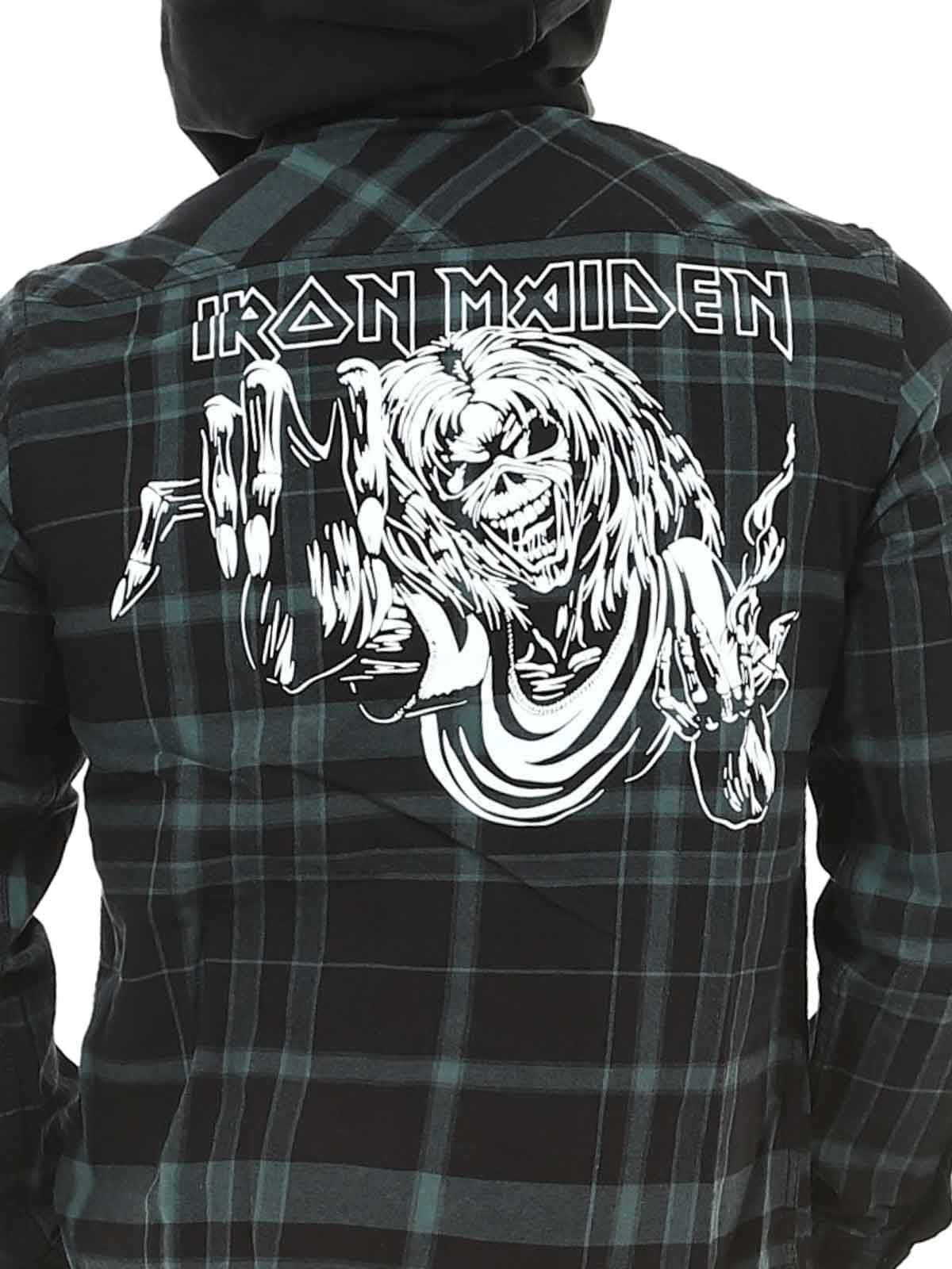 Kombinationen av klassisk overshirt‑skjorta och hoodie ger en unik och rockig look. Designad med logoknappar, en Iron Maiden‑patch framtill, en stor Iron Maiden‑print på ryggen och en avtagbar metalpin. Den har en rejäl huva, reglerbara ärmslut och knappstängning.