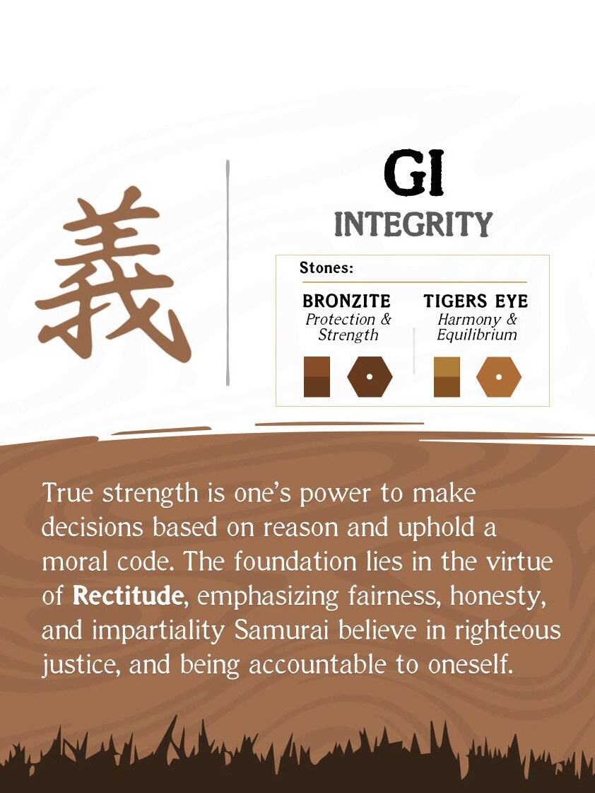 GI: INTEGRITY - Den sanna styrkan ligger i förmågan att fatta beslut baserade på förnuft och att följa en moralisk kod. Grunden vilar på dygden Rättfärdighet, som betonar rättvisa, ärlighet och opartiskhet. Samurajen tror på rättvis rättskipning och att ta ansvar inför sig själv.