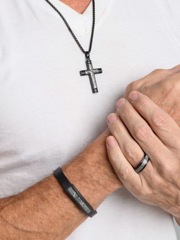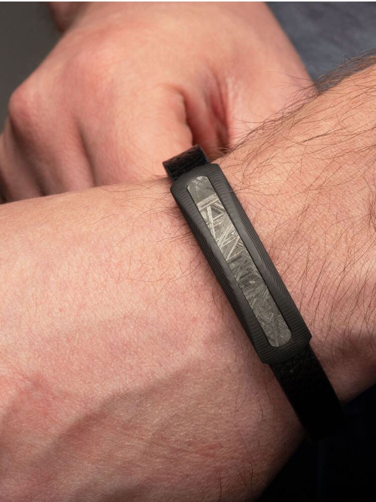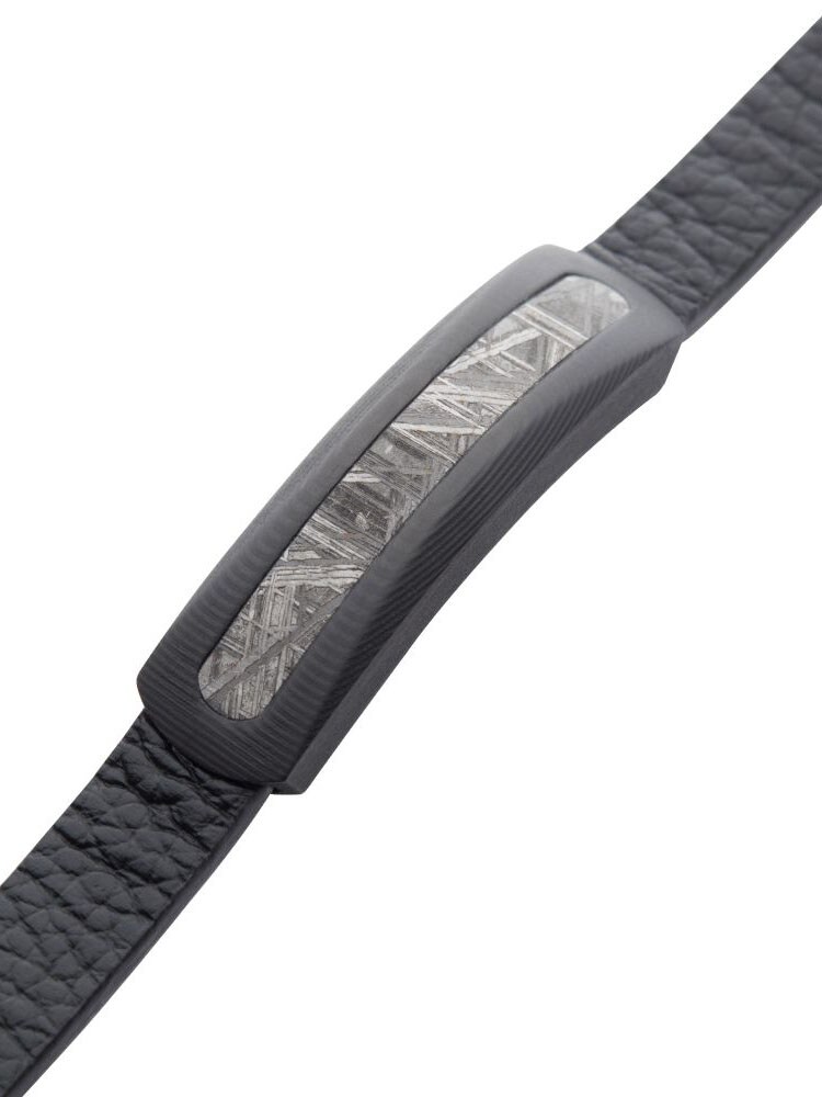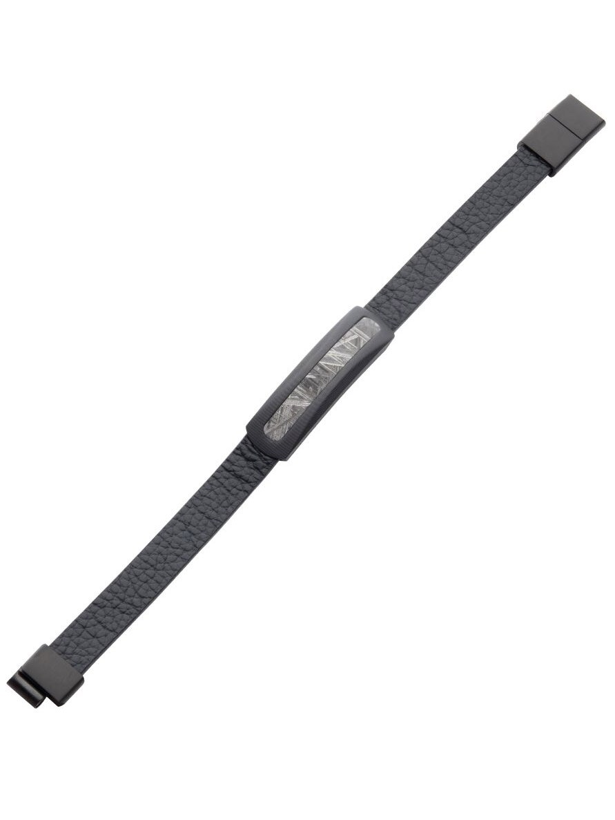 Unikt armband i svart präglat läder med exklusiva detaljer i kolfiber och en autentisk meteoritinfällning. Utrustat med ett justerbart magnetlås i rostfritt stål för enkel och säker användning.