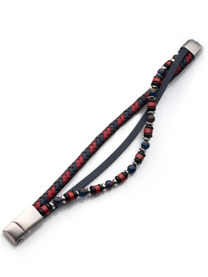 Färgstarkt multistrandsarmband i full grain-koläder kombinerat med pärlor av svart onyx, blue golden stone och röd agat. Det har magnetlås i stål samt en extra justerbar länk för perfekt passform. En modern accessoar med både färg och karaktär.