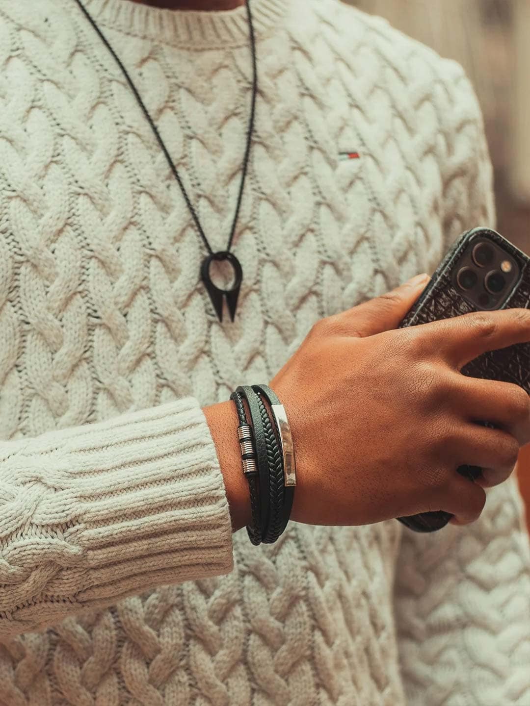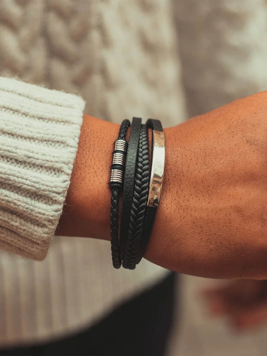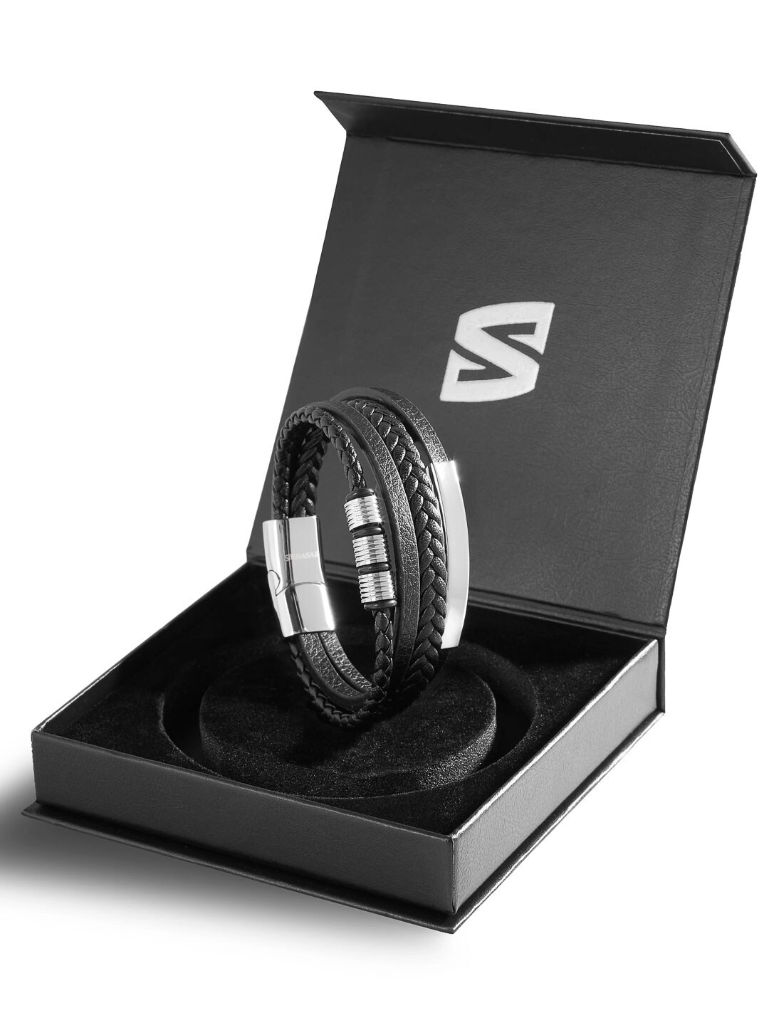 Ett elegant armband som kombinerar svart äkta läder med polerade element i rostfritt stål. Det säkra magnetlåset gör armbandet enkelt att ta på och av, och den medföljande förlängningslänken låter dig justera längden för optimal passform. Designen balanserar klassisk stil med modern attityd - perfekt både till vardag och fest!