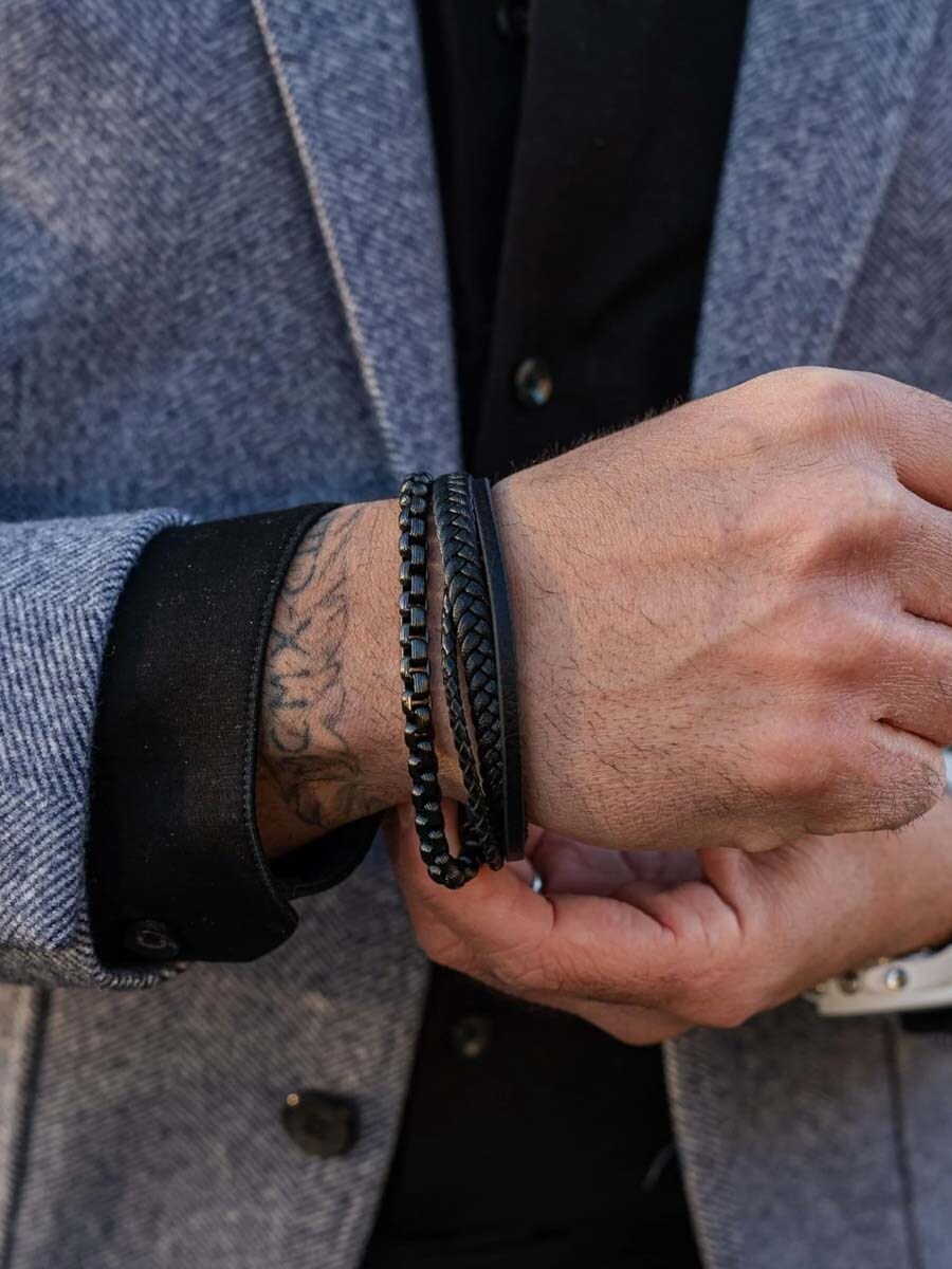 Ett karaktärsfullt armband i äkta läder med flera flätade remmar och en kedja i rostfritt stål. Det polerade magnetlåset gör det enkelt att ta på och av samtidigt som det sitter stabilt på handleden. Armbandet levereras dessutom med en extra länk så att du enkelt kan justera längden för perfekt passform. En tidlös accessoar som lyfter varje outfit.