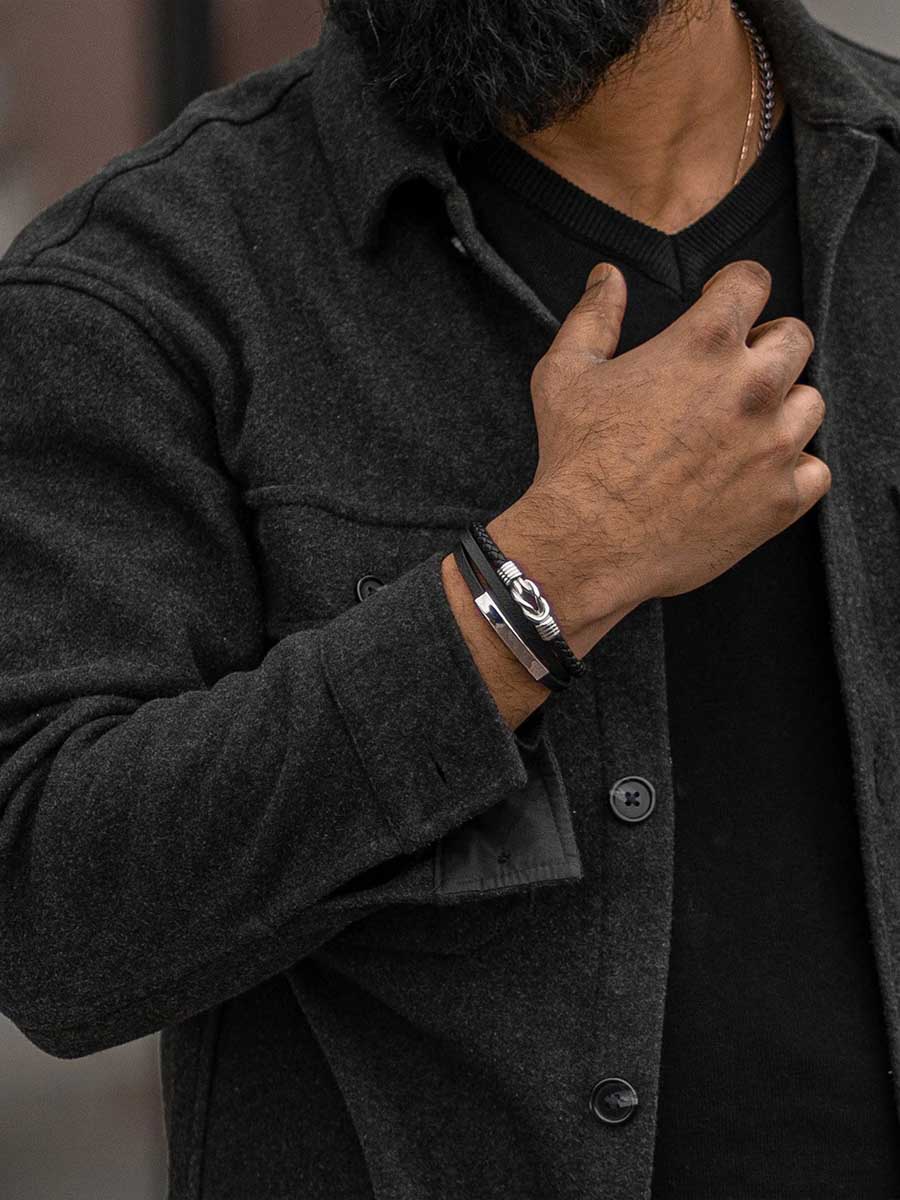 Ett elegant armband som kombinerar svart äkta läder med polerade element i rostfritt stål. Det säkra magnetlåset gör armbandet enkelt att ta på och av, och den medföljande förlängningslänken låter dig justera längden för optimal passform. Designen balanserar klassisk stil med modern attityd - perfekt både till vardag och fest!