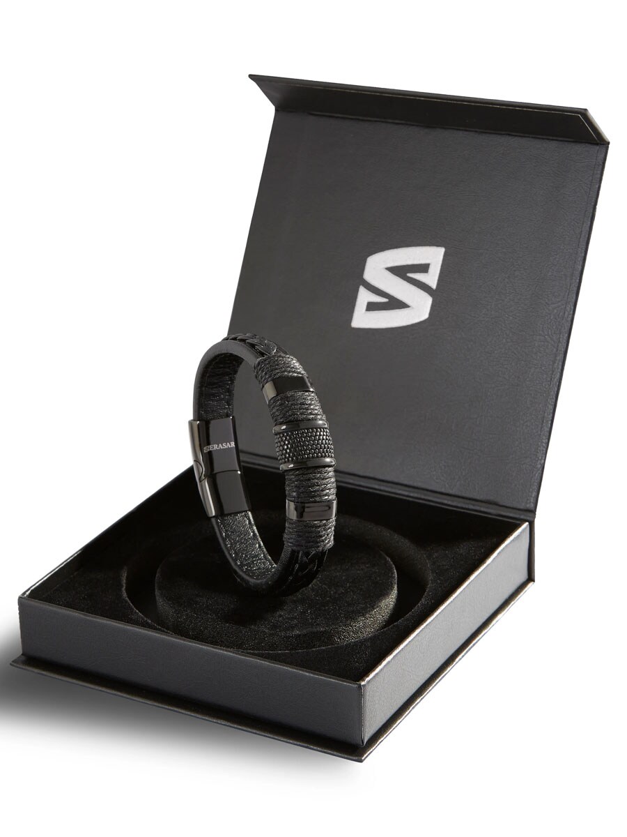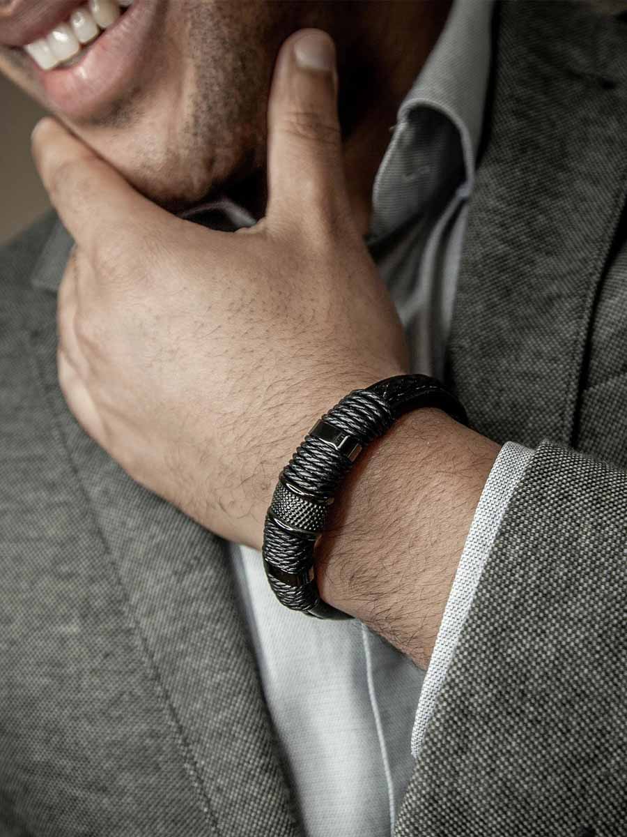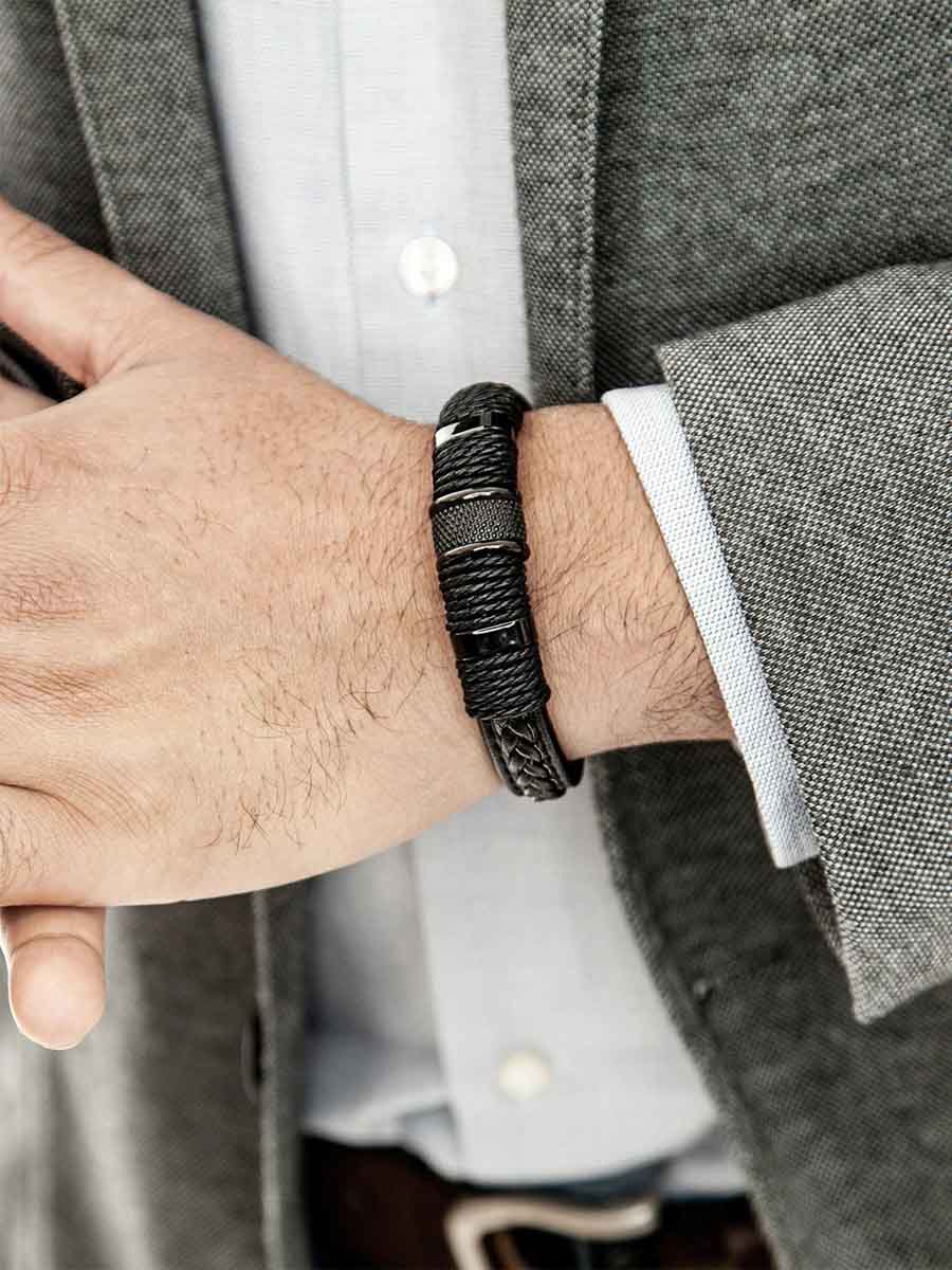 Ett kraftfullt armband som kombinerar flätat läder med detaljer i rostfritt stål för en modern, robust look. Låset är lätt att hantera med en hand och levereras med en extra förlängningslänk, så du enkelt kan justera längden efter önskad passform. En stilig accessoar som lyfter varje outfit.