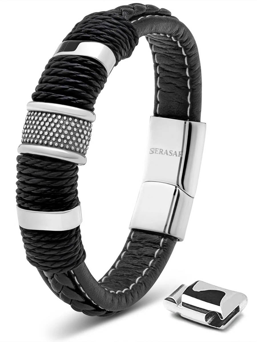Ett kraftfullt armband som kombinerar flätat läder med detaljer i rostfritt stål för en modern, robust look. Låset är lätt att hantera med en hand och levereras med en extra förlängningslänk, så du enkelt kan justera längden efter önskad passform. En stilig accessoar som lyfter varje outfit.