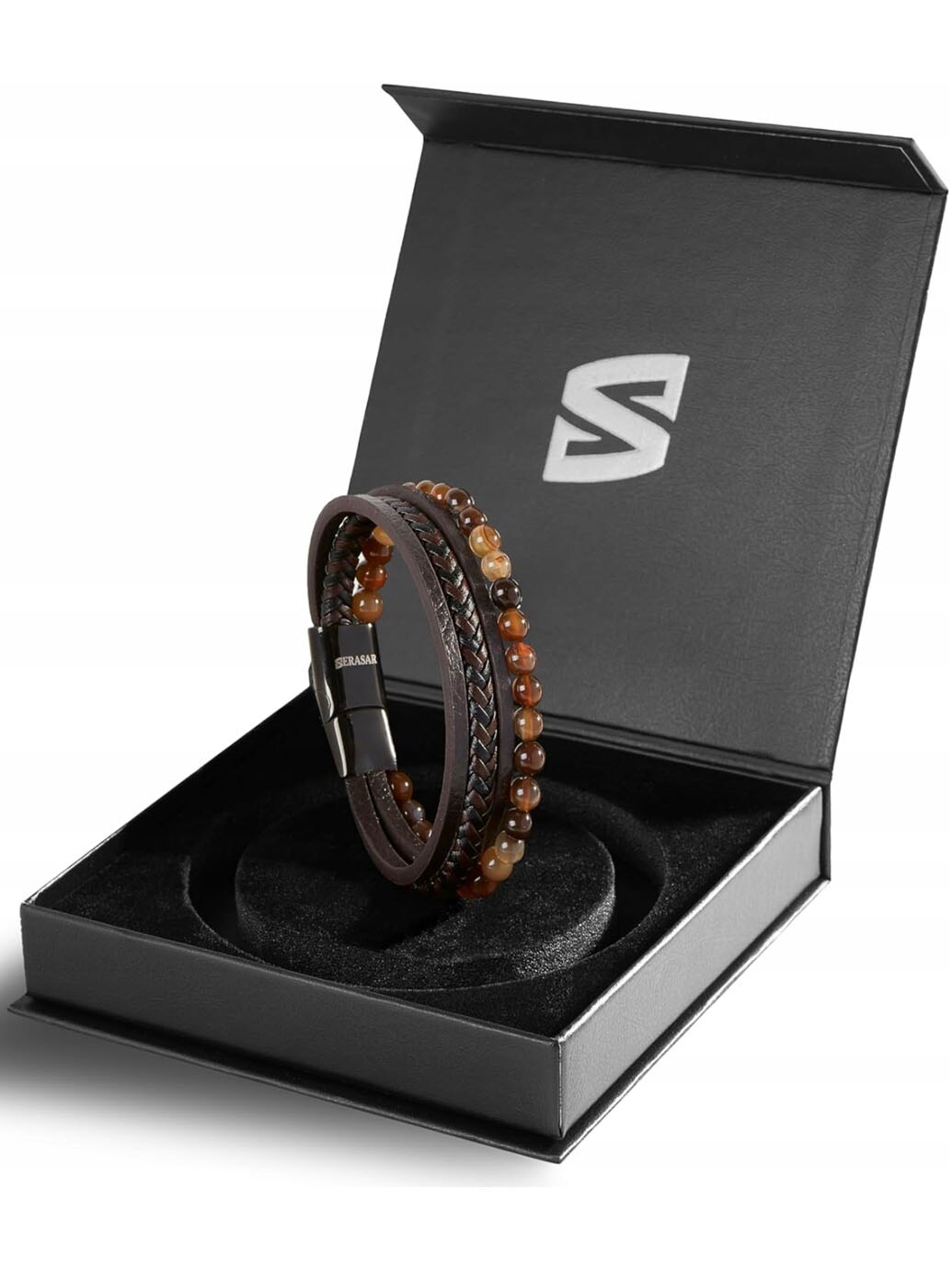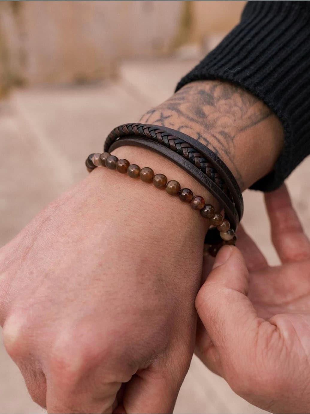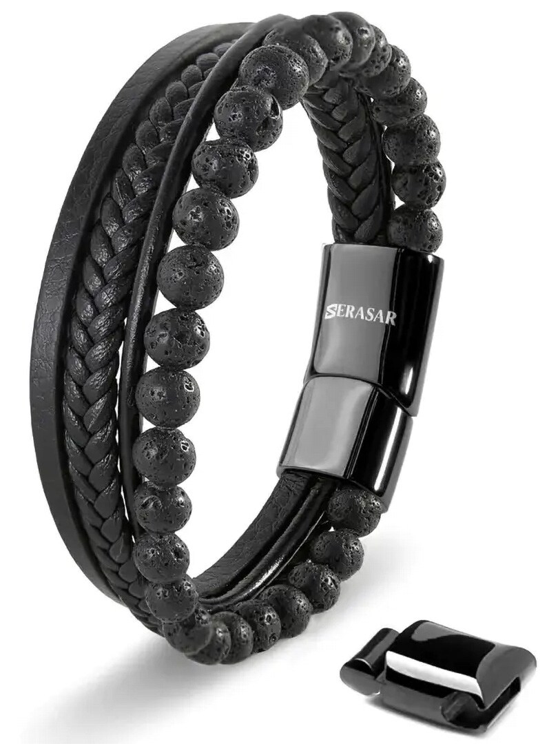 Ett stilfullt armband som kombinerar flätat läder med lavastenar för en modern och kraftfull look. Det polerade magnetlåset i rostfritt stål gör armbandet enkelt att ta på och av, samtidigt som det sitter säkert på plats. Levereras med extra länk för justerbar längd och perfekt passform. En sofistikerad accessoar som passar både till vardag och fest.