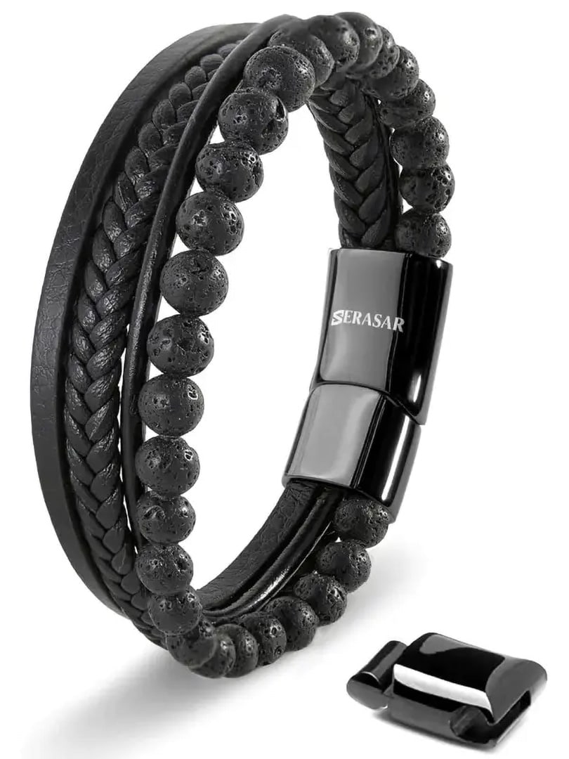 Ett stilfullt armband som kombinerar flätat läder med mattsvarta lavastenar för en modern och kraftfull look. Det polerade magnetlåset i rostfritt stål gör armbandet enkelt att ta på och av, samtidigt som det sitter säkert på plats. Levereras med extra länk för justerbar längd och perfekt passform. En sofistikerad accessoar som passar både till vardag och fest.