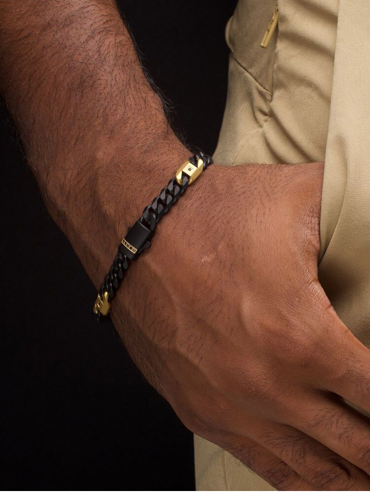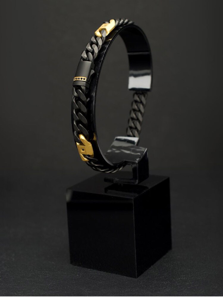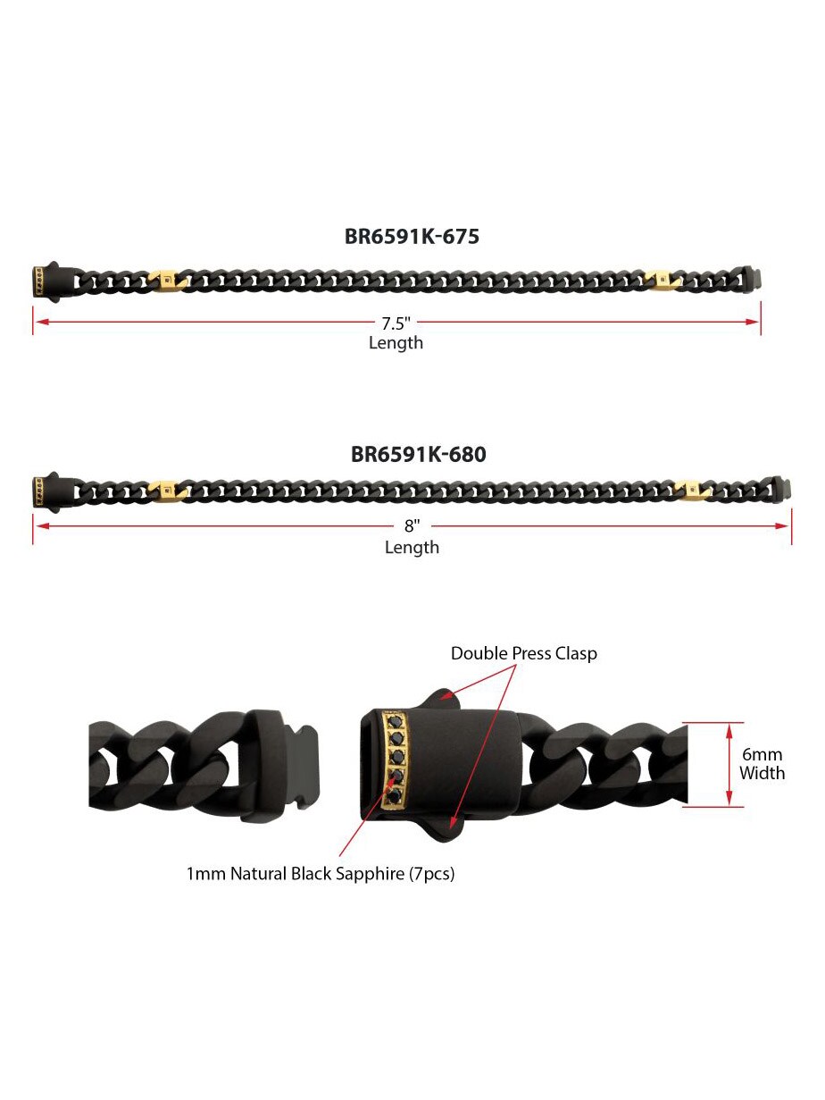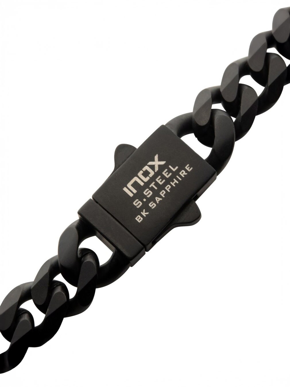 Kedjearmband i rostfritt stål med svart IP-plättering och gulddetaljer. Designad med safirsten vid låset och har en matt finnish.