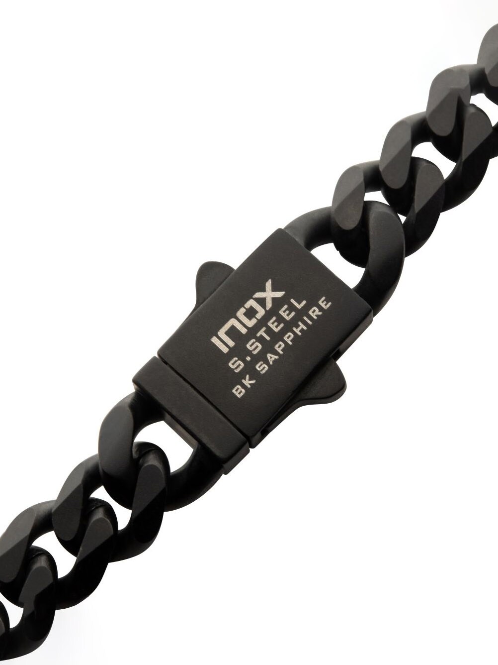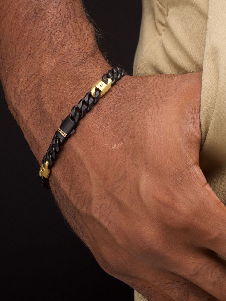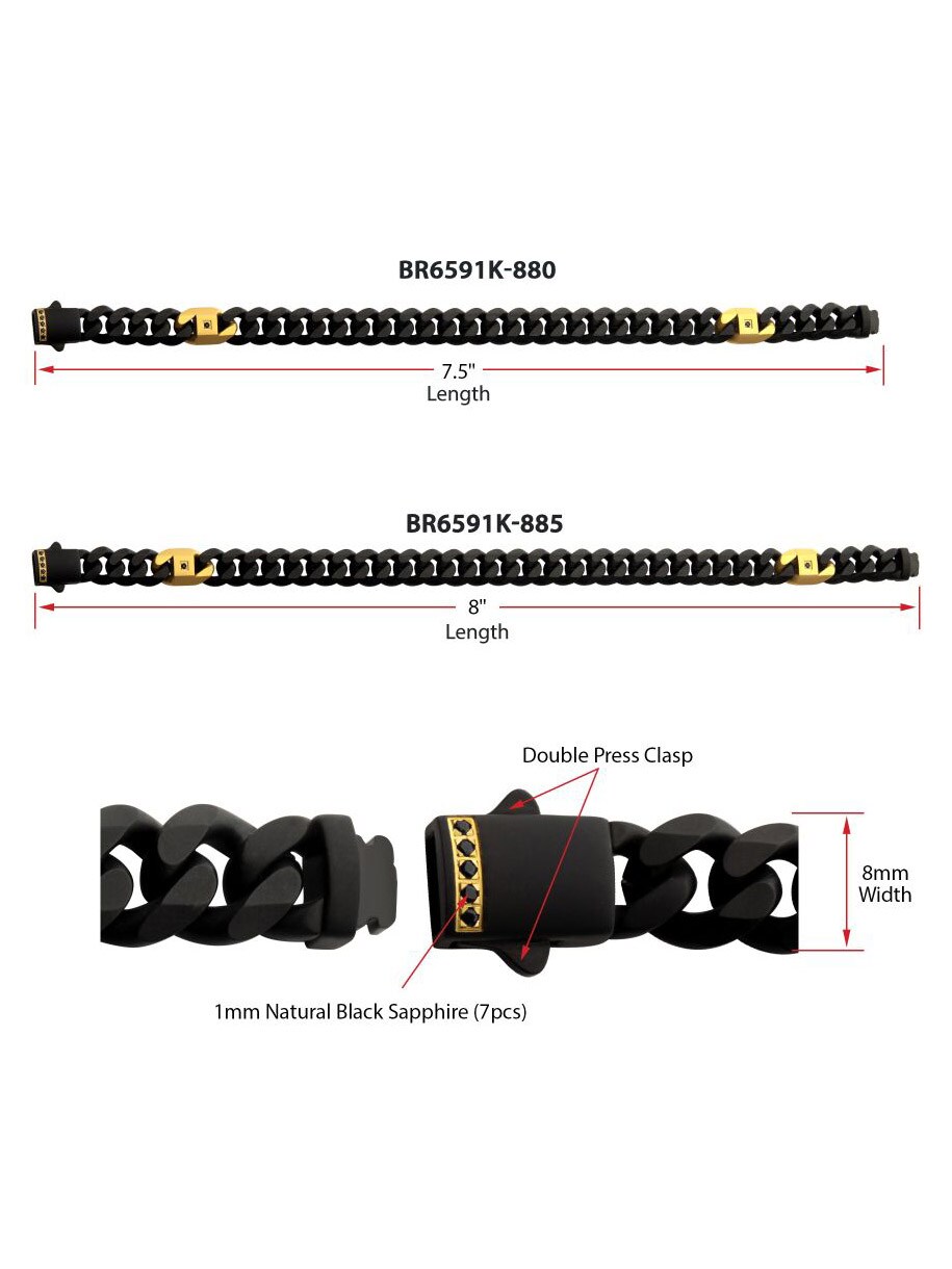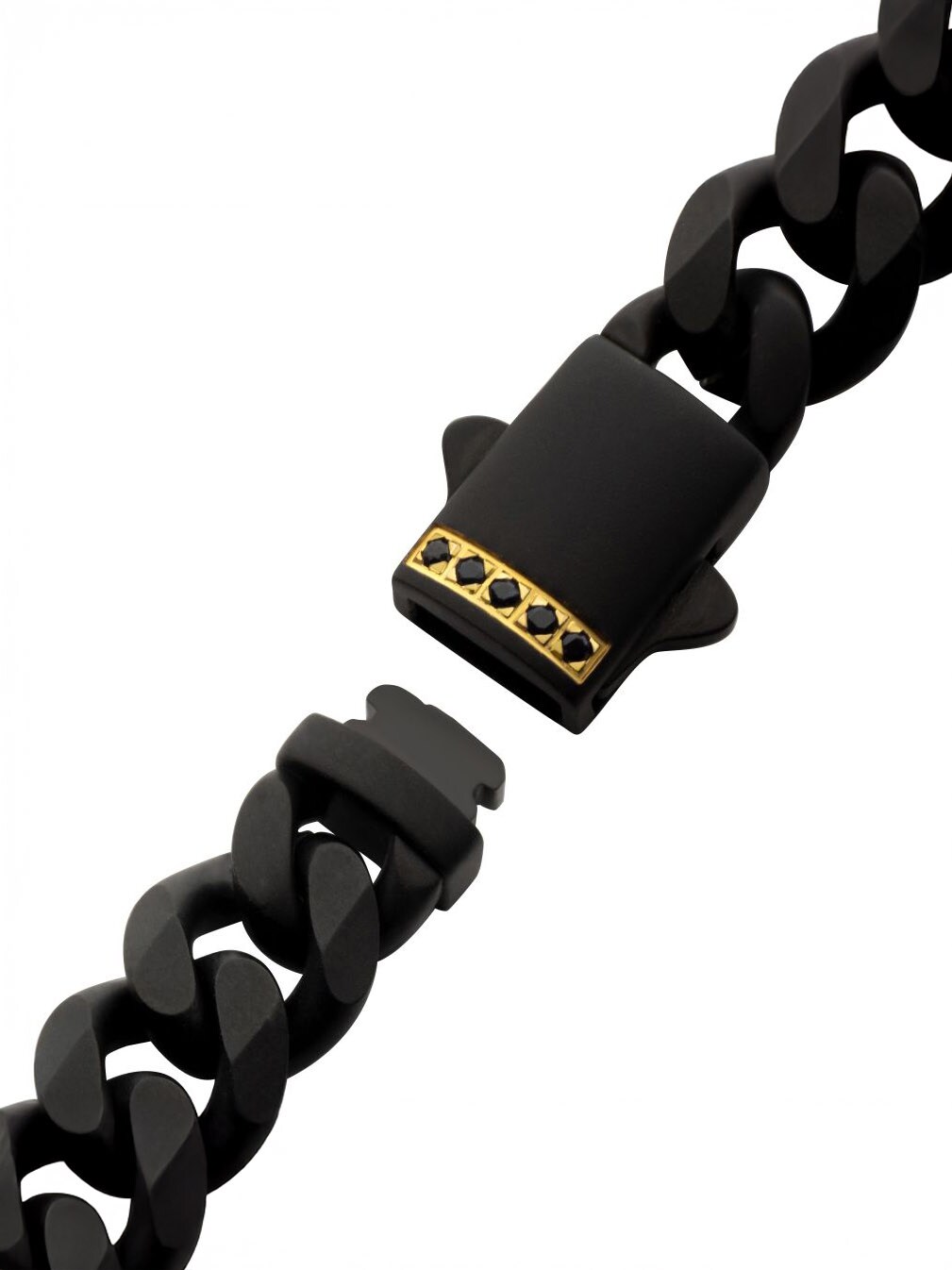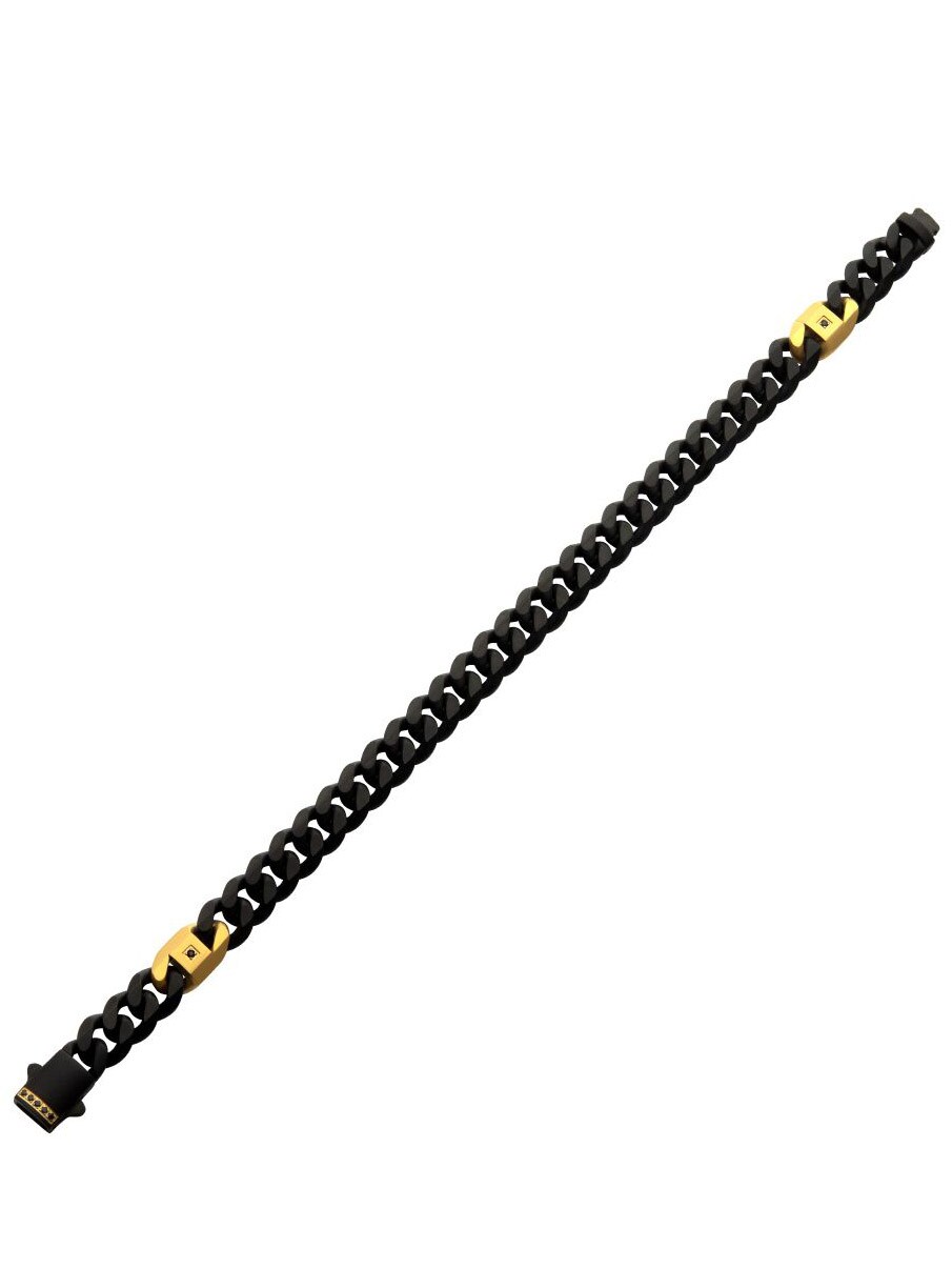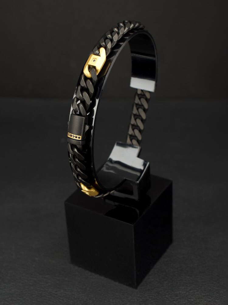 Kedjearmband i rostfritt stål med svart IP-plättering och gulddetaljer. Designad med safirsten vid låset och har en matt finnish.