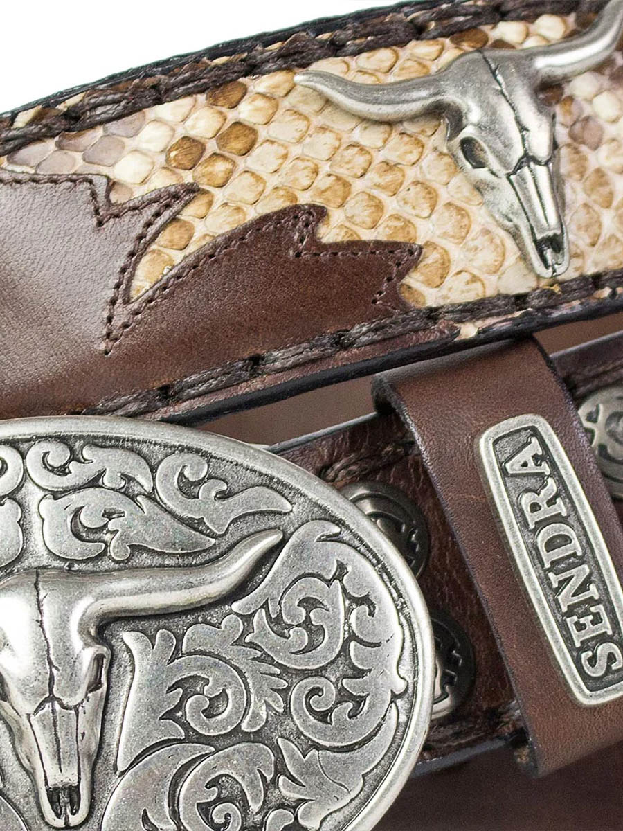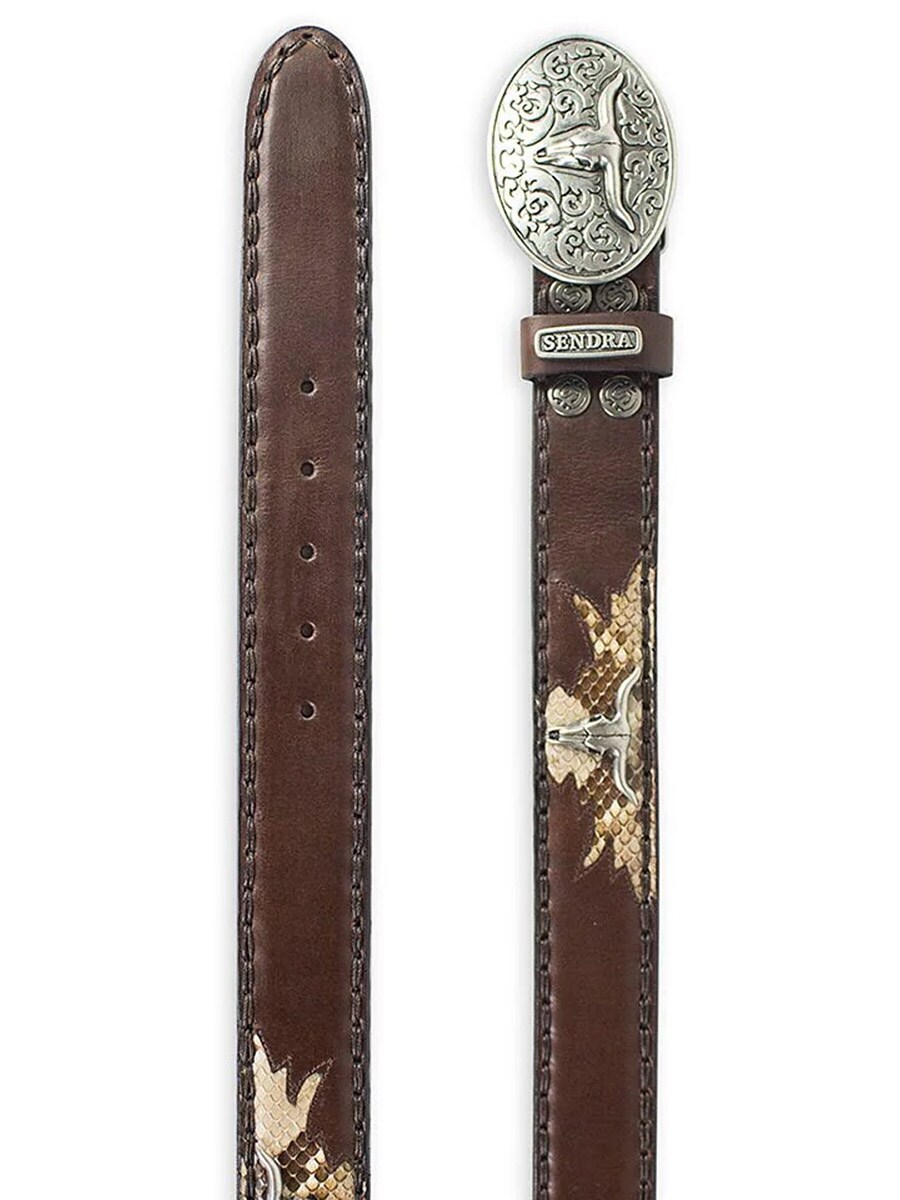 Ett premiumbälte för dig som vill ha ett tydligt westernuttryck med lyxig finish. Bältet är tillverkat i högkvalitativt brunt läder och dekorerat med inlägg av naturligt pythonläder som skapar en unik struktur och karaktär. De detaljerade metalldekorationerna och det ovala spännet med longhornmotiv förstärker den rustika cowboystilen som Sendra är kända för. Ett perfekt komplement till både jeans och cowboyboots!