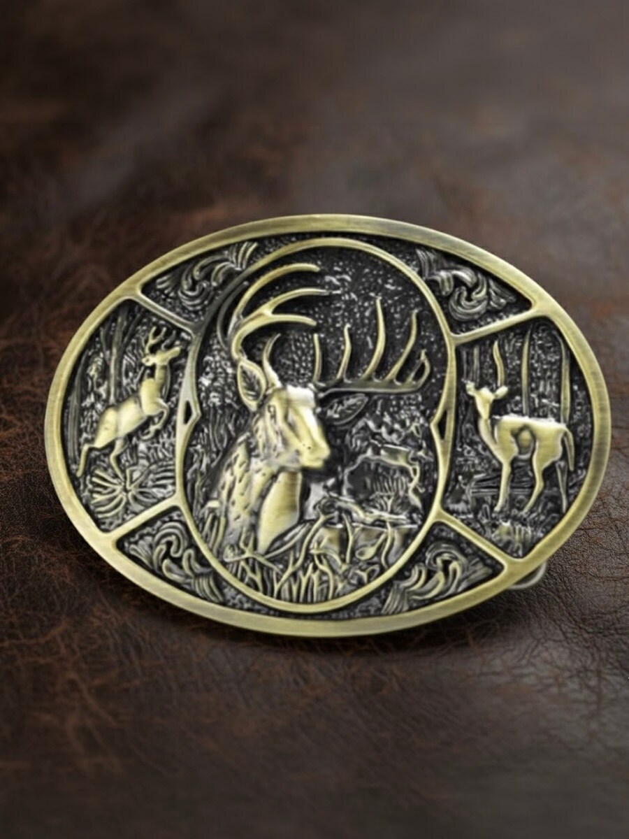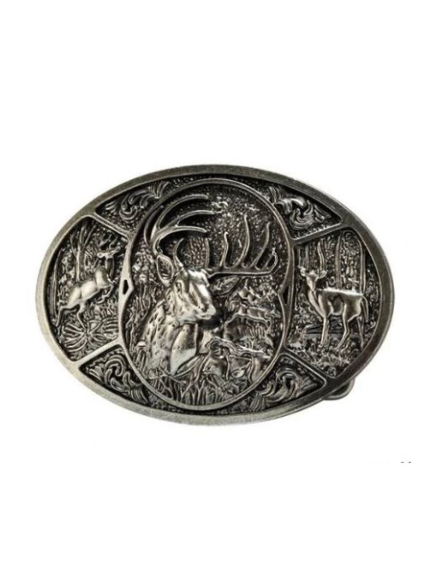 Ett ovalt spänne med djup relief som visar en majestätisk bock omgiven av skogsscener. Spännet passar bälten som är upp till 4 cm breda, vilket gör det enkelt att kombinera med de flesta standardbälten med utbytbara spännen.