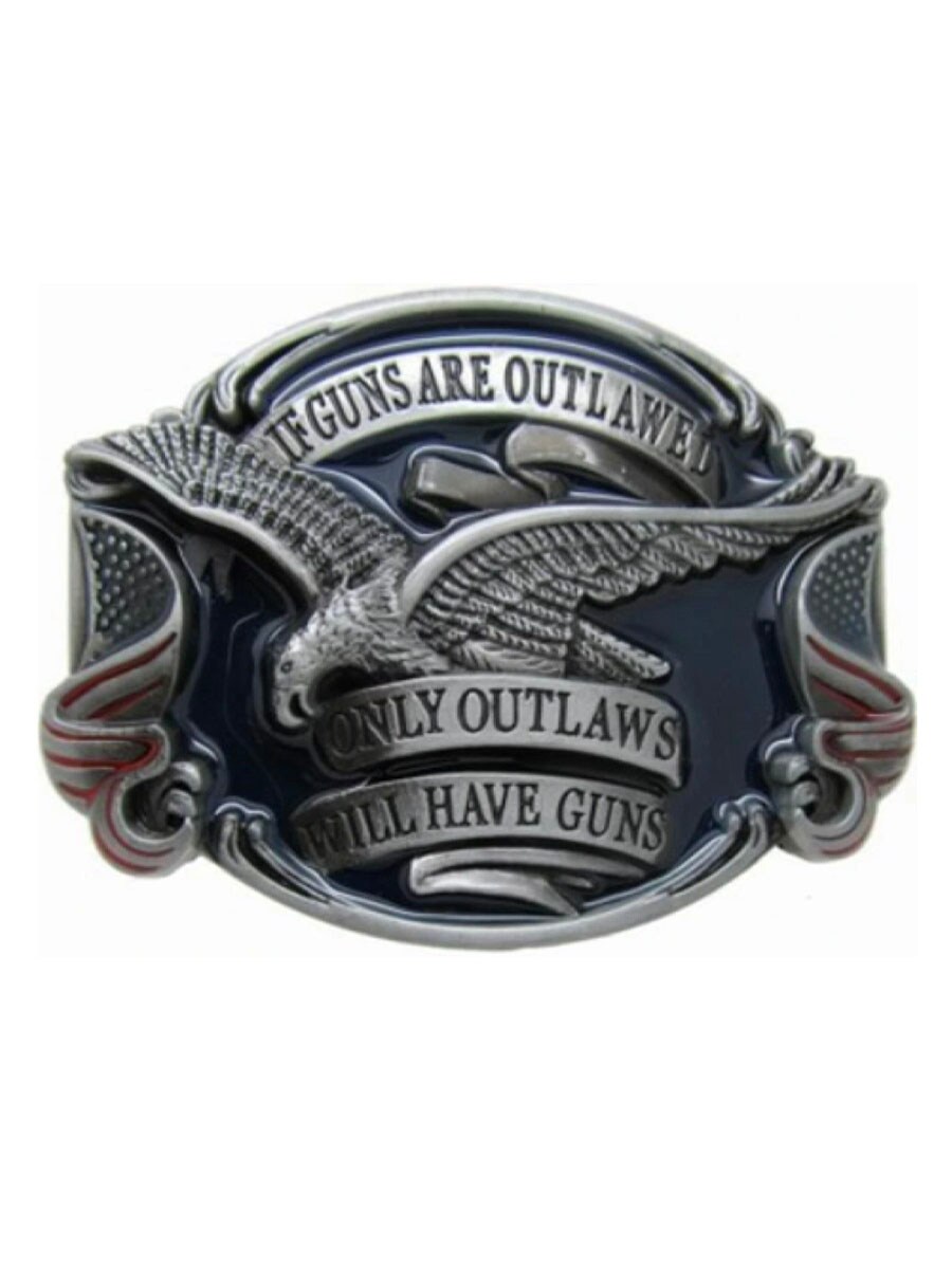 Ett detaljrikt spänne med en flygande örn och budskapet “If guns are outlawed, only outlaws will have guns”. Den ovala formen och de patriotiska inslagen ger en tydlig westernkänsla. Spännet passar bälten som är upp till 4 cm breda, vilket gör det enkelt att kombinera med de flesta standardbälten med utbytbara spännen.