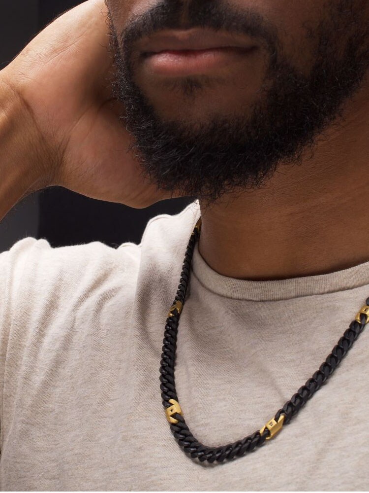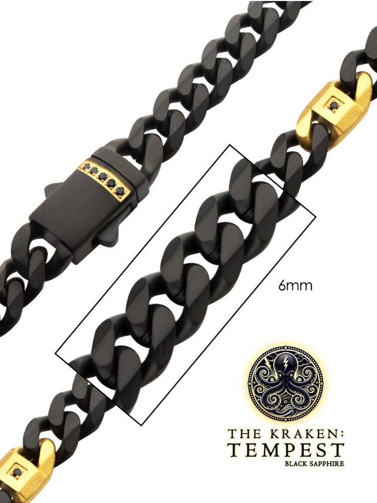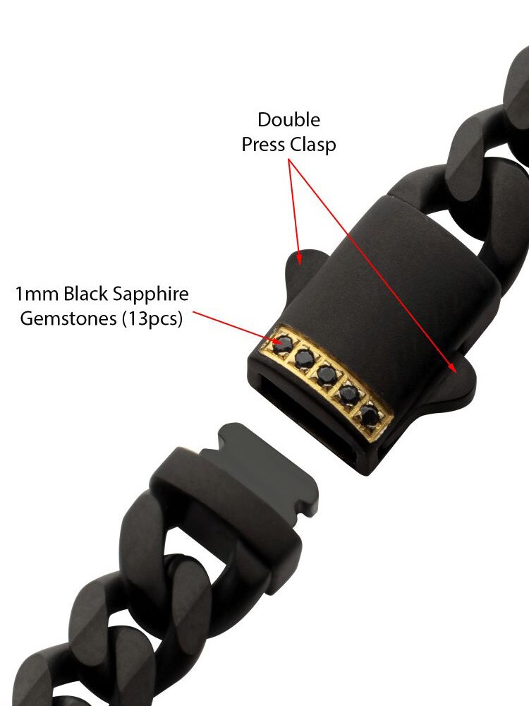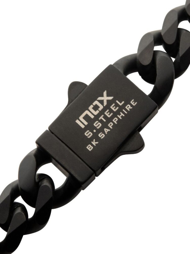 Cuban-kedja från Inox med svart IP-plättering och matt finnish. Låset pryds av svarta safir stenar infattad i ett exklusivt 18K guldpläterat dubbelflikslås som både ger säkerhet och en lyxig detalj.