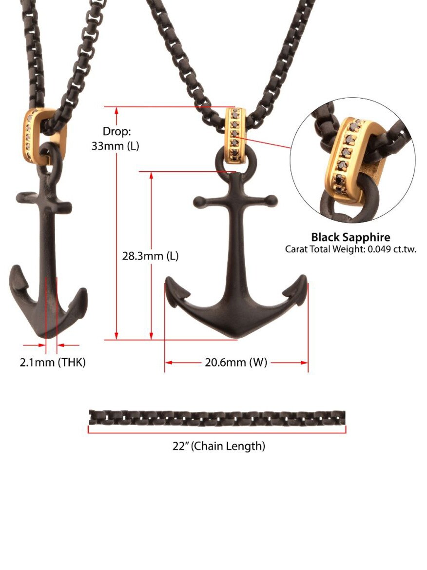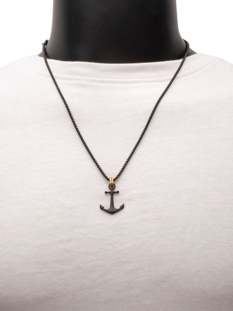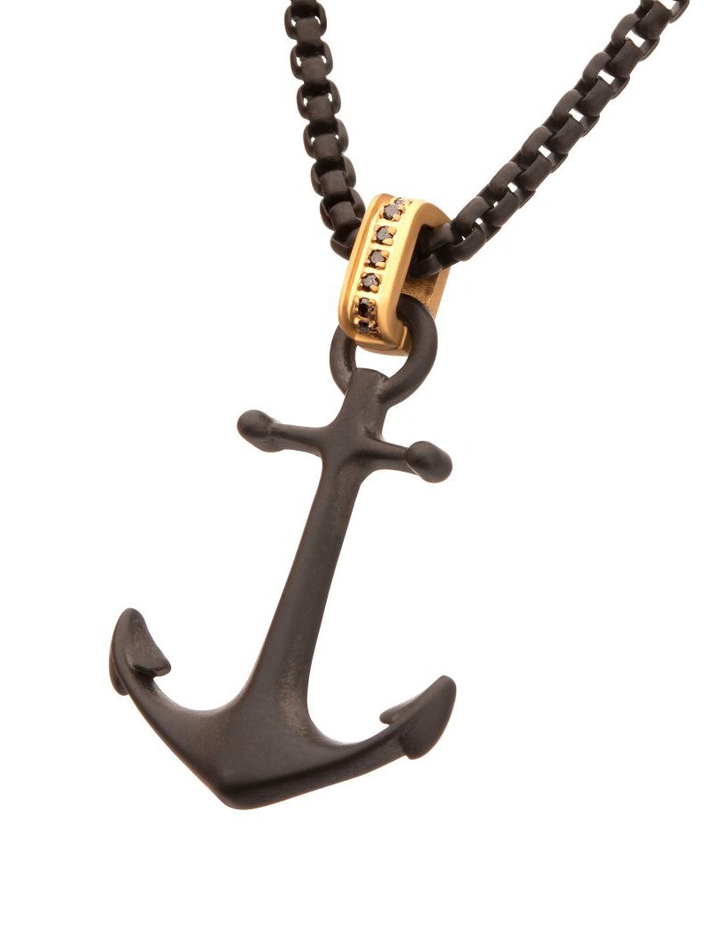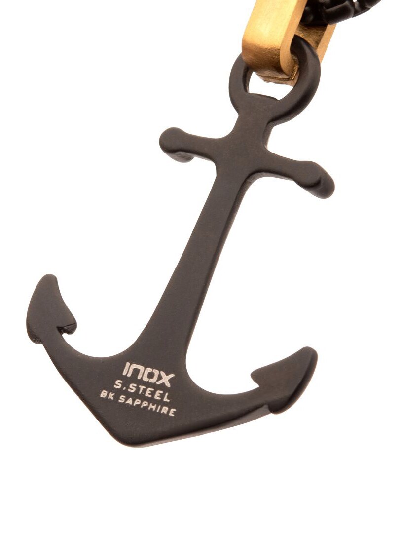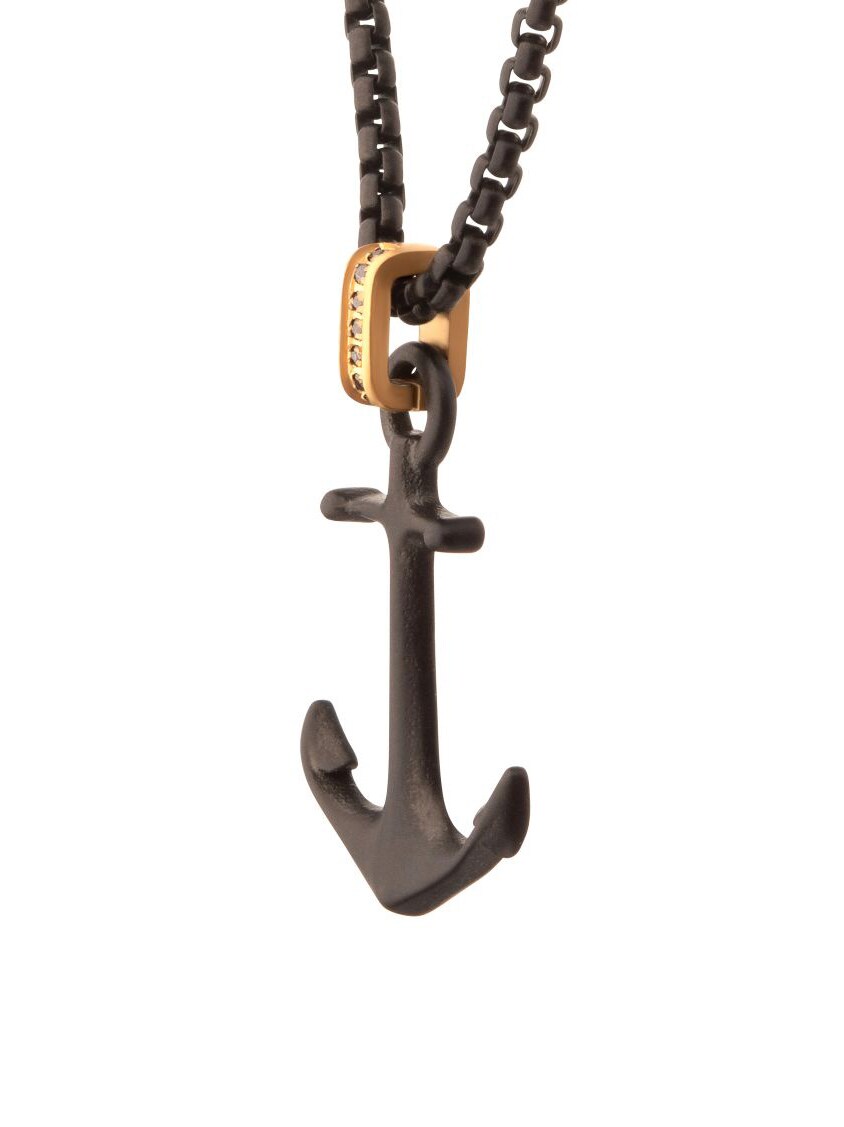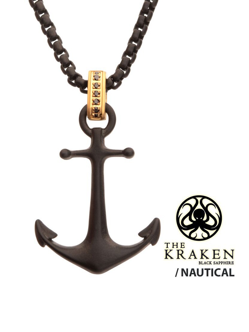 Halsband med kedja och hänge i svart IP-stål och matt finish. Kraken-ankare med en gyllene glimt av svart safir i öglan. Tillverkad i rostfritt stål.