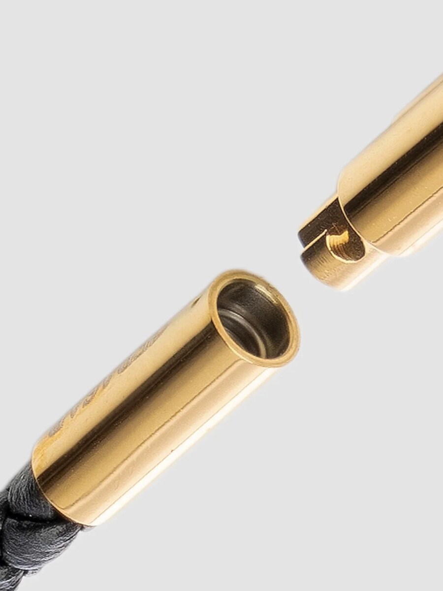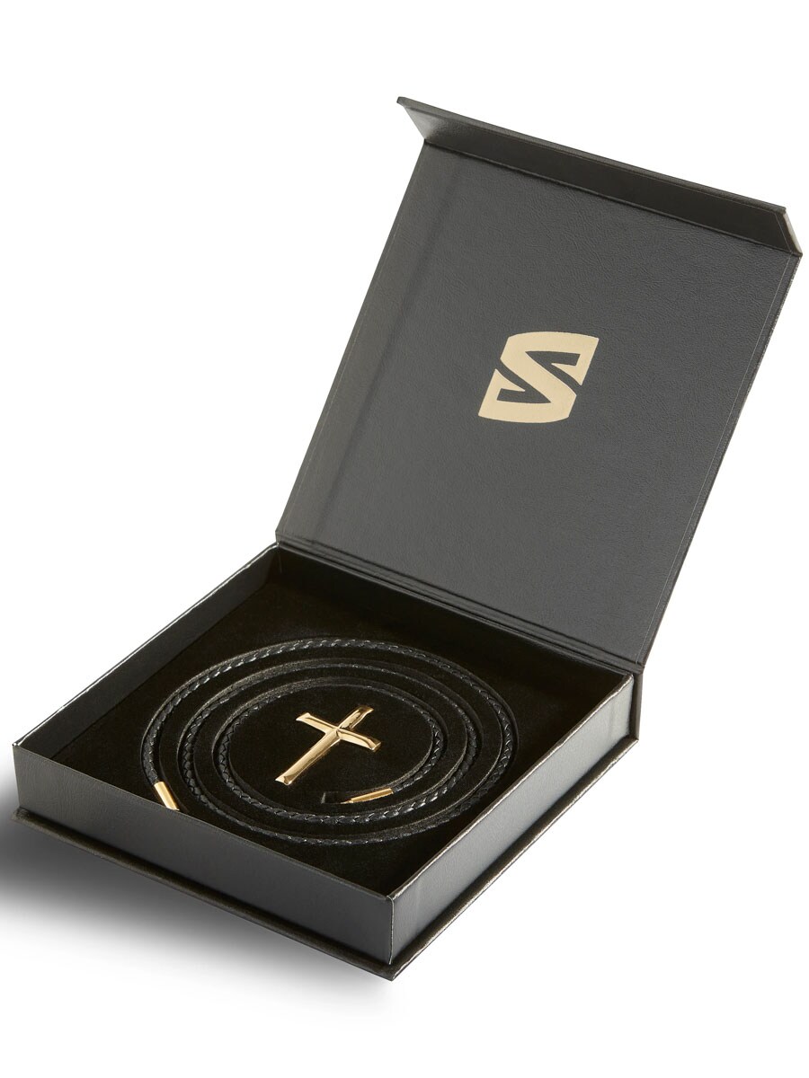 Ett stilrent halsband med flätat svart läder och ett elegant korshänge i polerat rostfritt stål. Låses smidigt med ett twist-lås som håller säkert utan att skapa tryckpunkter. Läderbandet är dessutom tillräckligt smalt för att du enkelt ska kunna trä på andra hängen - perfekt om du vill variera din stil. En bekväm och tidlös accessoar för alla tillfällen.