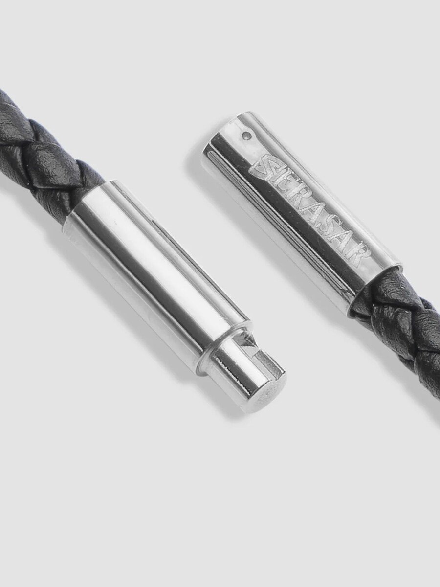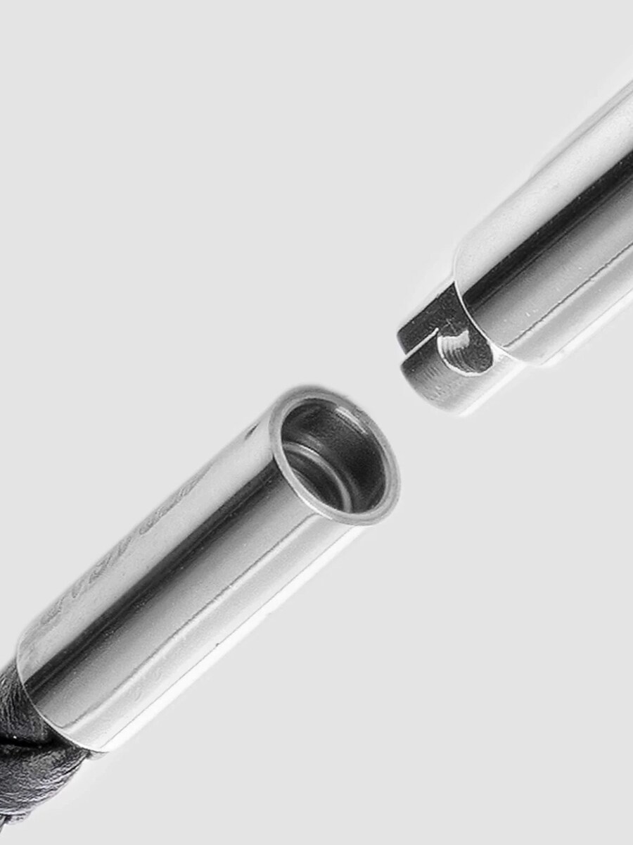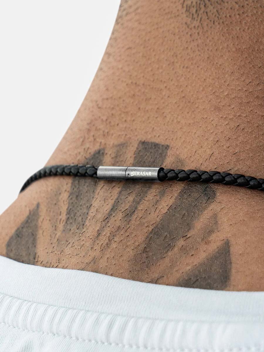 Ett stilrent halsband med flätat svart läder och ett elegant korshänge i polerat rostfritt stål. Låses smidigt med ett twist-lås som håller säkert utan att skapa tryckpunkter. Läderbandet är dessutom tillräckligt smalt för att du enkelt ska kunna trä på andra hängen - perfekt om du vill variera din stil. En bekväm och tidlös accessoar för alla tillfällen.