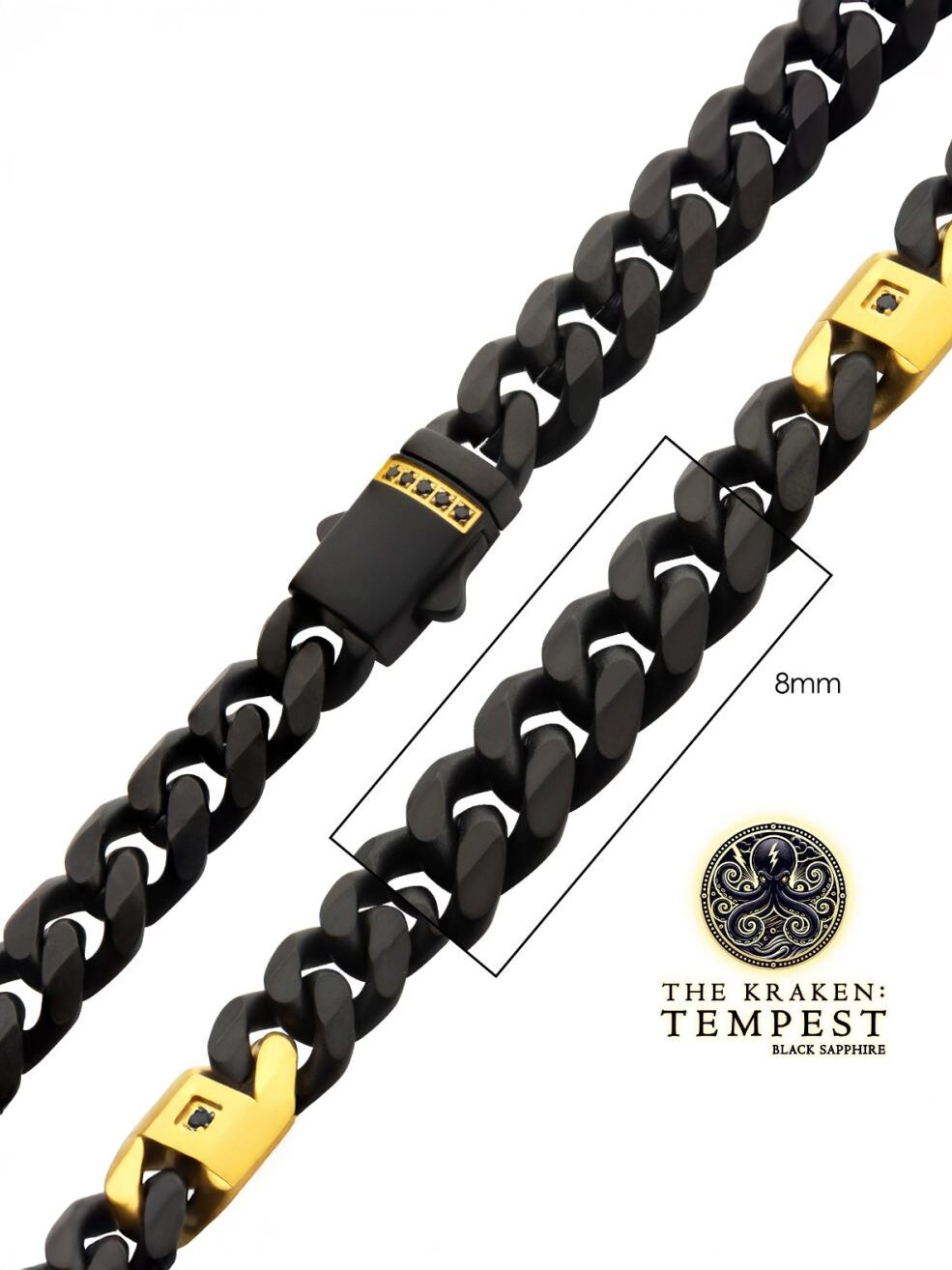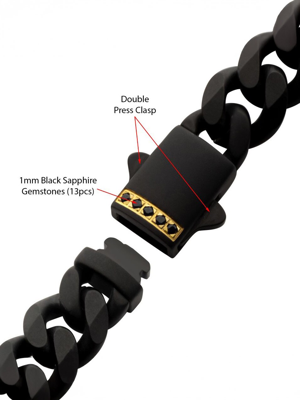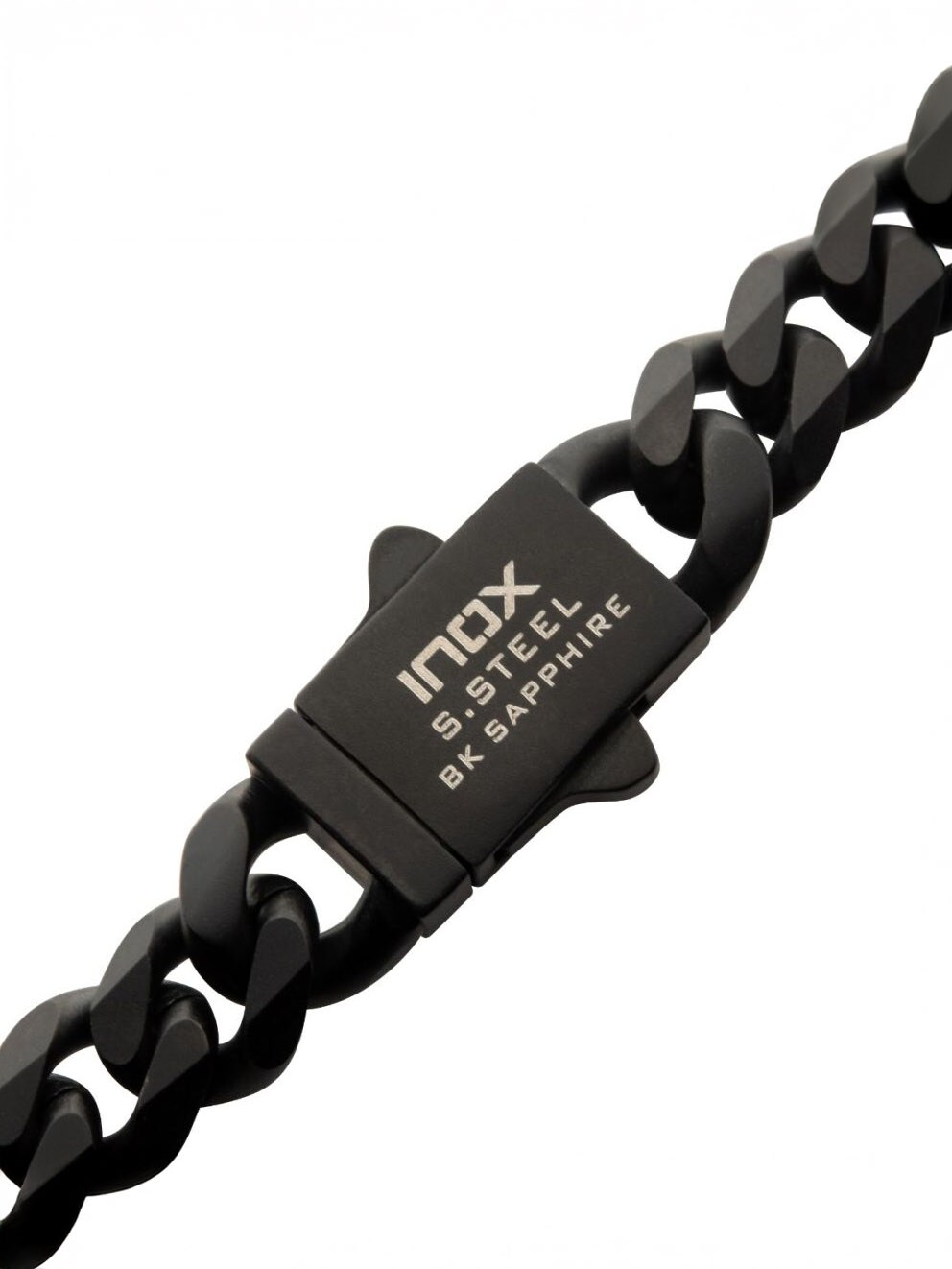 Cuban-kedja från Inox med svart IP-plättering och matt finnish. Låset pryds av svarta safir stenar infattad i ett exklusivt 18K guldpläterat dubbelflikslås som både ger säkerhet och en lyxig detalj.