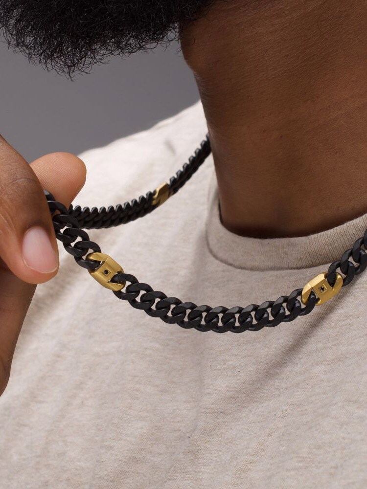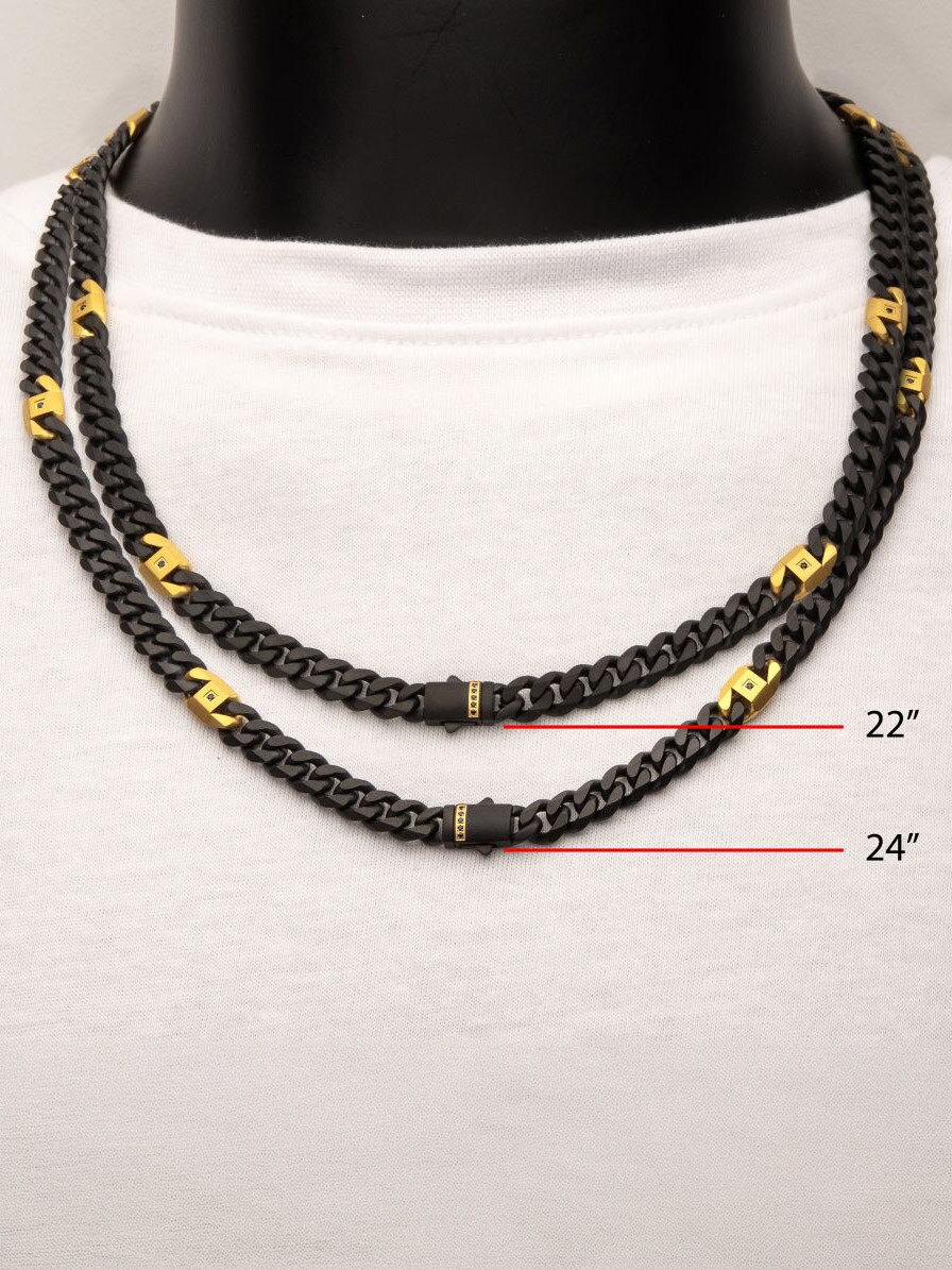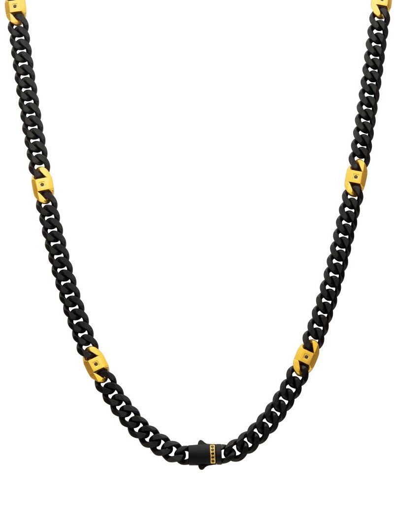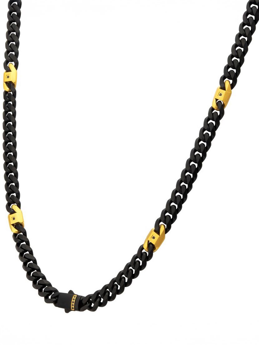 Cuban-kedja från Inox med svart IP-plättering och matt finnish. Låset pryds av svarta safir stenar infattad i ett exklusivt 18K guldpläterat dubbelflikslås som både ger säkerhet och en lyxig detalj.