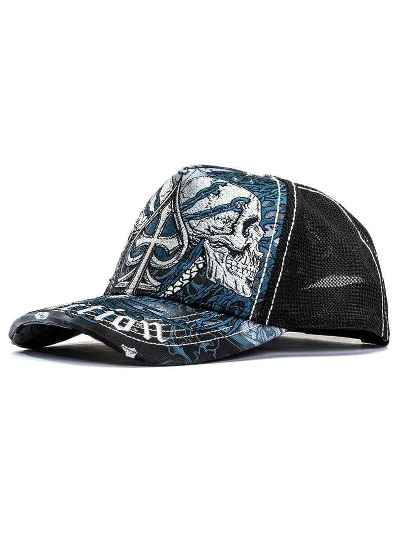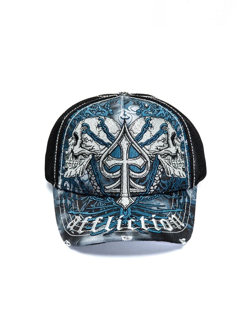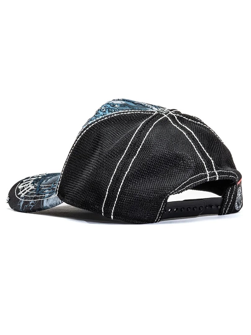 En truckerkeps med ett kraftfullt och detaljerat uttryck i Afflictions karakteristiska stil. Kepsen har twill framtill och på skärmen samt mesh baktill för bra ventilation. Slitna detaljer på front och skärm tillsammans med kontrasterande sömmar ger en rå och rockinspirerad look. Snapback-stängning baktill gör passformen justerbar och bekväm för dagligt bruk.