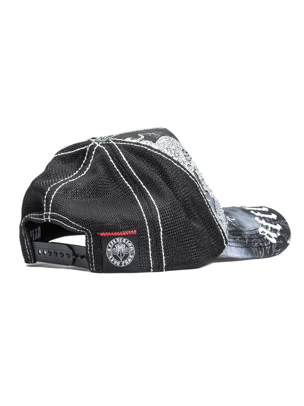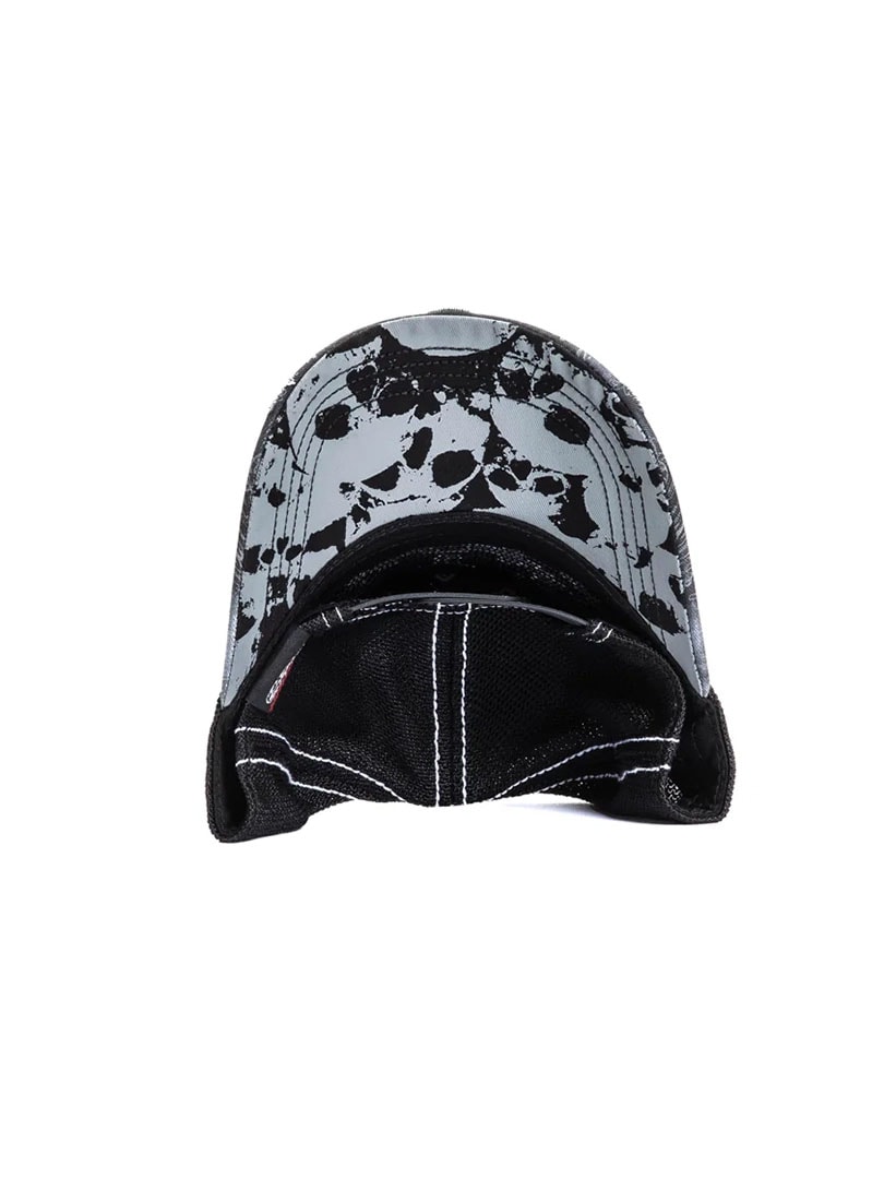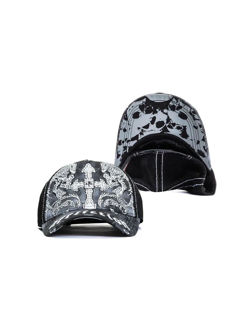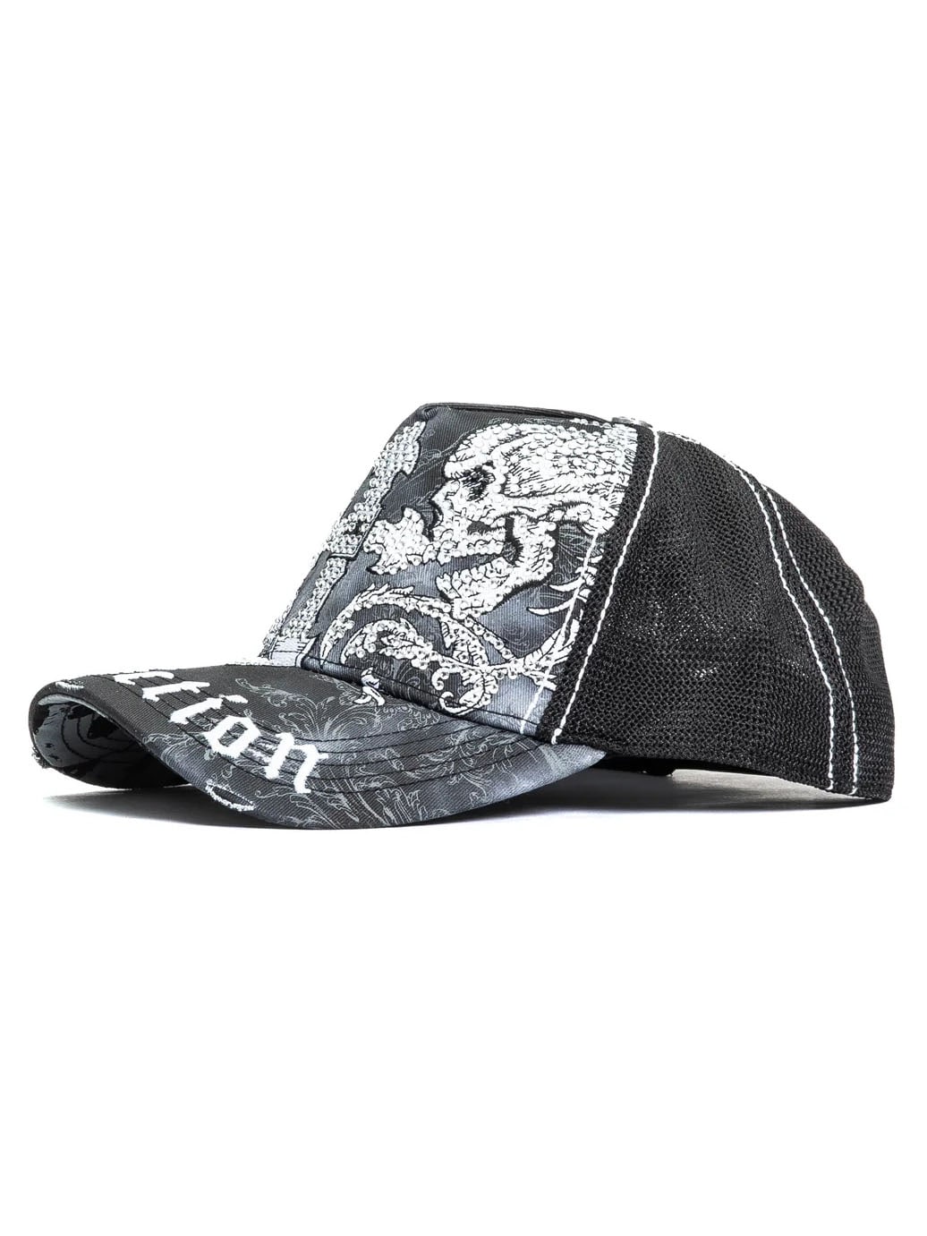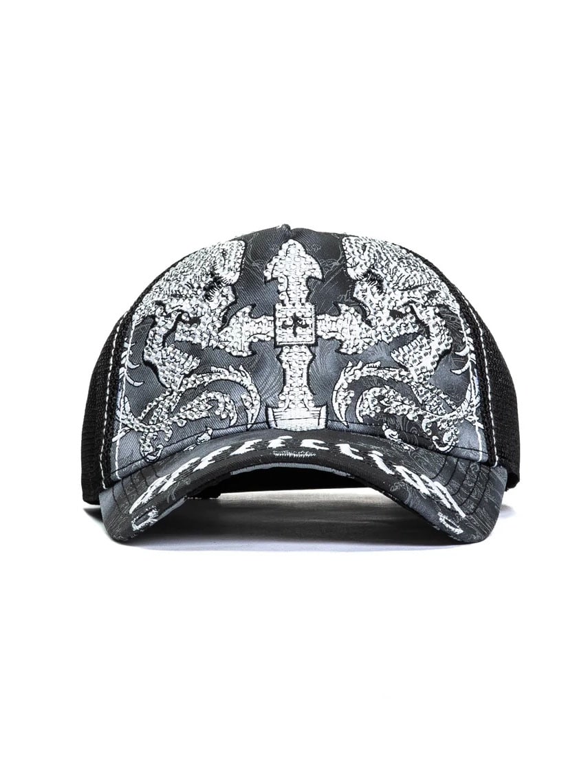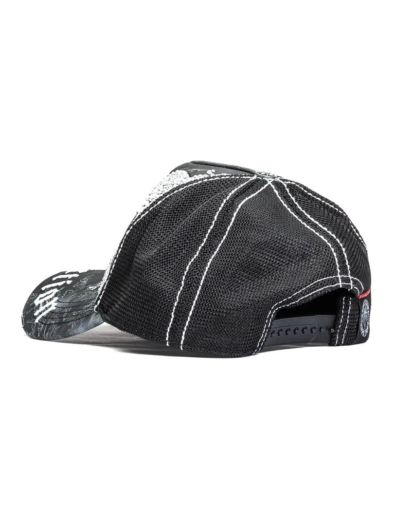En svart truckerkeps med ett kraftfullt och detaljerat uttryck. Kepsen har twill framtill och på skärmen, mesh baktill samt snapback-stängning för justerbar passform. Kontrasterande sömmar ger en genomarbetad finish, perfekt för streetwear och vardagsbruk.