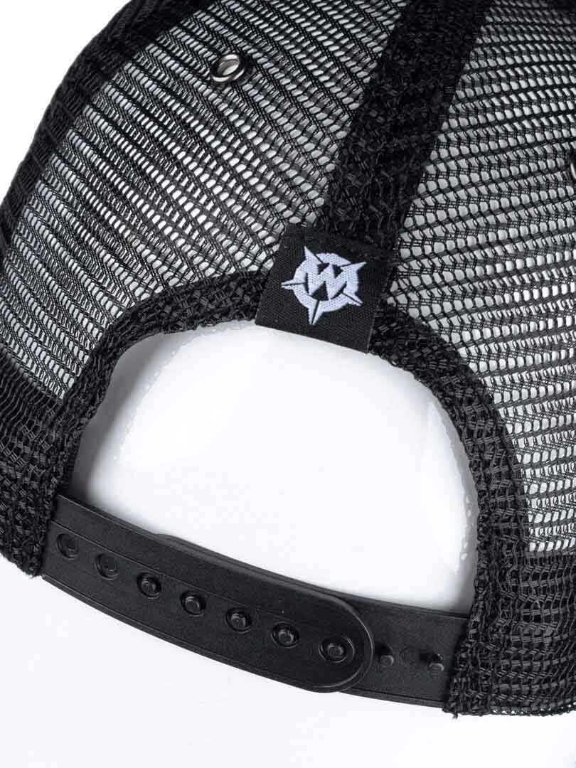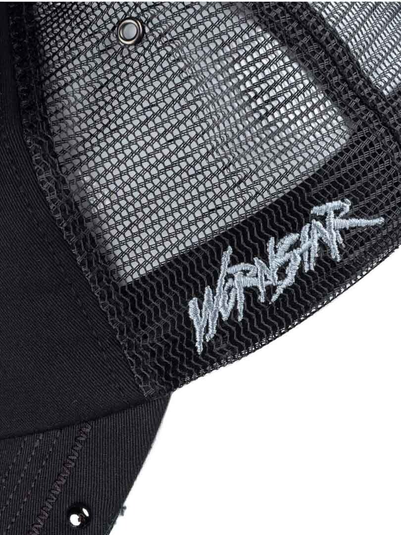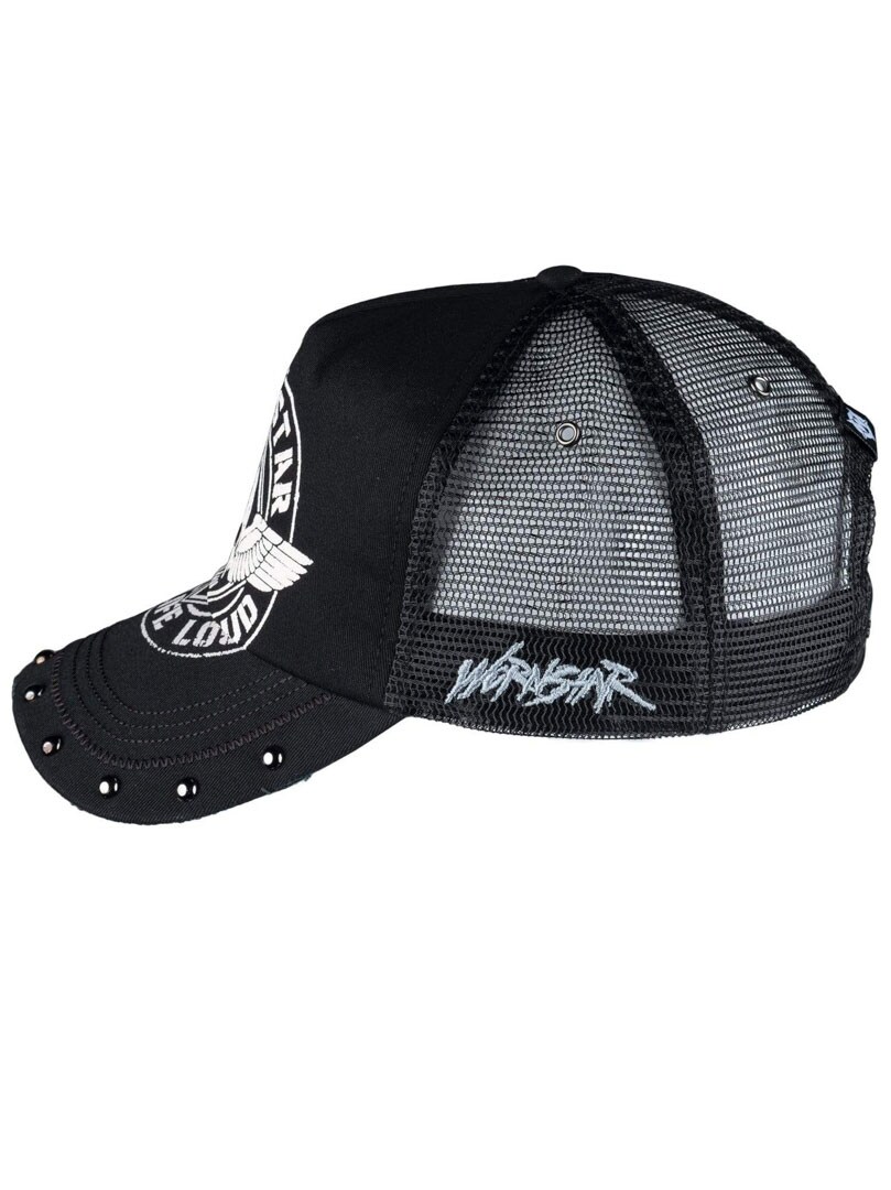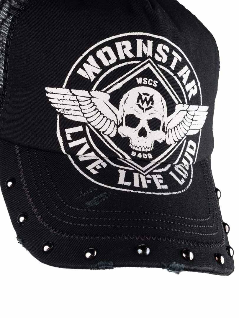 Wornstar Battalion Trucker Keps i svart med nitar och "Live Life Loud"-motiv är en statement-keps för den moderna rebellen.