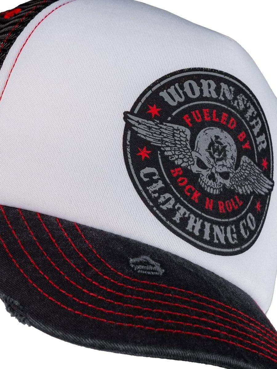 Wornstar Fueled Trucker Keps i svart och vitt med slitna detaljer är det ultimata valet för en rockig look.