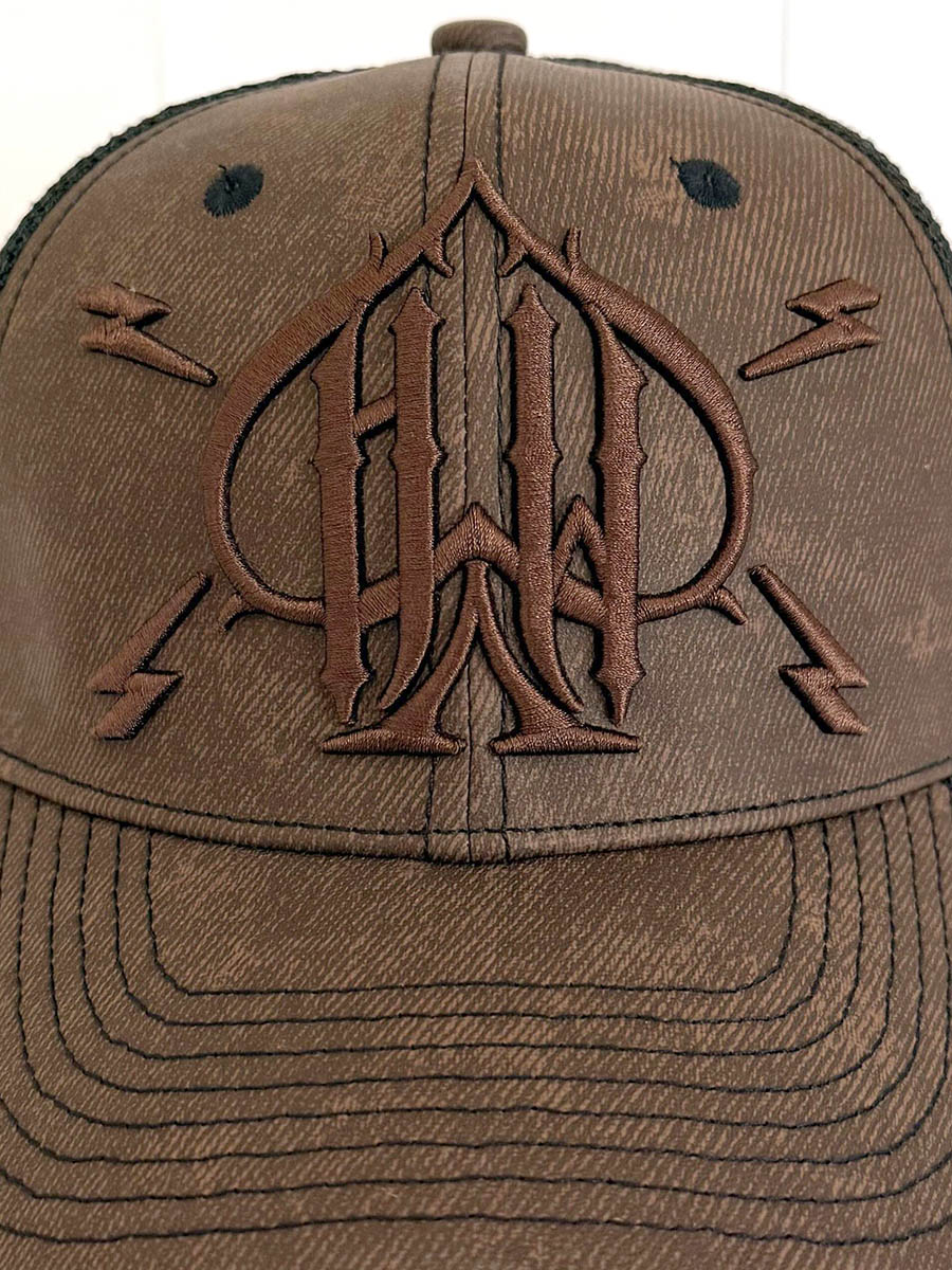 Brun keps tillverkad i PU-läder framtill och svart mesh baktill. Den har broderat tryck framtill, böjd skärm och snapback.