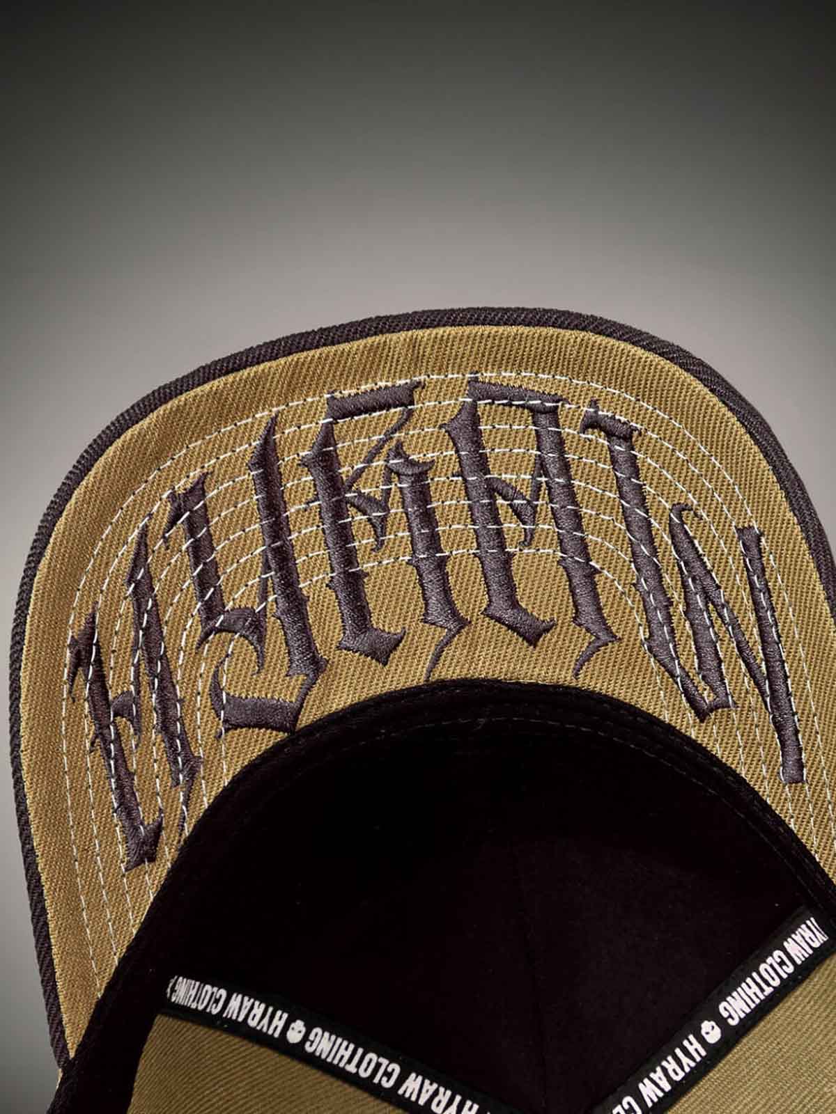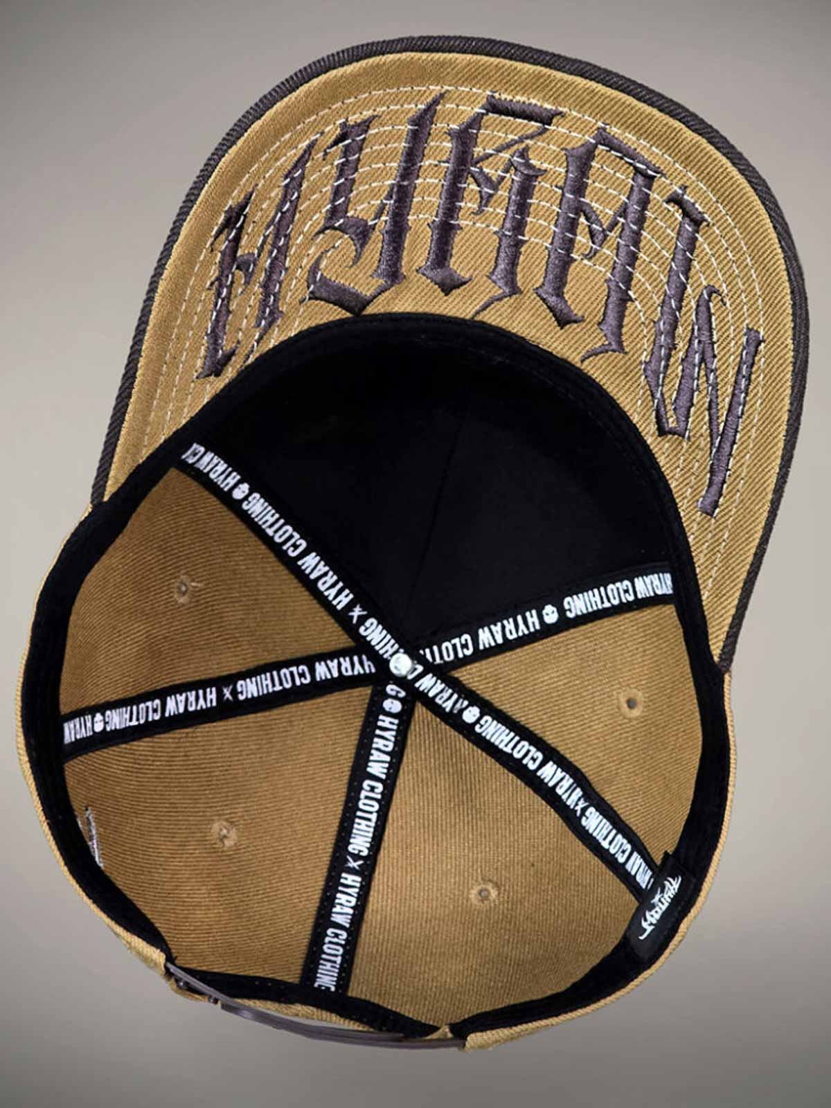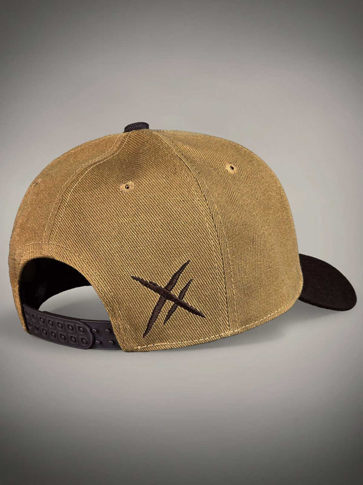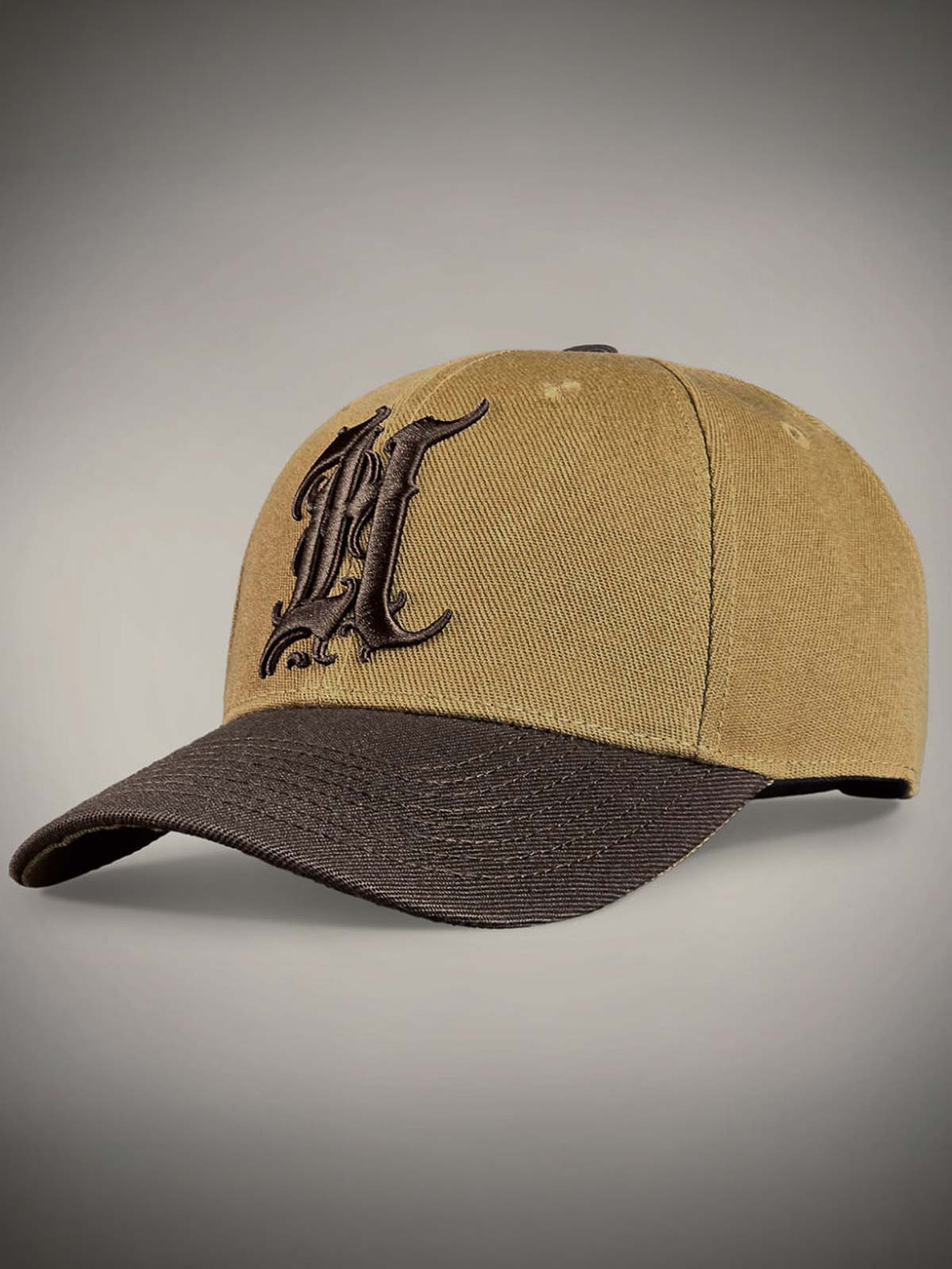 Camelfärgad keps med böjd brun skärm, dekorerad med broderad logga framtill. Undersidan av skärmen pryds av en brun, skräddad logga, och kepsen har justerbar snapback för en bekväm passform.