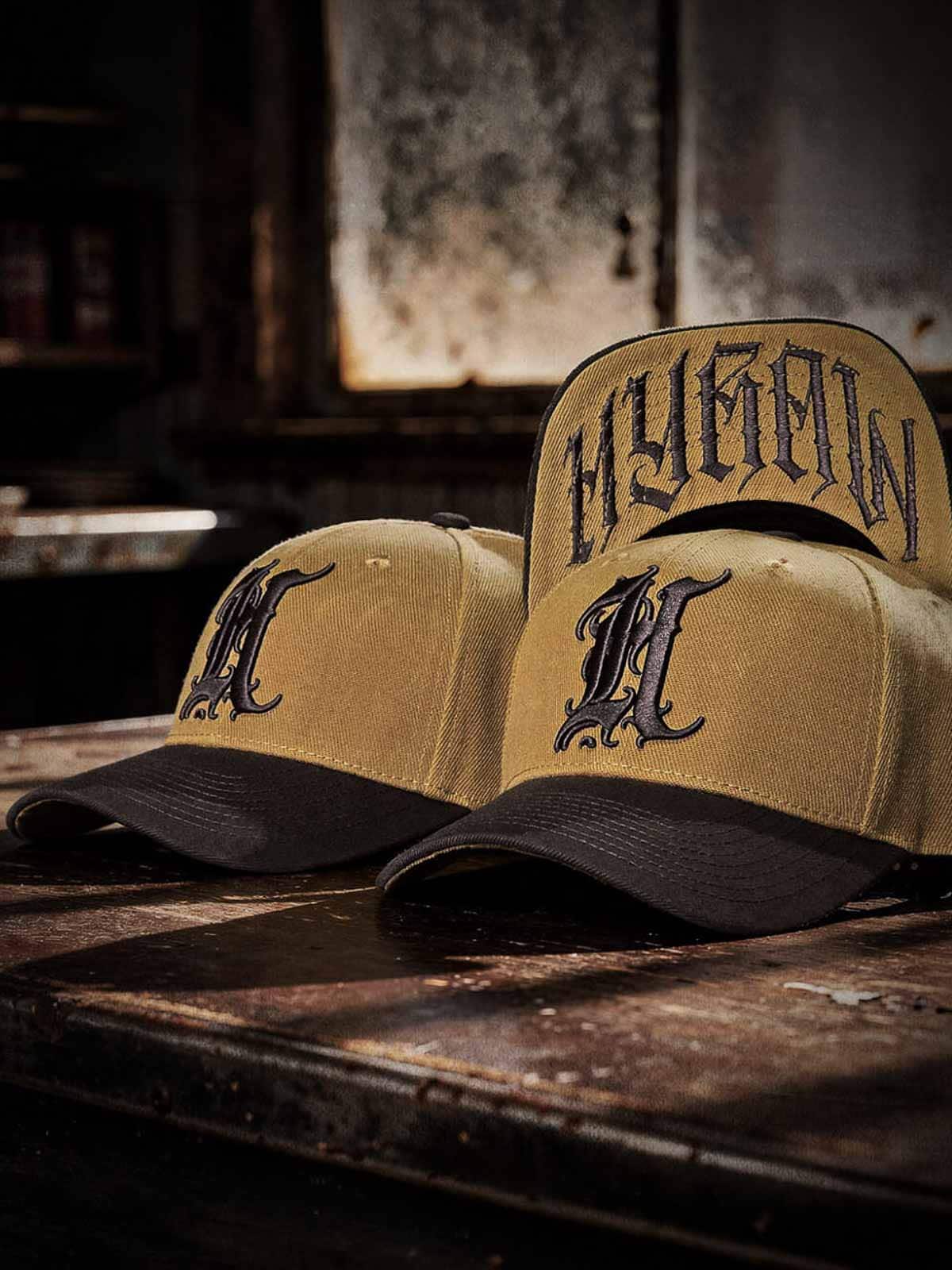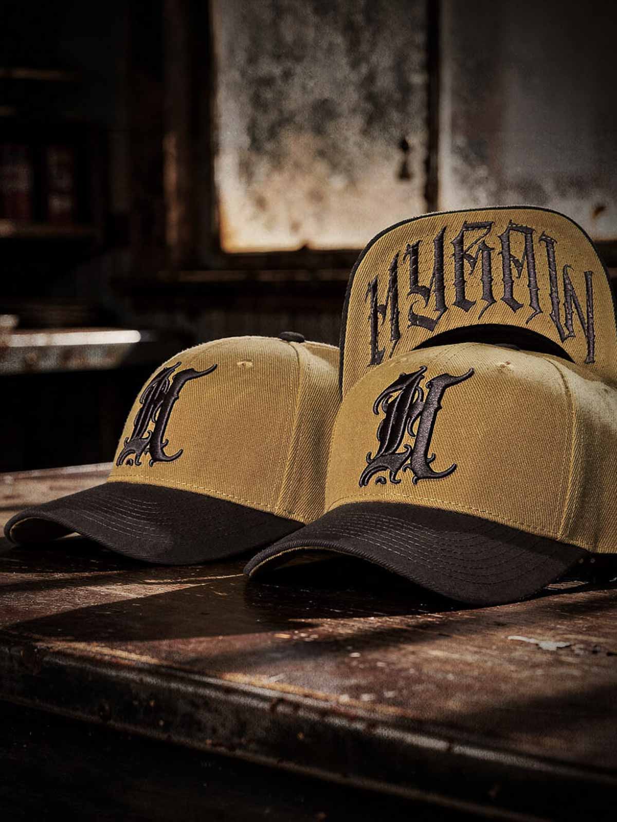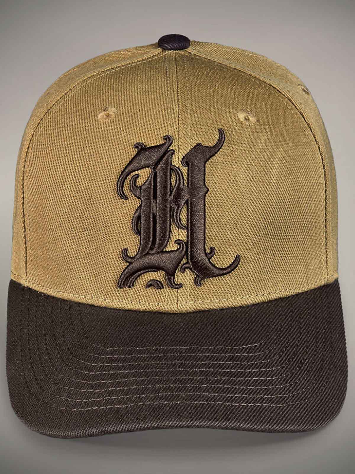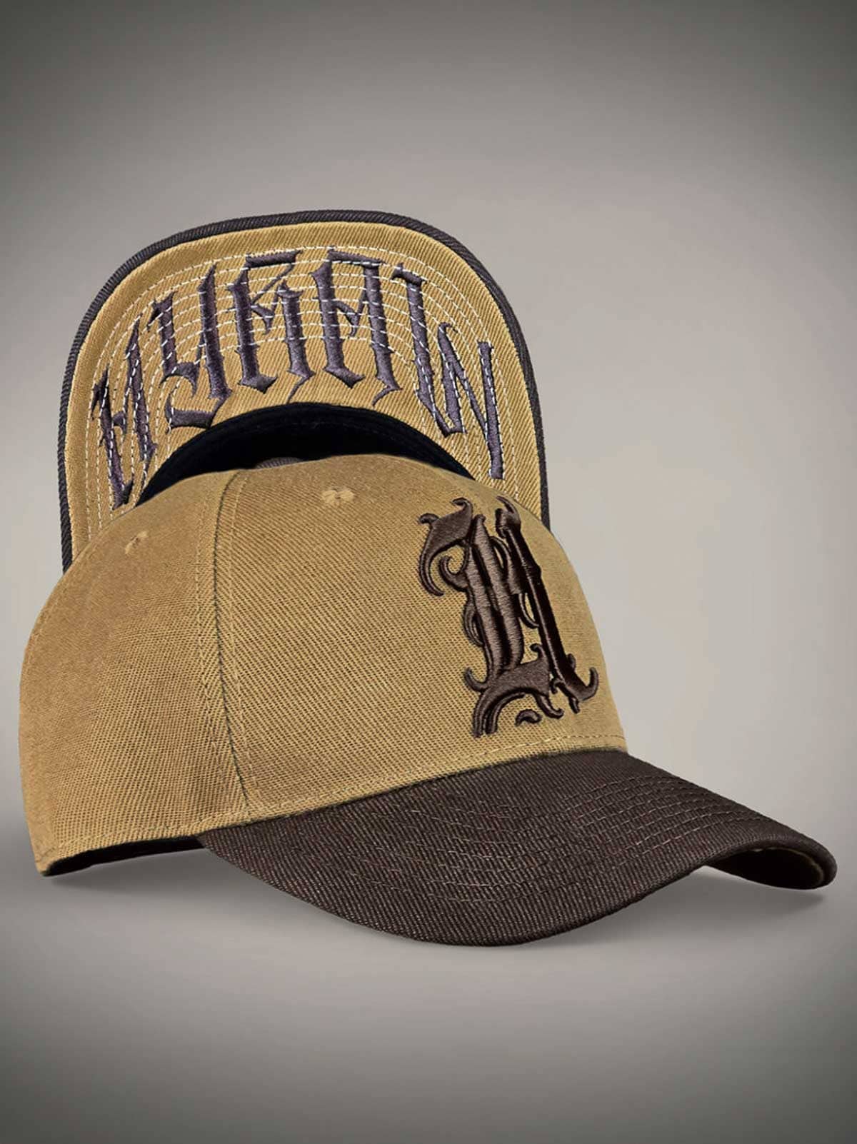 Camelfärgad keps med böjd brun skärm, dekorerad med broderad logga framtill. Undersidan av skärmen pryds av en brun, skräddad logga, och kepsen har justerbar snapback för en bekväm passform.