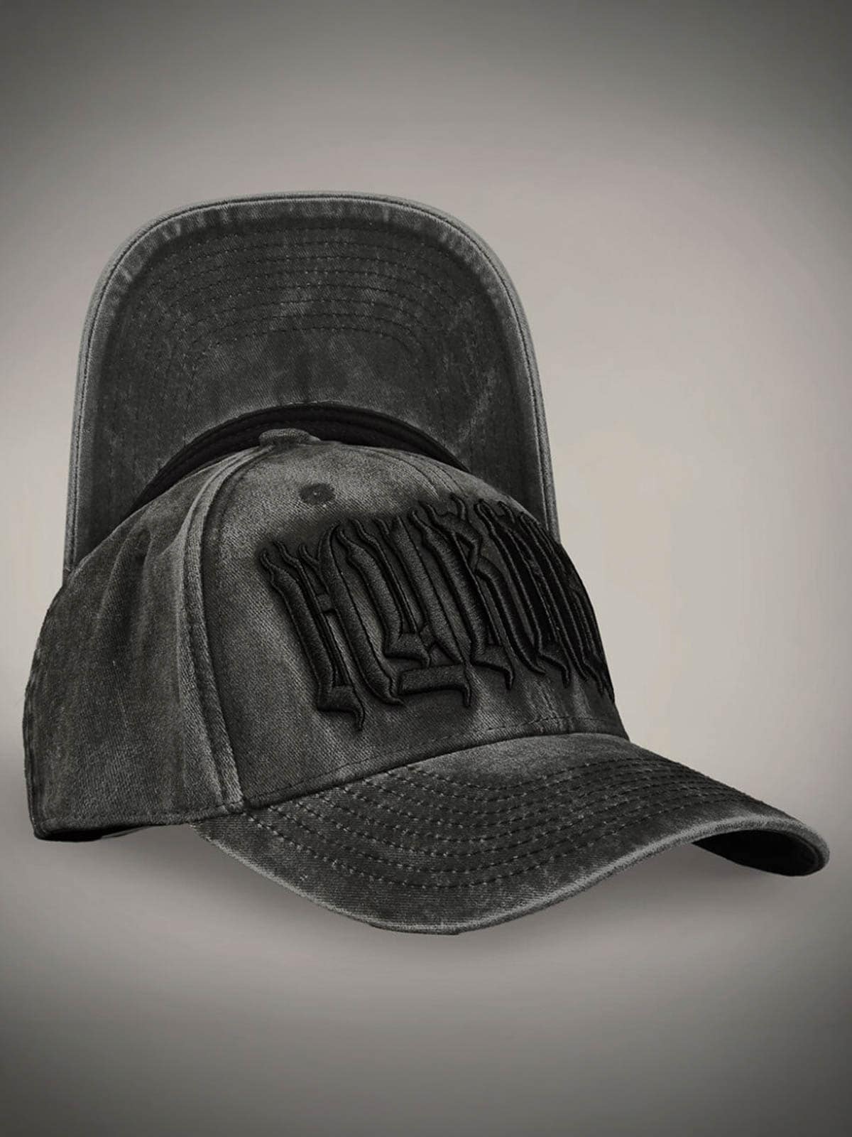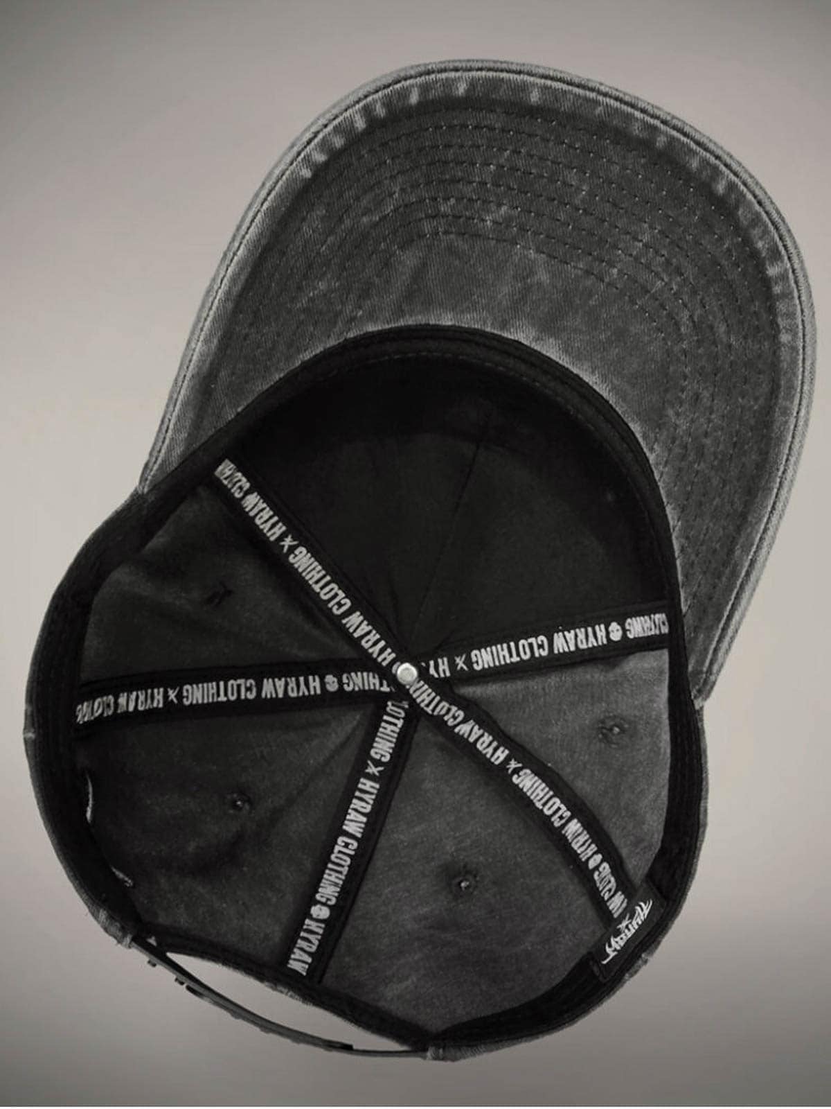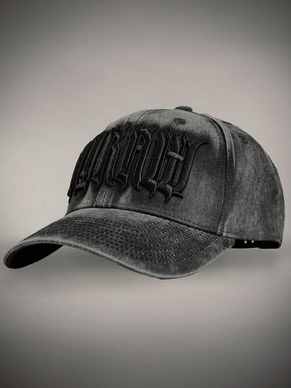 Mörkgrå keps designad med broderad logga framtill. Den har böjd skärm och snapback.