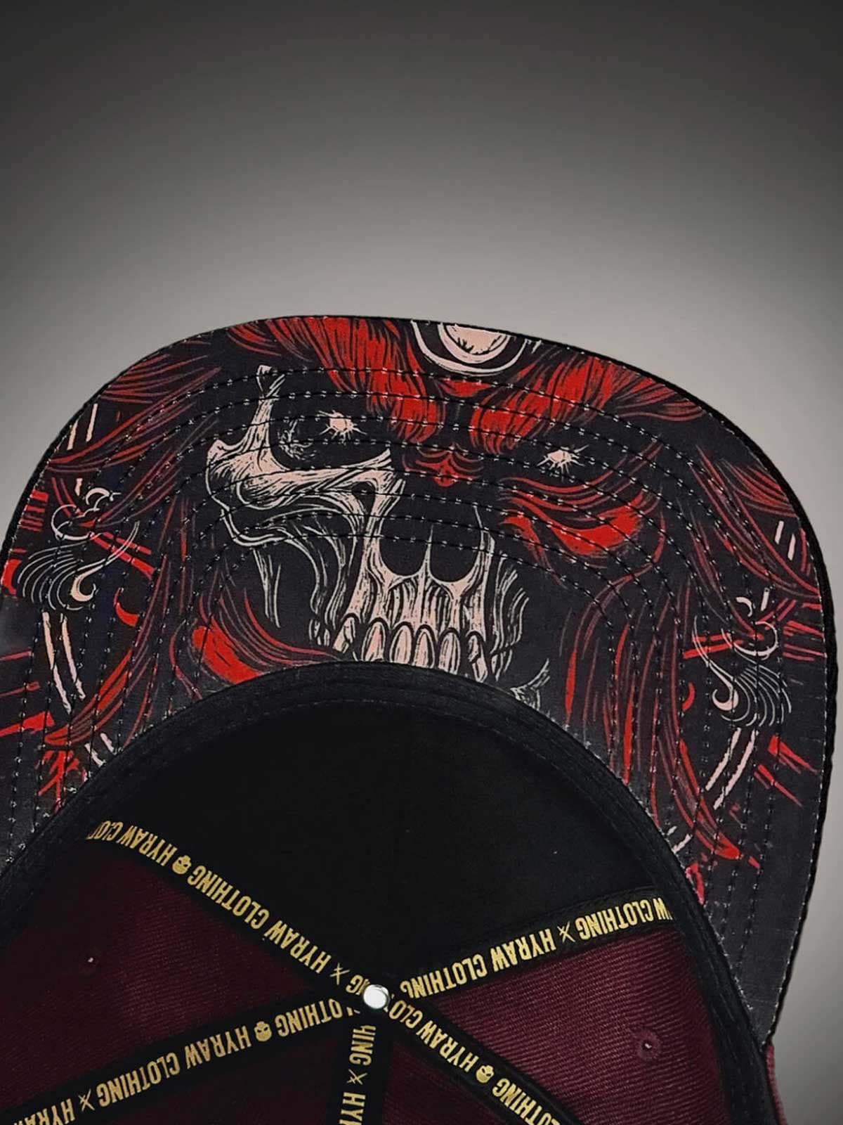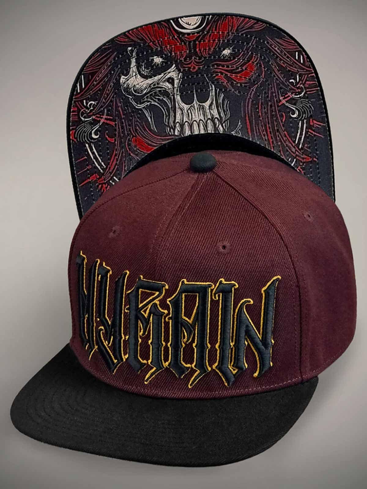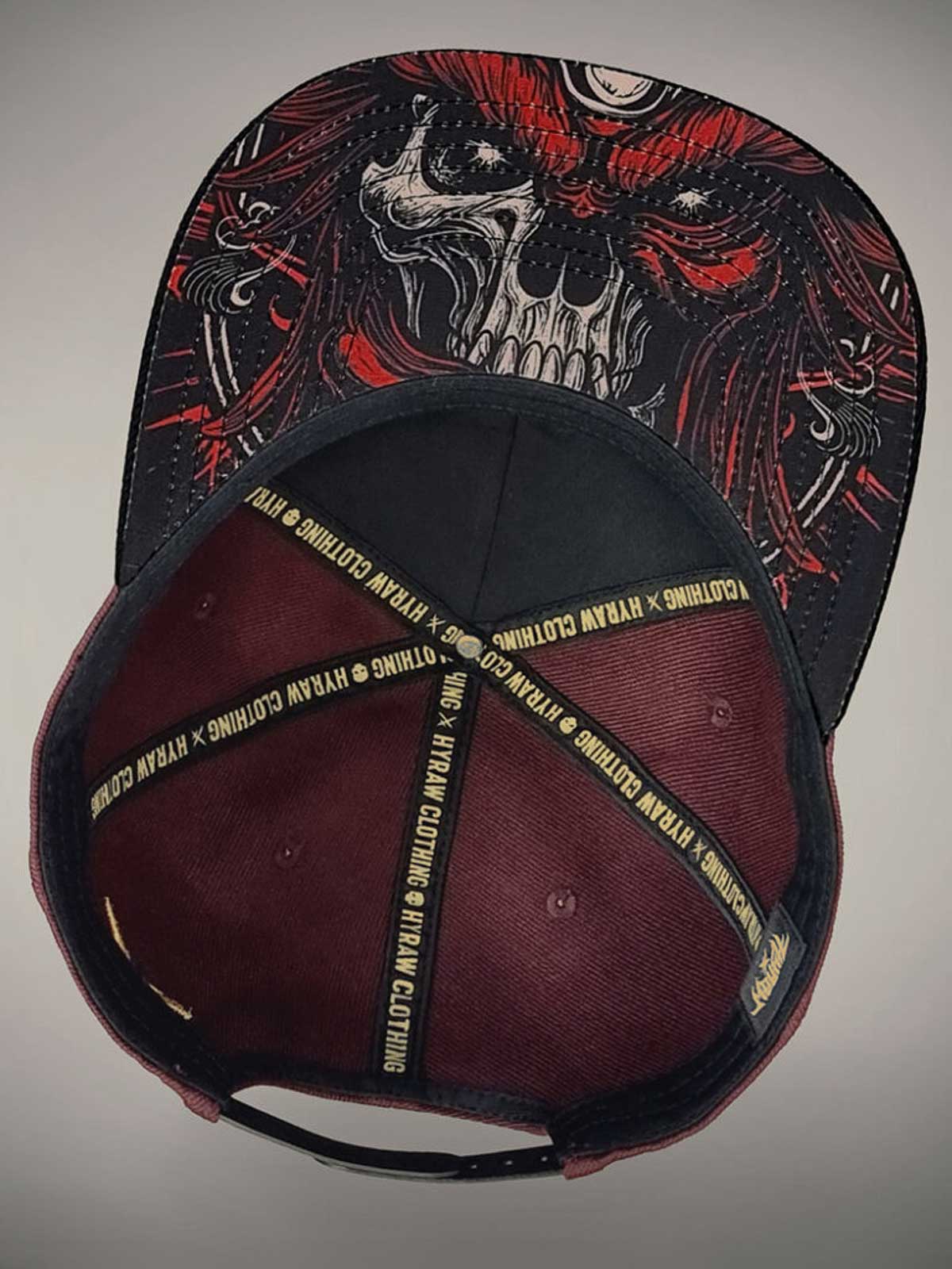 Vinröd keps med rak skärm, dekorerad med en skräddad logga i svart och gult framtill samt ett broderat gult motiv baktill. Undersidan av skärmen är designad med ett unikt motiv, vilket ger kepsen en extra iögonfallande detalj.