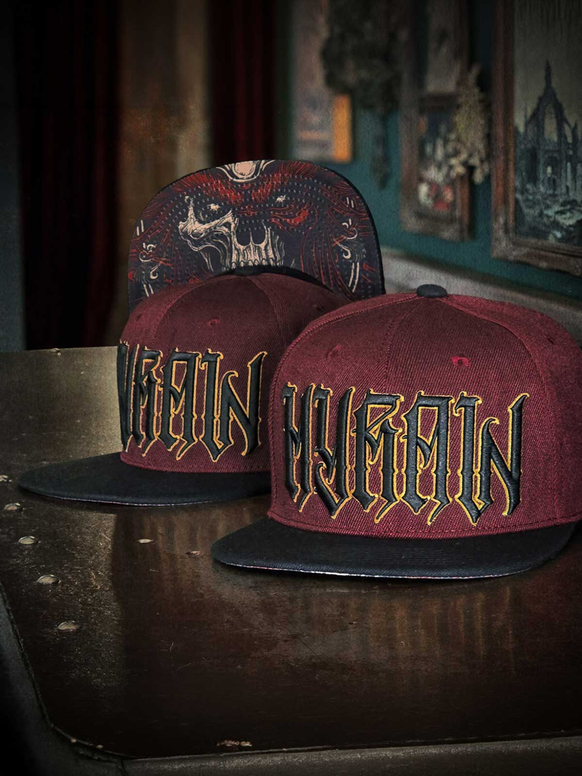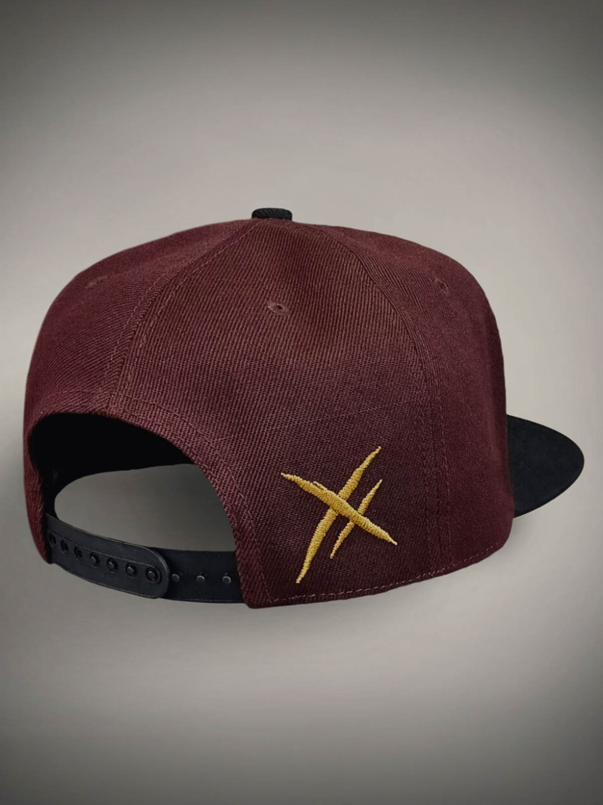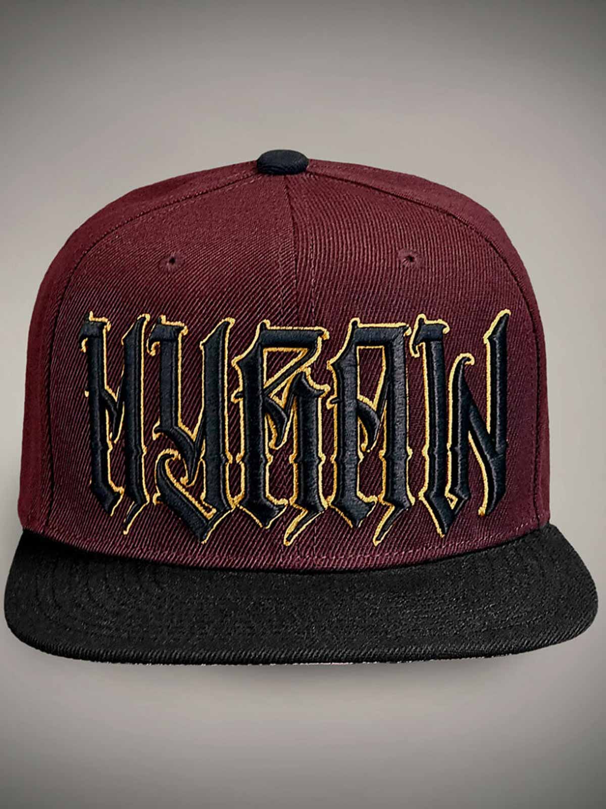 Vinröd keps med rak skärm, dekorerad med en skräddad logga i svart och gult framtill samt ett broderat gult motiv baktill. Undersidan av skärmen är designad med ett unikt motiv, vilket ger kepsen en extra iögonfallande detalj.