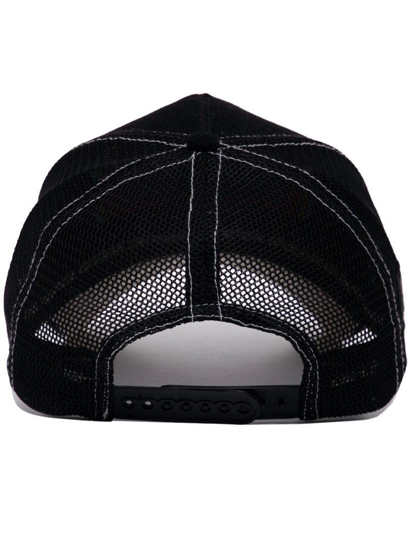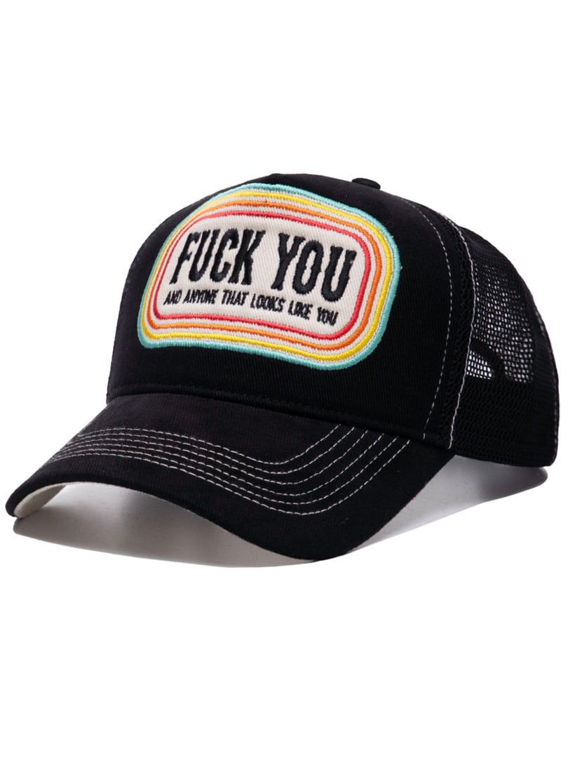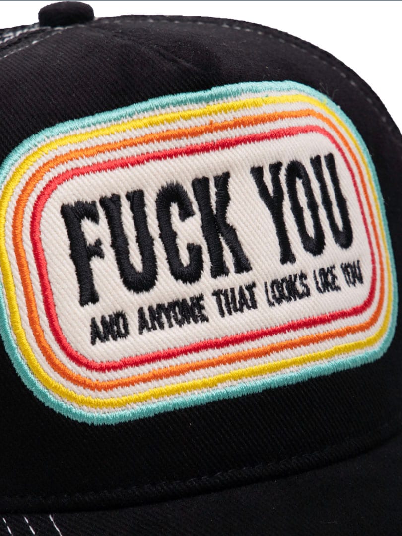 Svart keps med ett tufft skräddarsytt “fuck you”-tryck framtill. Den har sömmar i kontrastfärg, mesh baktill och böjd skärm.
