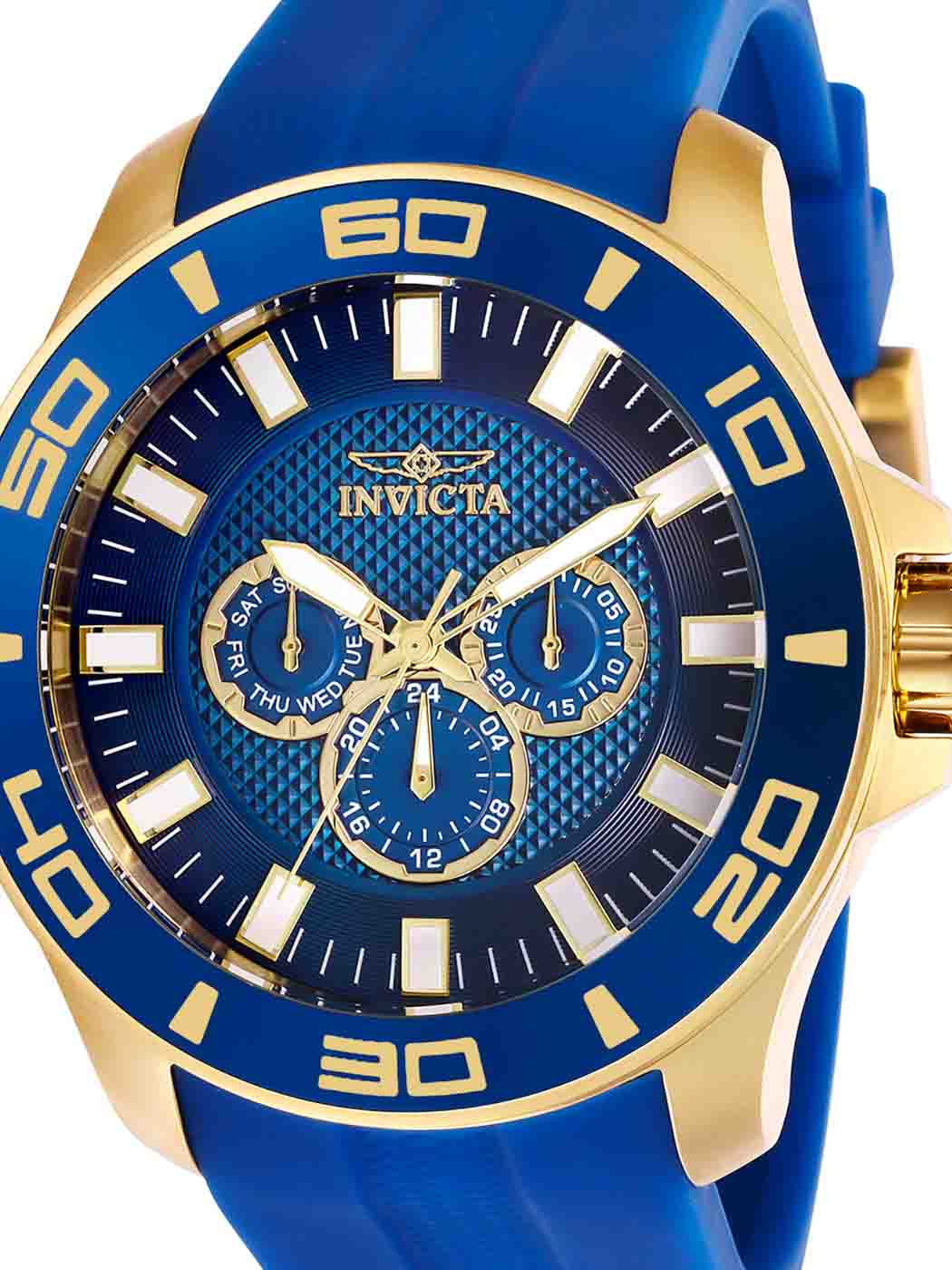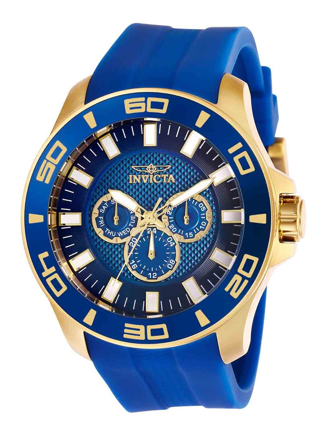 Sportig klocka med guldfärgade detaljer och silikonarmband för optimal komfort. Den har extra reptåligt glas och drivs av ett exakt quartzverk. Tre subdials som visar veckodag, datum och 24-timmarsvisning. Vattentålig upp till 100 meter.