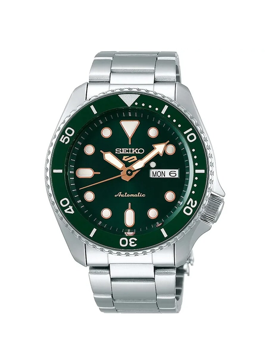 Seiko 5 Sports SRPD63K1 är en exklusiv herrklocka som utmärker sig med sin djupt gröna urtavla och eleganta visare i roséguld. Klockan drivs av ett automatiskt urverk som laddas upp av dina rörelser, vilket innebär att inget batteribyte behövs. Den robusta boetten och länken i rostfritt stål kompletteras av ett tåligt Hardlex-glas och en tydlig dag- och datumvisning. Med en vattentäthet på 100 meter är denna modell konstruerad för att klara både vardagens utmaningar och sportiga aktiviteter. En perfekt kombination av sportig funktionalitet och sofistikerad stil för den moderna mannen.