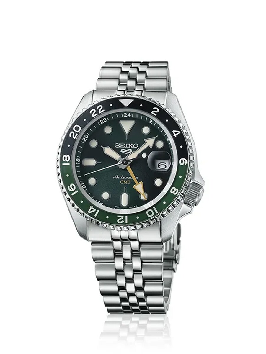 Seiko 5 Sports SSK035K1 är en elegant automatisk GMT-klocka som låter dig hålla koll på två tidszoner samtidigt, perfekt för den moderna resenären. Den har en iögonfallande grön urtavla med sunburst-effekt och en tvåfärgad vridbar ring i svart och grönt. Klockan bärs på en bekväm femradig länk i rostfritt stål och skyddas av ett reptåligt Hardlex-glas med datumförstoring. Det automatiska urverket laddas upp av dina rörelser och kan beundras genom den öppna baksidan. Med 100 meters vattentäthet kombinerar denna modell sportig hållbarhet med tidlös stil och funktionalitet.