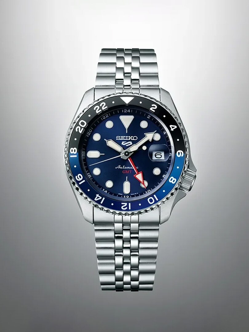 Seiko 5 Sports GMT SSK003K1 är en funktionell automatisk klocka utrustad med en praktisk GMT-visare för visning av en andra tidszon. Den eleganta blå urtavlan med sunburst-effekt matchas av en vridring i svart och blått samt skyddas av ett tåligt Hardlex-glas med förstoringslins. Klockan har en robust boett i rostfritt stål och en bekväm femradig länk som ger en sofistikerad känsla. Med tydliga självlysande index och en genomskinlig baksida som visar urverket kombinerar den stil med mekanisk precision. Tack vare 100 meters vattentäthet är modellen en utmärkt följeslagare för både resor och vardag.