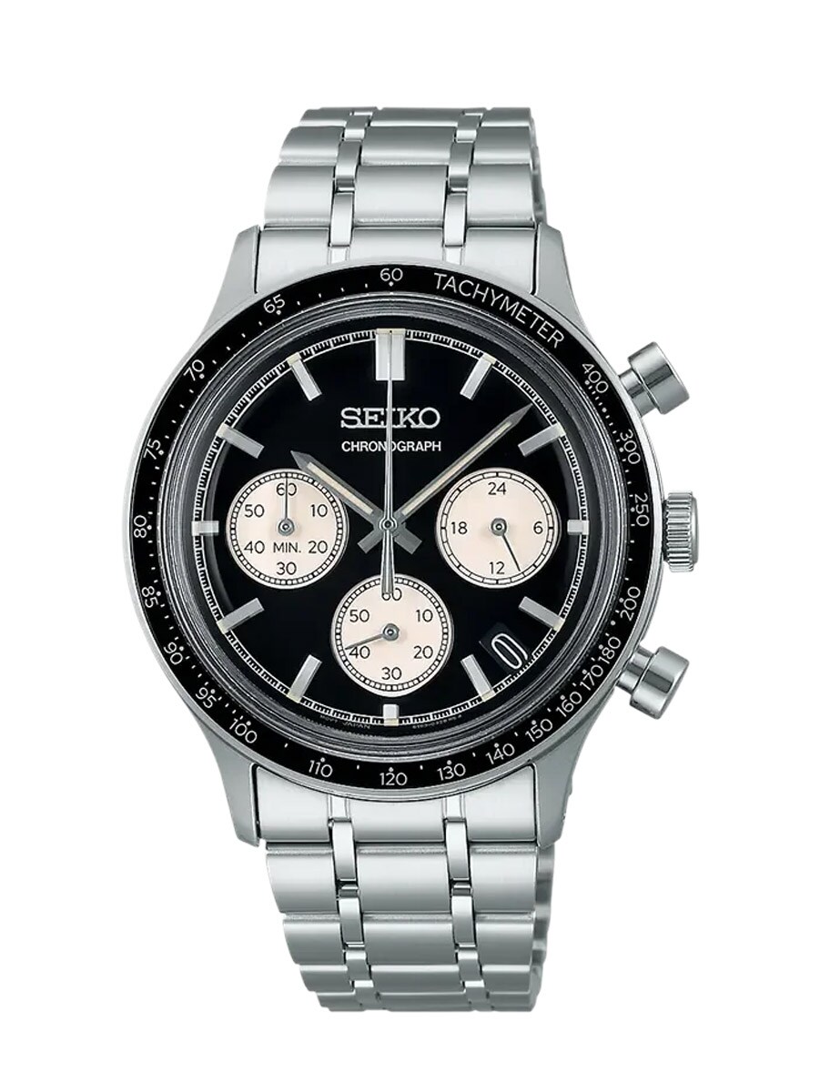 Seiko Chronograph SSB479P1 är en stilren herrklocka som kombinerar en sportig "Reverse Panda"-design med klassisk elegans. Den svarta urtavlan kontrasteras snyggt av beige undertavlor, silverfärgade index och en tachymeter-ring. Klockan har en robust boett och länk i rostfritt stål samt praktisk datumvisning och tidtagningsfunktion. Med 100 meters vattentäthet och ett tåligt mineralglas är modellen både funktionell och hållbar för vardagsbruk.