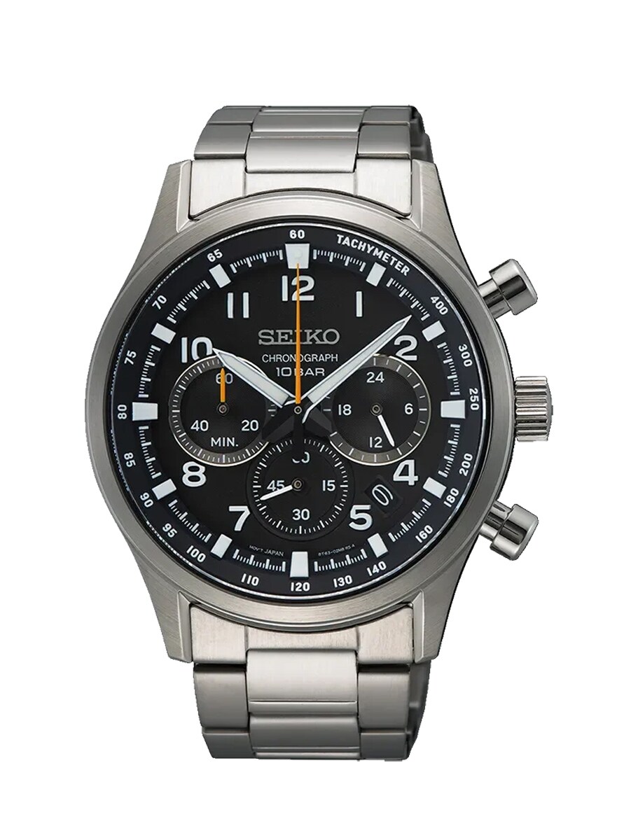 Seiko Chronograph SSB447P1 är en sportig och funktionell herrklocka som kombinerar precision med en dynamisk design. Den svarta urtavlan har tydliga markeringar och visare med iögonfallande orangea detaljer som ger en modern karaktär. Klockan är utrustad med avancerad tidtagning, en tachymeterskala samt datumvisning diskret placerad mellan klockan 4 och 5. Med 10 bar vattentäthet och en robust konstruktion är modellen redo för både vardagliga utmaningar och aktiviteter. Ett utmärkt val för mannen som värdesätter pålitlighet och en stark visuell stil.