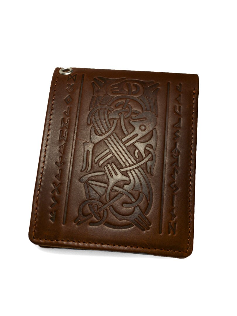 En robust och stilfull plånbok i äkta läder, dekorerad med präglade vikingamotiv som ger ett kraftfullt och unikt uttryck. Den har fack för kort, sedlar, mynt och ID. Levereras med en avtagbar kedja som enkelt fästs i byxorna - perfekt för dig som vill ha både säkerhet och stil. En accessoar med nordisk attityd och gediget hantverk.