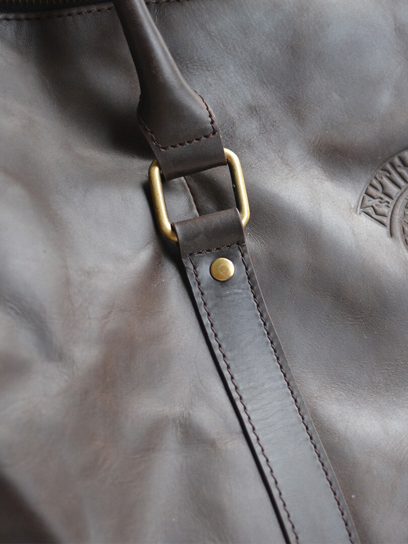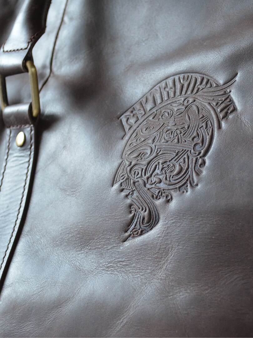 En rymlig och elegant duffelväska i högkvalitativt läder. Den kombinerar praktisk funktion med ett präglat vikingamotiv som ger väskan en unik karaktär. Perfekt för resor, träning eller när du behöver en stilfull väska med gott om utrymme. Bärs bekvämt med både handtag och justerbar axelrem.