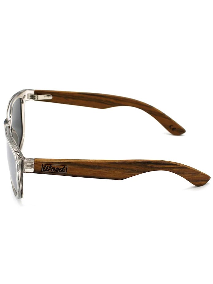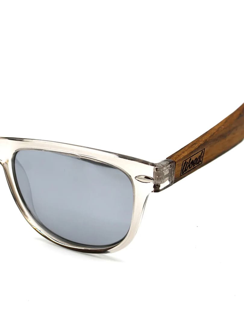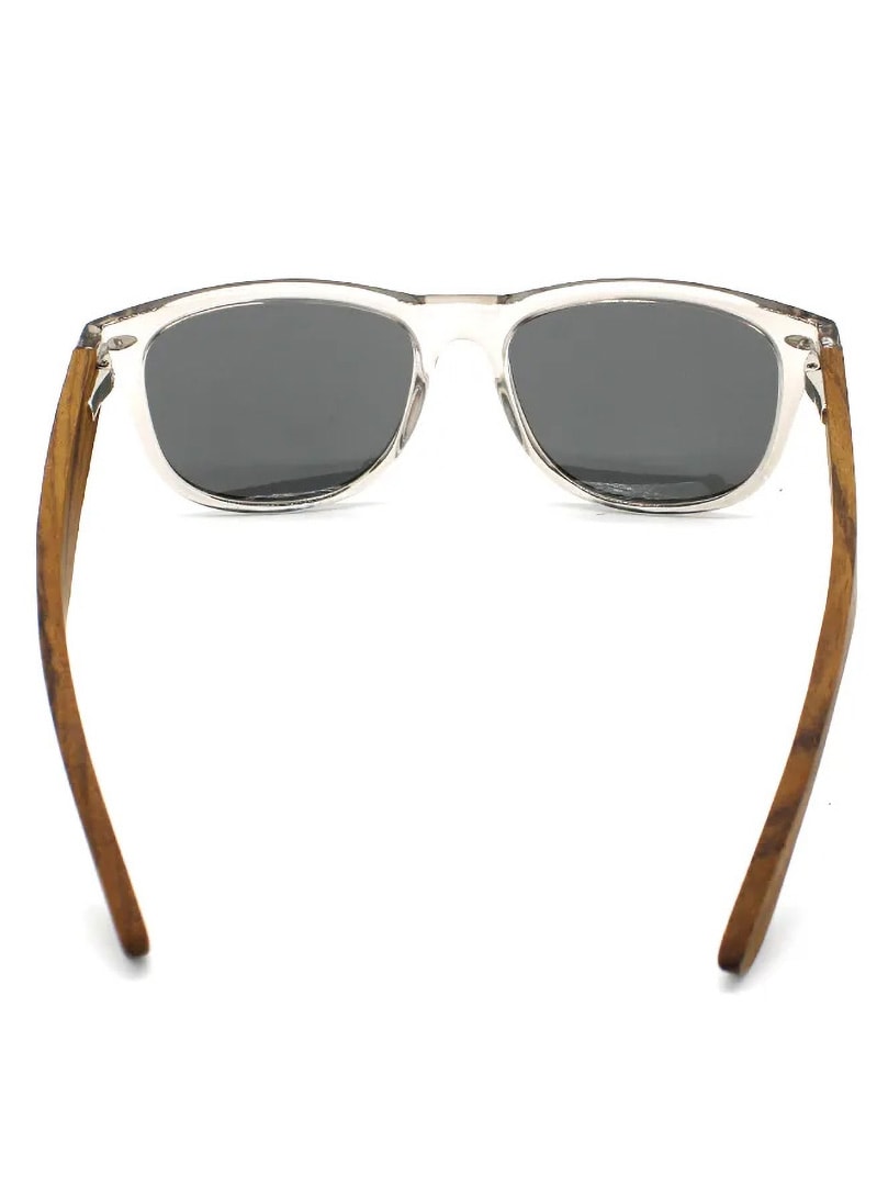 Solglasögon i wayfarer-modell med en transparent båge och skalmar i äkta trä. Glasögonen är utrustade med UV400-polariserade linser som skyddar mot solen och minskar störande reflexer. Levereras med putsduk och praktisk förvaringspåse.