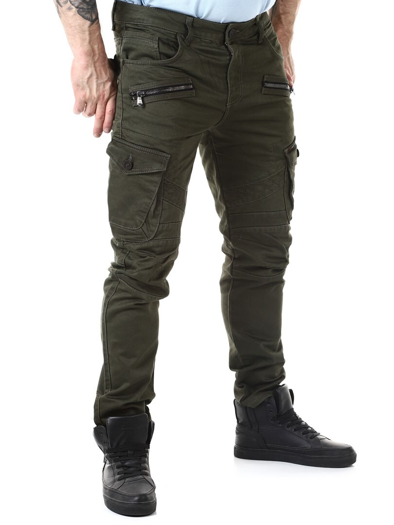 Mörkgrön bas med blixtlåsdetaljer och dödskalleknappar i matt metall. Skarpa, symmetriska detaljer på benen. Två sidfickor, två fickor på låren och två bakfickor. Bra passform i behaglig bomullsmix.