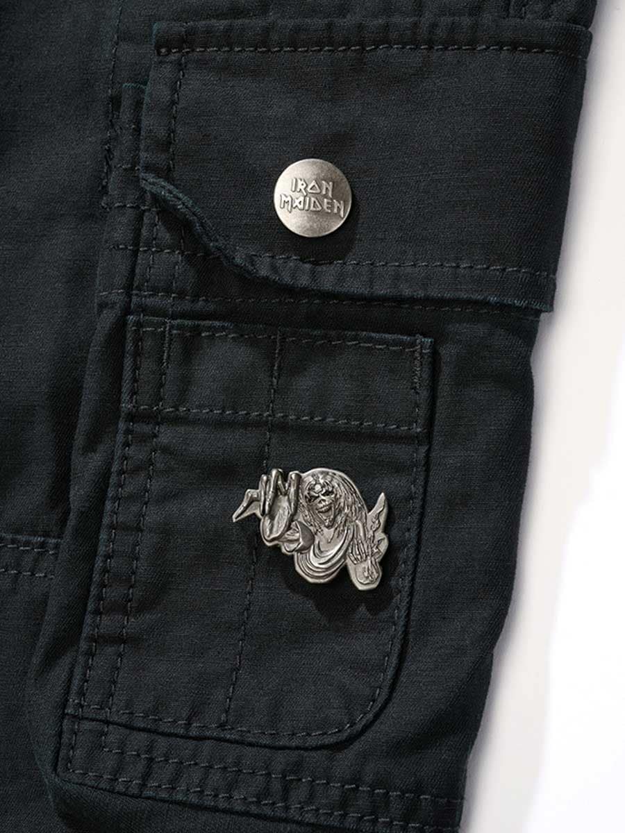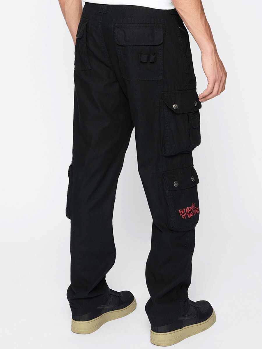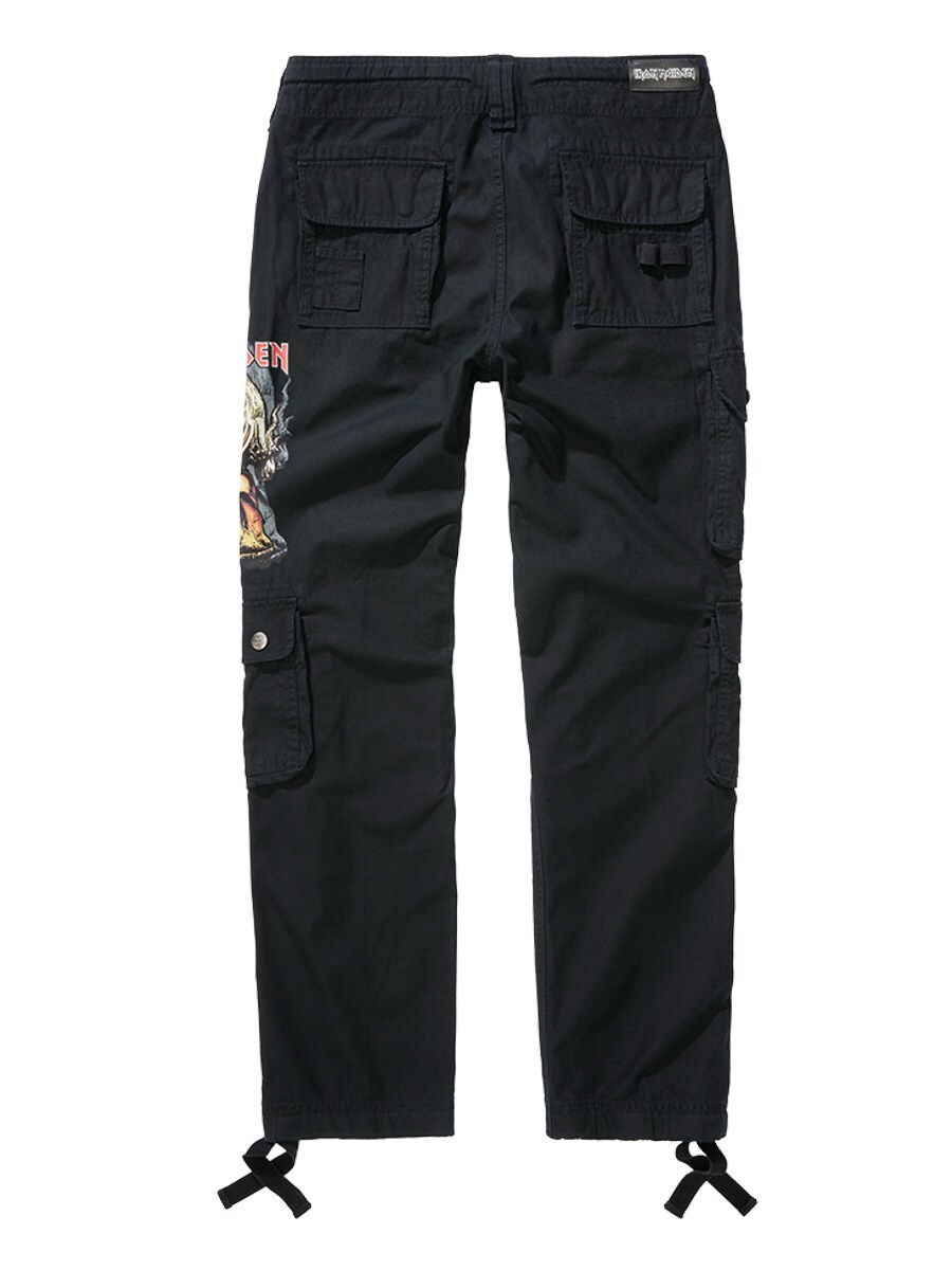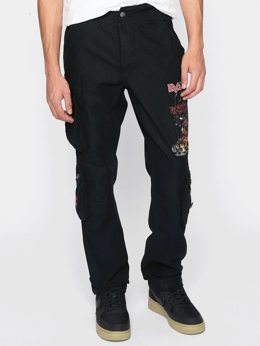Svarta byxor med slim fit-passform och robust, hudvänligt bomullsmaterial som ger både komfort och slitstyrka. Designad med Justerbara tygremmar i midjan och bensluten gör det enkelt att anpassa passformen efter behov. Designade med ett stort Iron Maiden-tryck längs vänster ben samt ett ”Number of the Beast”-tryck på höger benficka. En tydlig hyllning till det ikoniska heavy metal-bandet Iron Maiden.