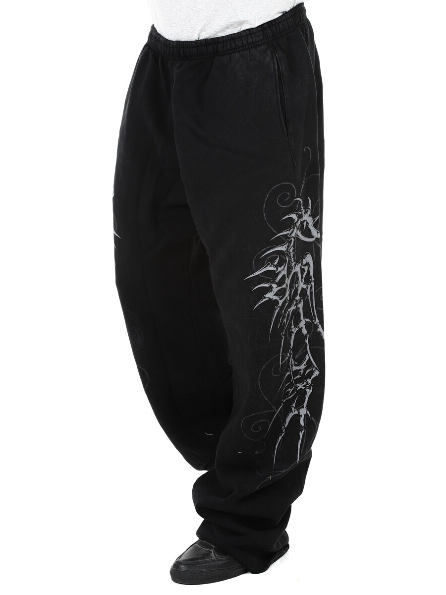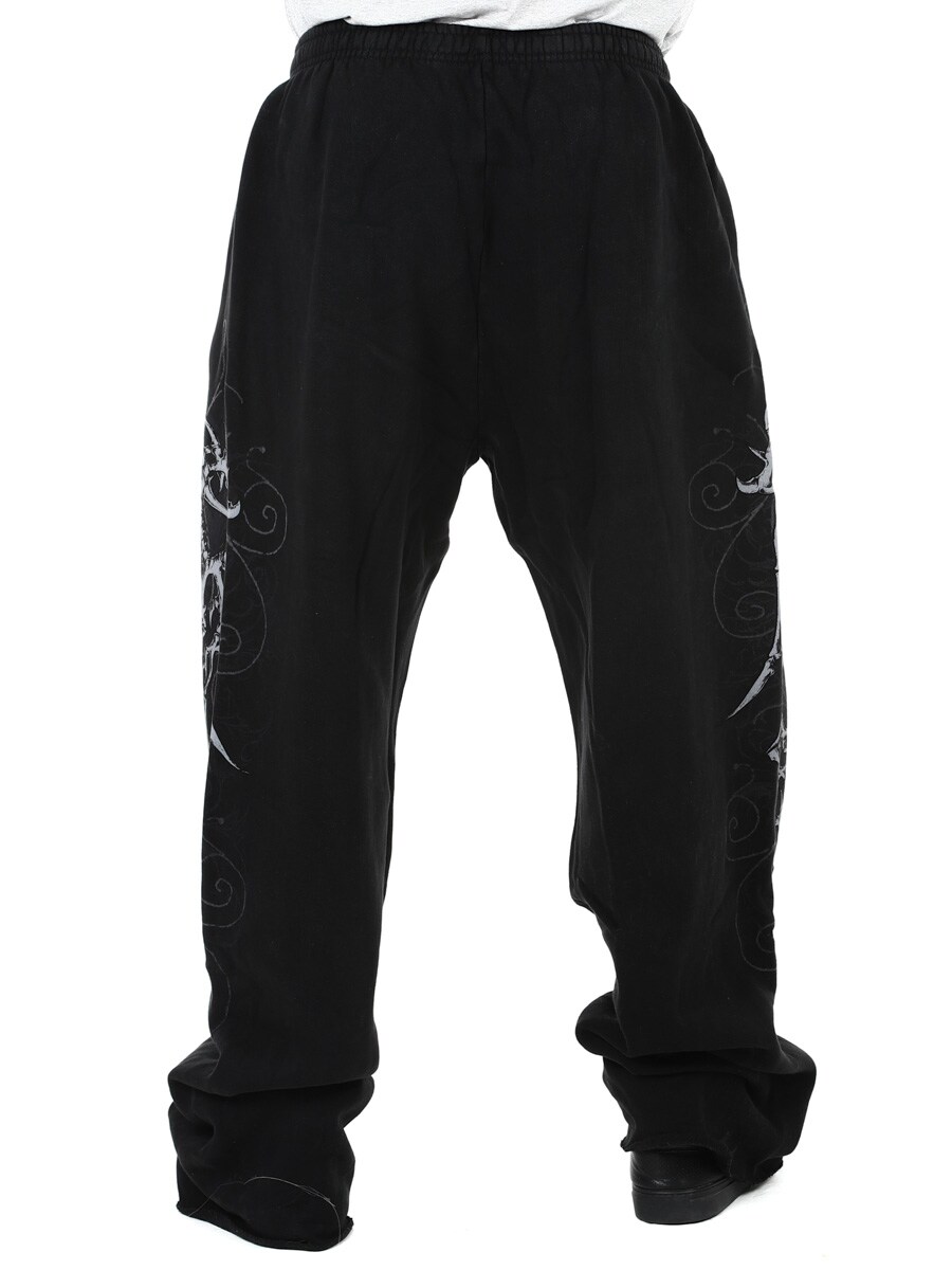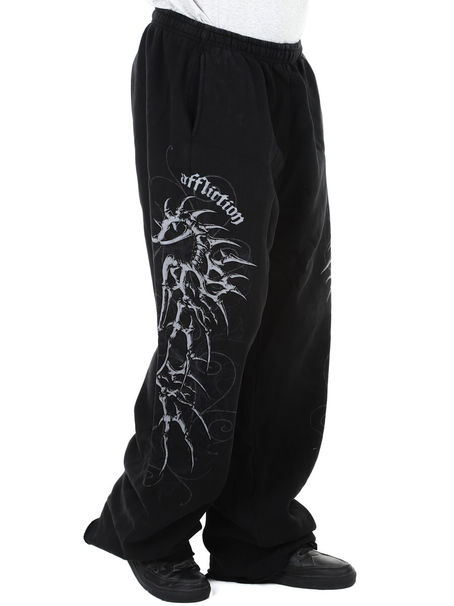 Ett par mjuka och bekväma sweatpants med rejäl attityd. Den svarta, tvättade basen kombineras med stora grafiska tryck längs benen som ger byxorna ett unikt uttryck. Den elastiska linningen pryds med Affliction-loggan och har dragsko för justerbar passform. Vida ben skapar en avslappnad silhuett som passar perfekt till vardags med en rockinspirerad stil.