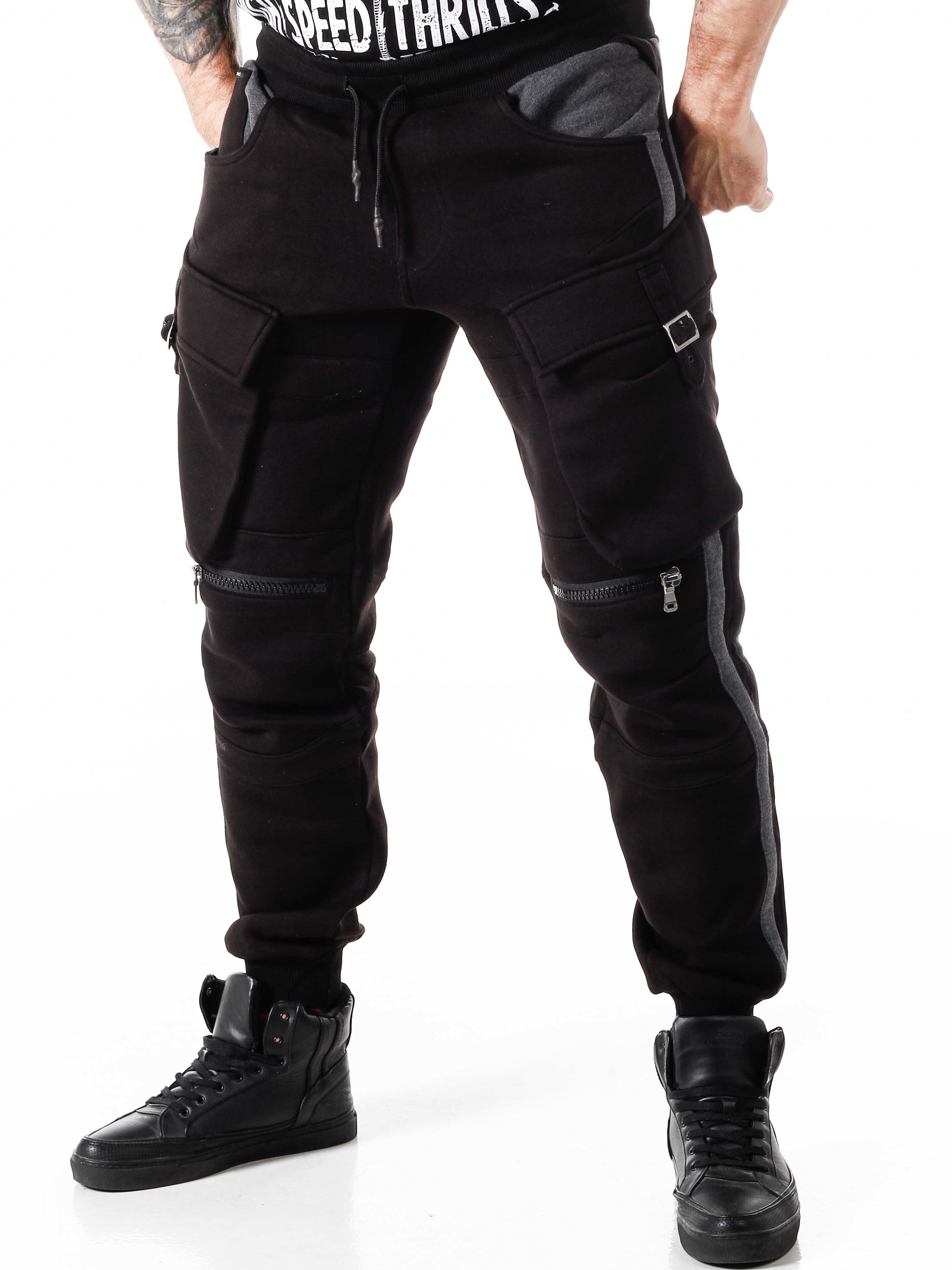 Byxor i ledig modell med revärer i kontrastfärg. Två fickor fram, två baktill och två på benen. Detaljerade med dragkedjor på knän.