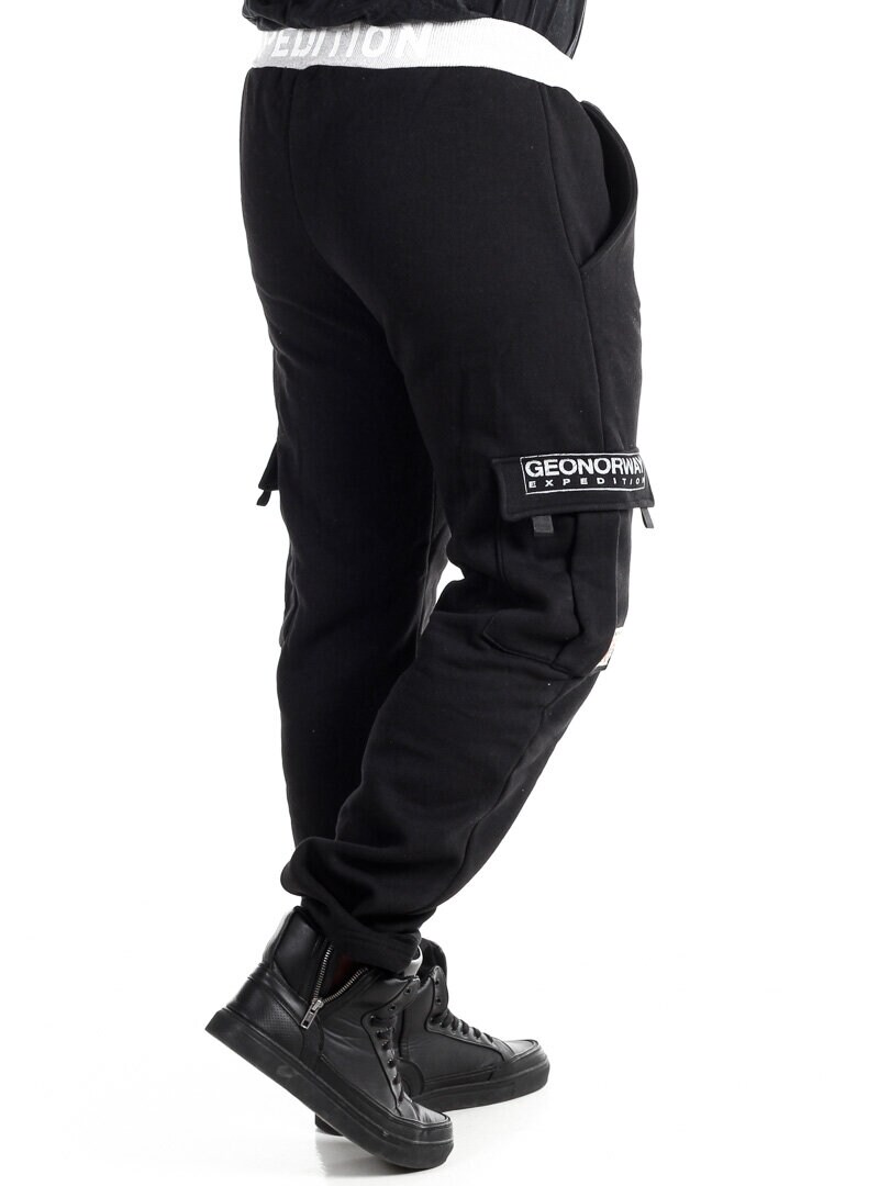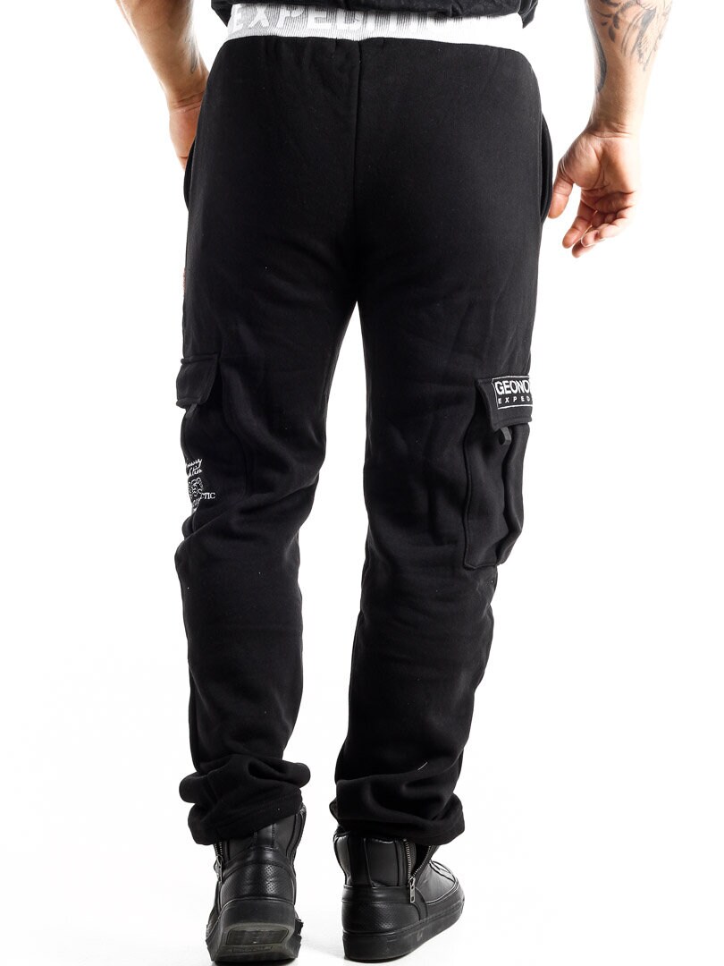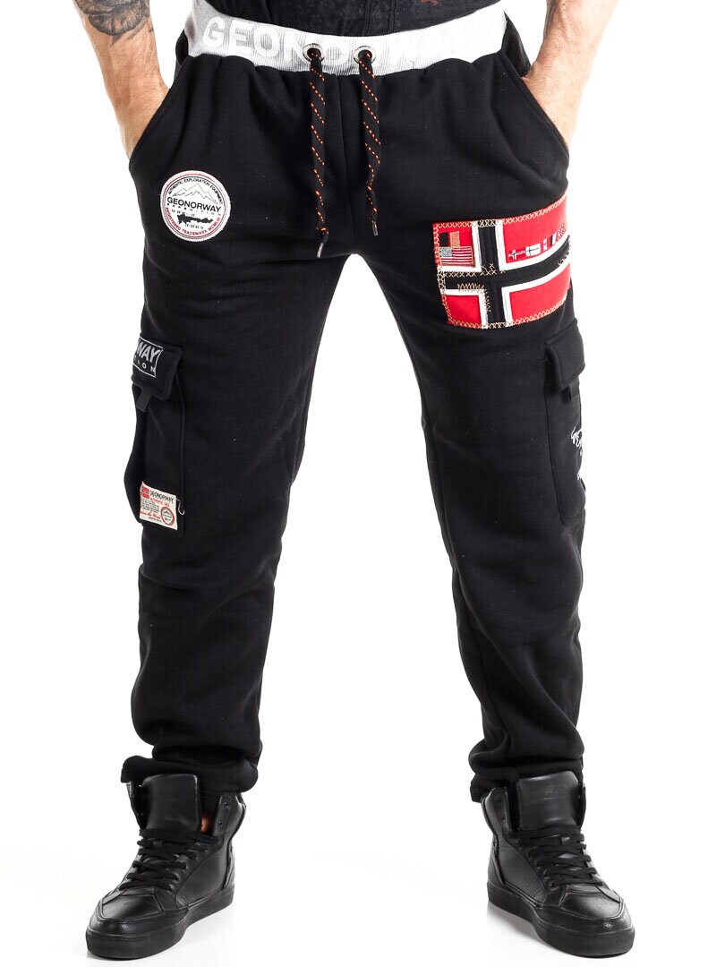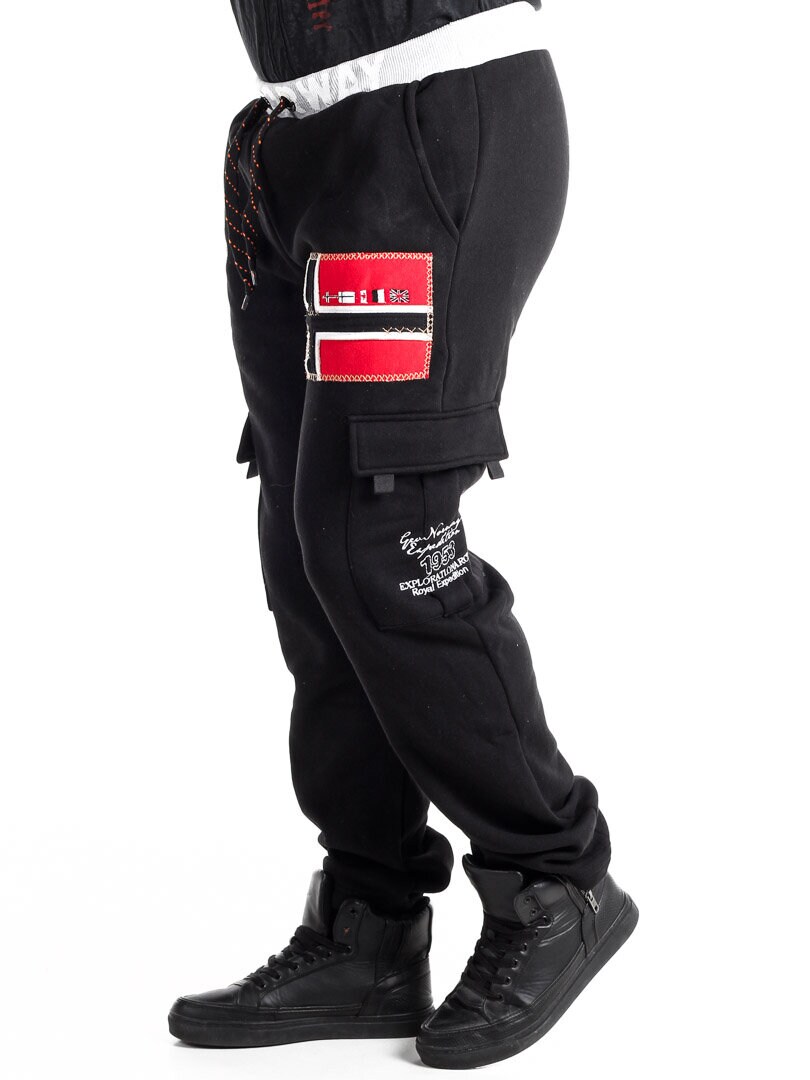 Unika mjukisbyxor med textprints och broderade flaggpatches. De har två öppna framfickor och två sidofickor med kardborre. Designade med raka ben, borstad insida och ribbad mudd med snörning i midjan.