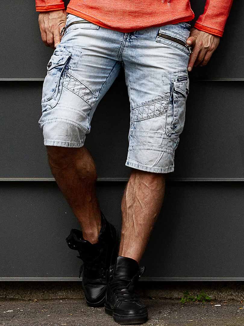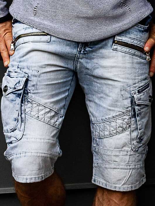 Grymma ljusblå shorts i något strechigt material. Knälång modell med dragkedjor framtill på låret, endast som detalj. Två bakfickor med knäppning.