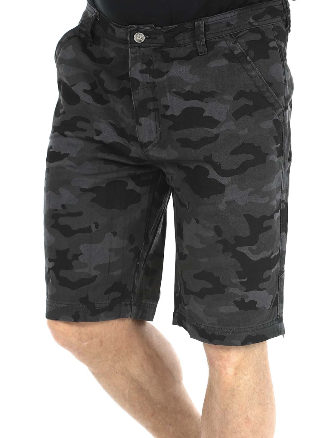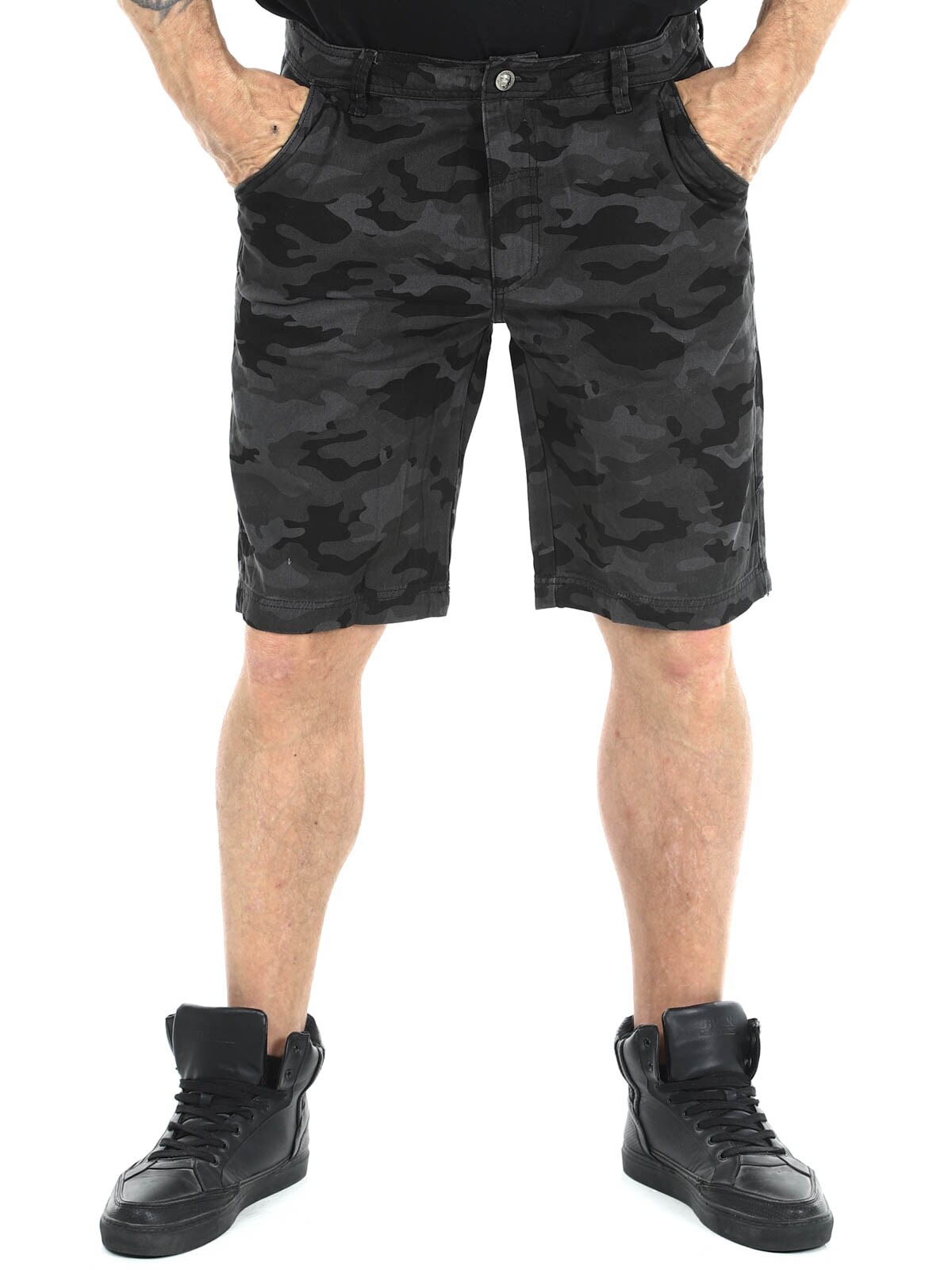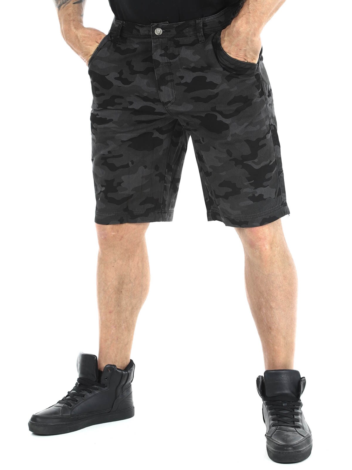 Shorts i denim material med camo mönster. De har fyra fickor samt bälteshällor i midjan. Silvriga knappar med dödskalle motiv för extra attityd.