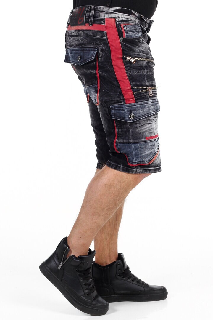 Stretchiga jeansshorts i en urtvättad svart nyans med röda effekter och grova dragkedjor. De har cargofickor på sidorna och stängbara fickor bak och tre öppna fram. Stor patch med loggan i svart skinnimitation sitter i linningen baktill.